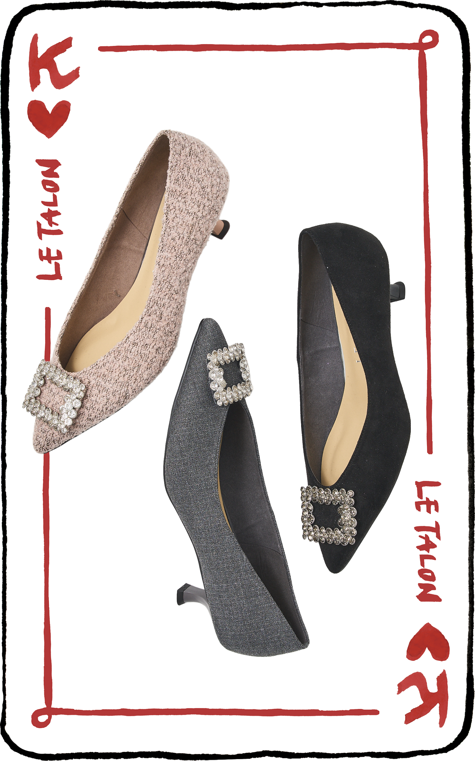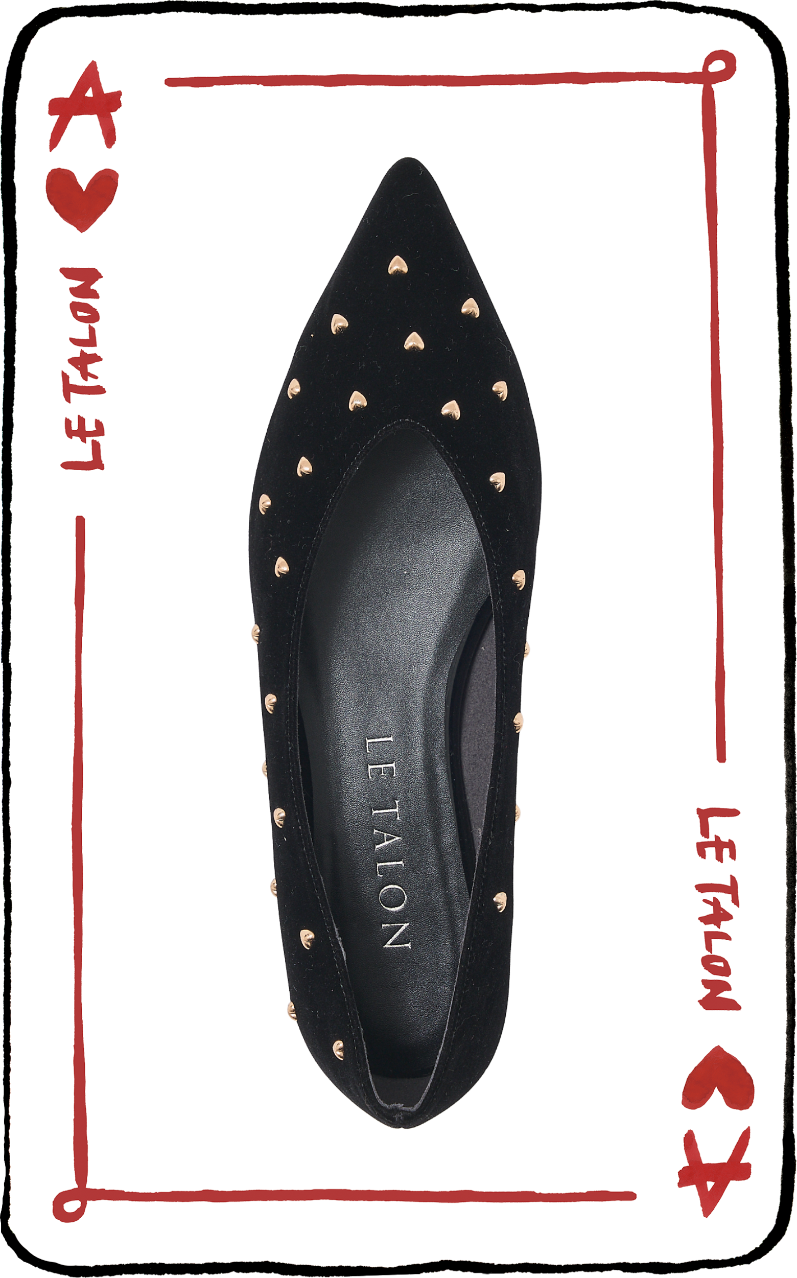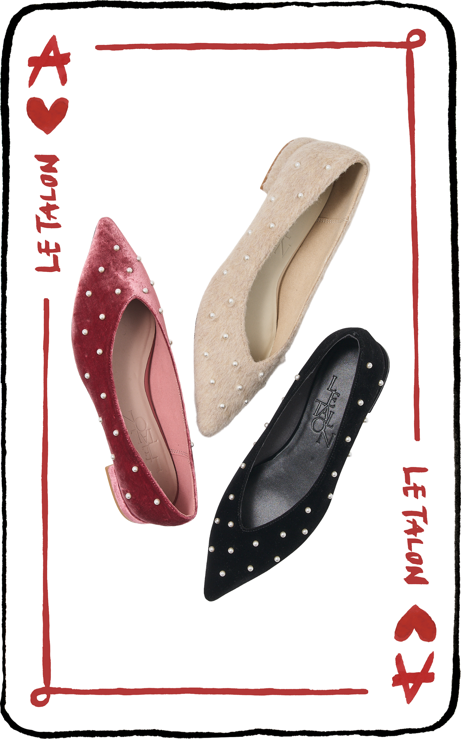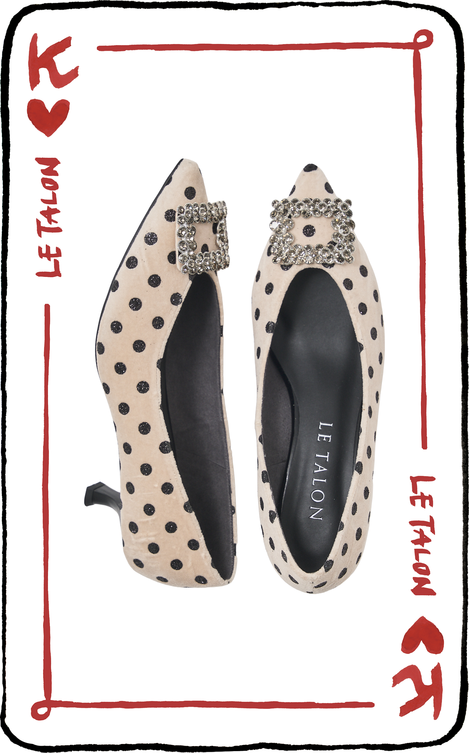 ドットとビジューのコンビネーションが視線を奪う主役級パンプス。シンプルな装いでさえ、ぐっとドラマティックに。