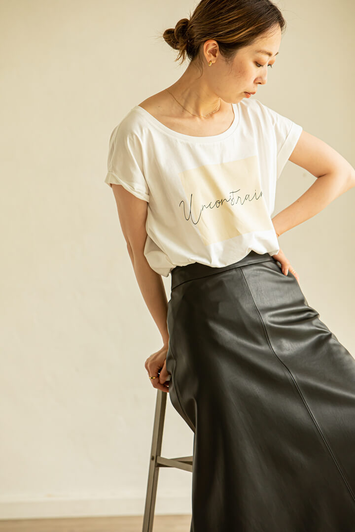 ハンドレタータッチの表情あるロゴTに合わせたのは、なめらかなレザー調のフレアスカート。