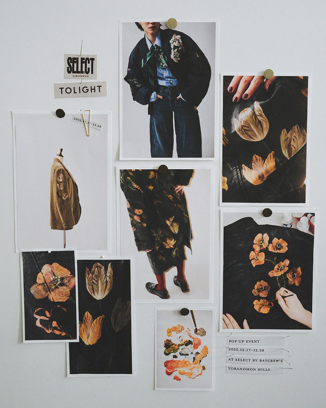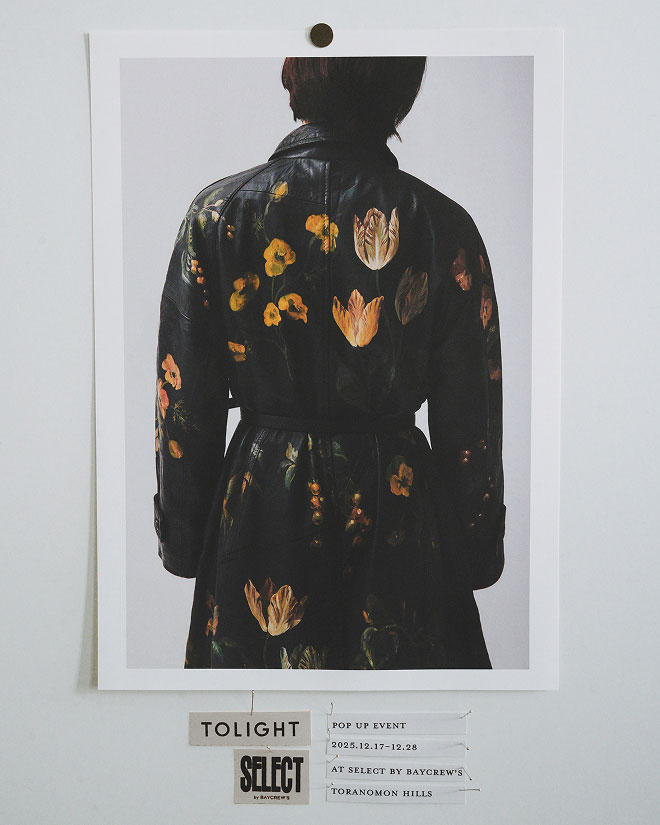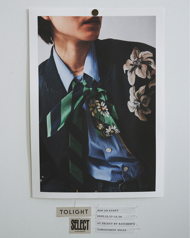 TOLIGHTは2017年に青山明生さんが設立したブランド。 2018年より春夏コレクションよりスタート。 TOLIGHTのブランド名はTRY(挑戦)LIGHT(光輝)が由来。 明るい方へと向かう挑戦し続けるという意味を込めています。 絵を描くように自由にコンセプトとし、デザイナー自身の描く絵からコレクションを展開