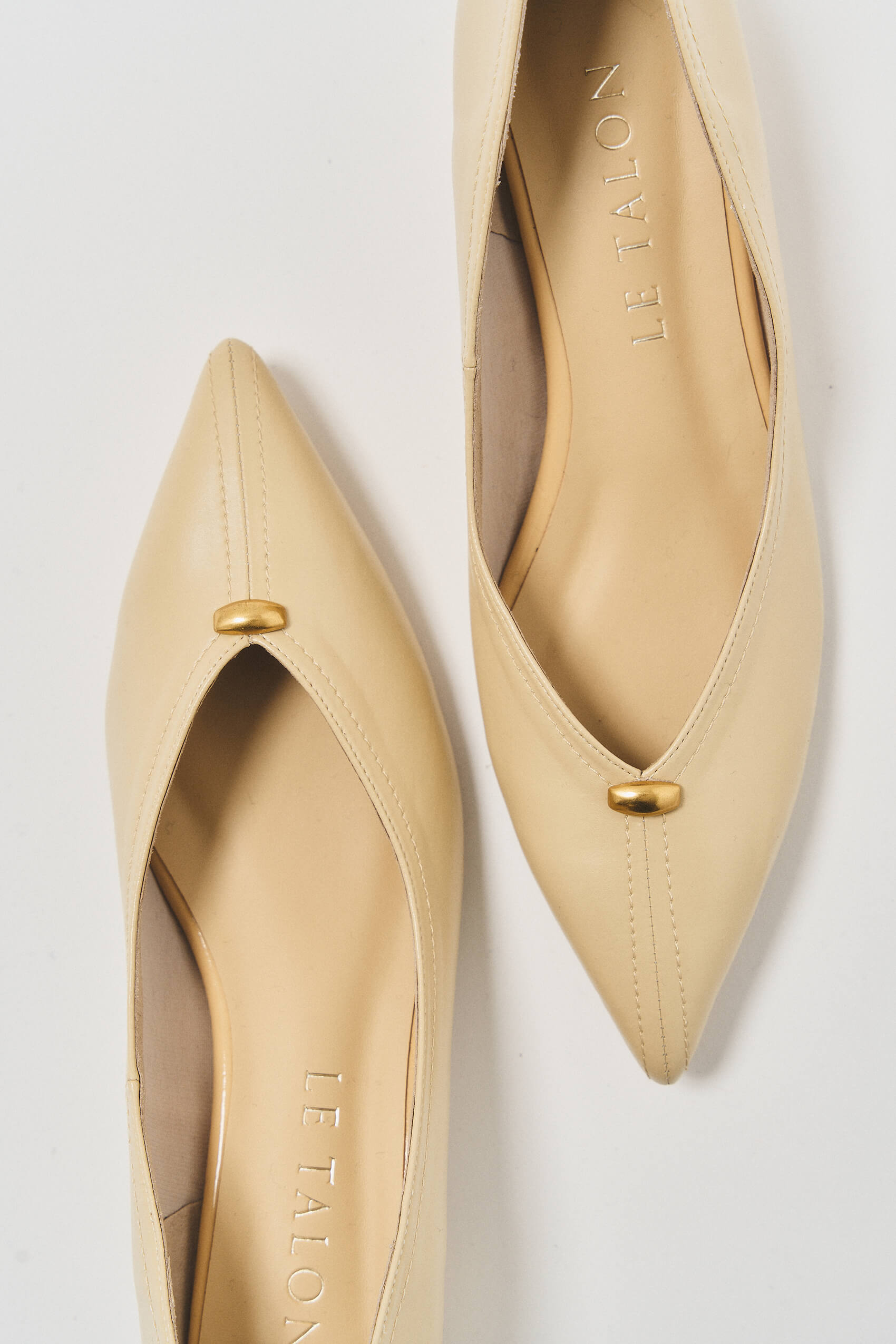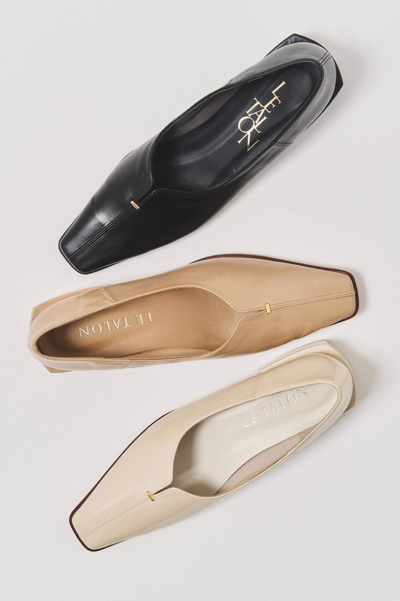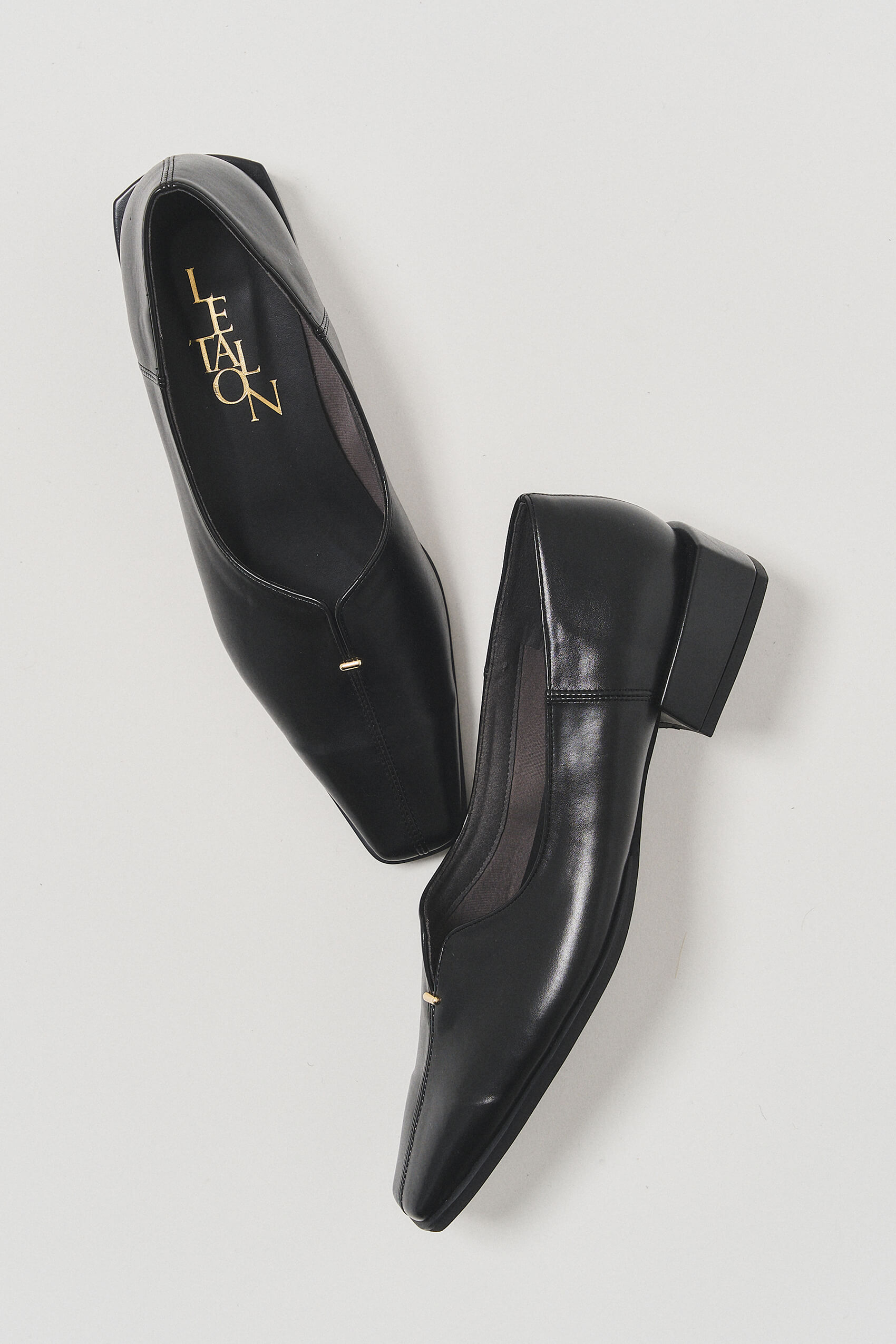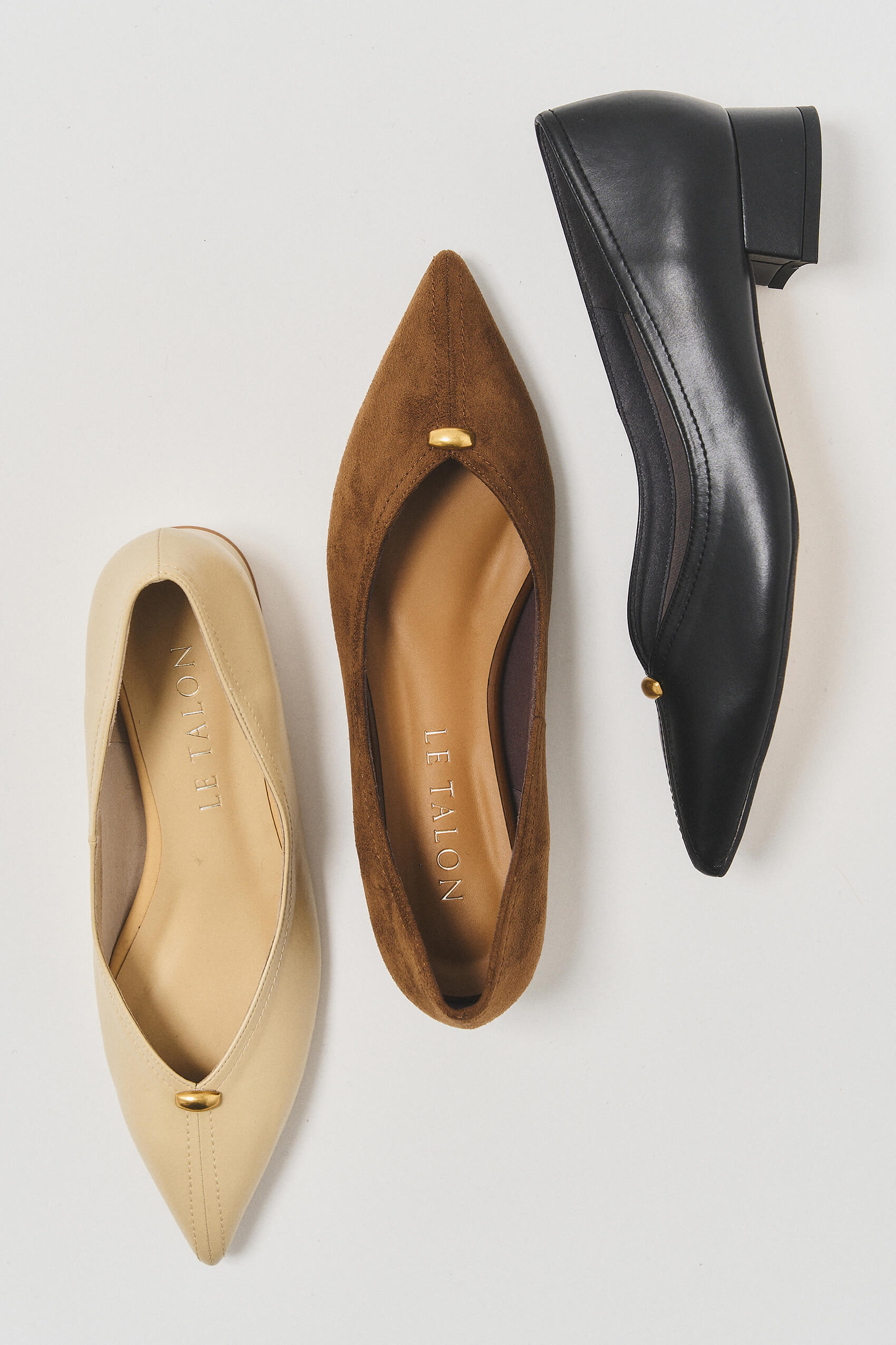 ON/OFFどちらもこれ一足足がきれいに見えるスリットライン、金具のアクセント、ヒールのデザインがオシャレなフラットシューズです。