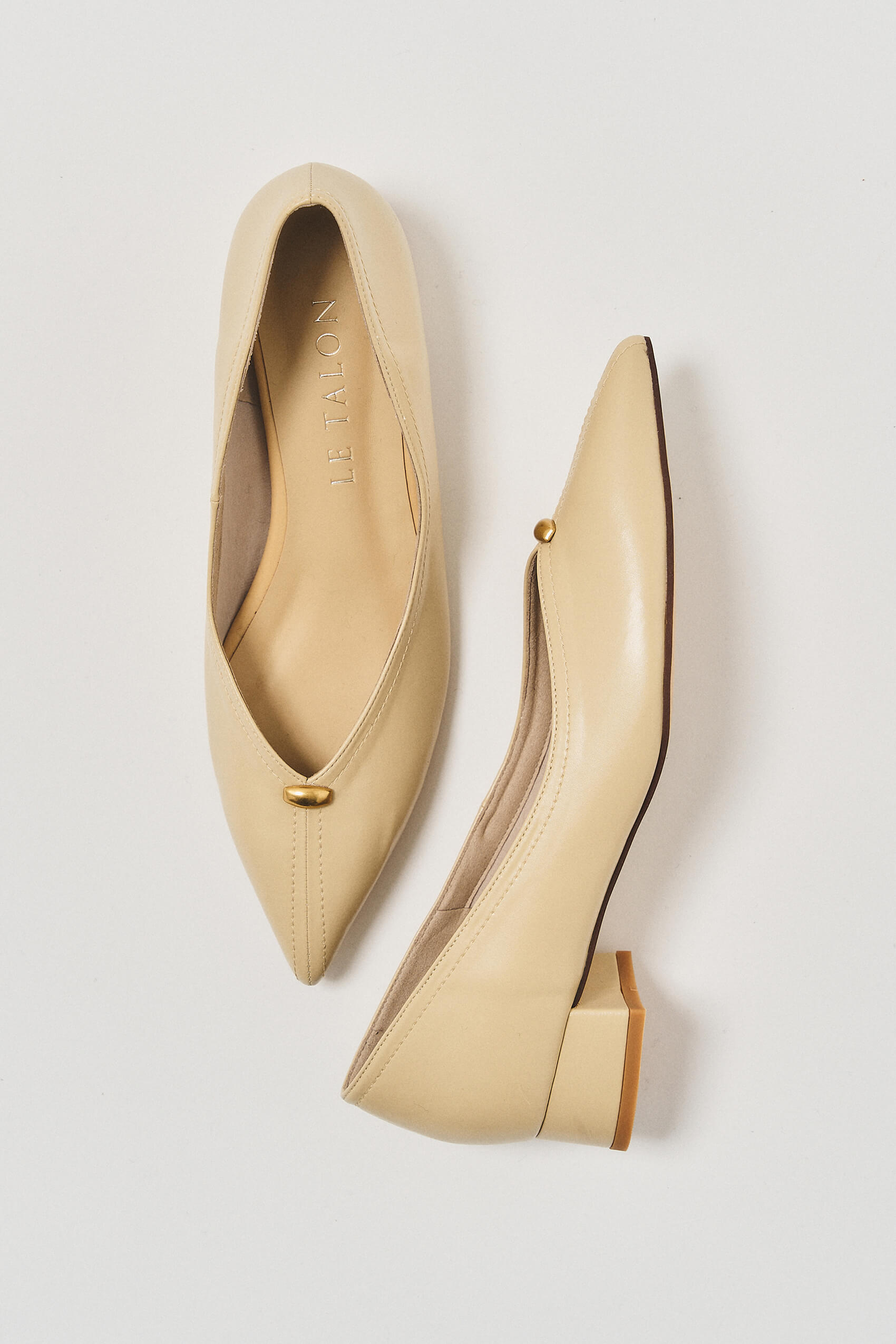 楽におしゃれ見えパンプス安定感のあるヒールに、つま先のステッチ、コロンとしたメタルパーツがかわいい!シンプルなスタイリングにも履くだけでこなれ感が出る一足です。