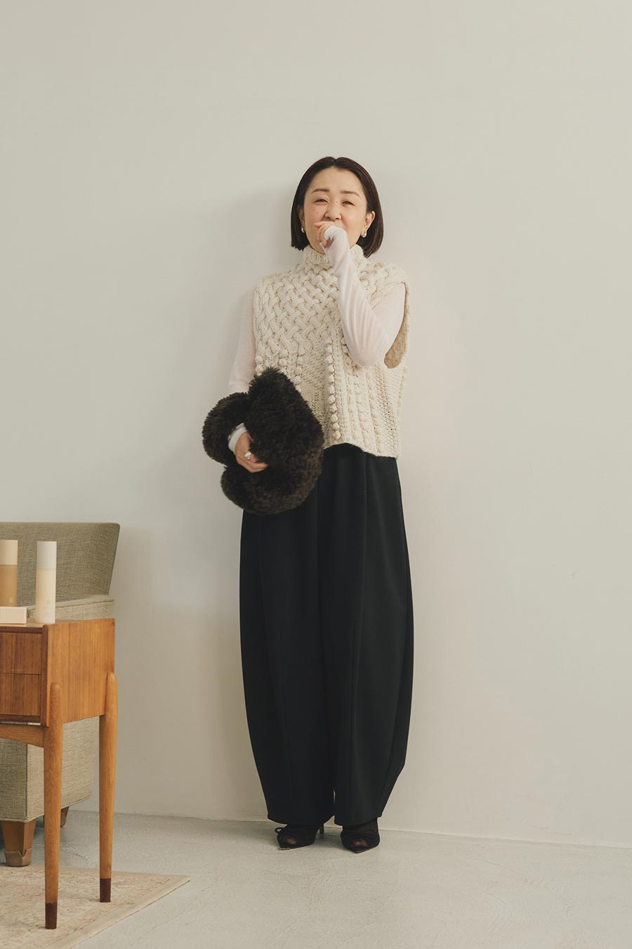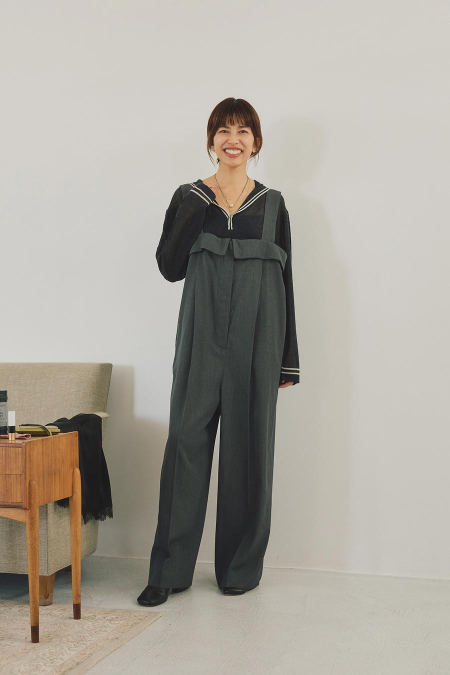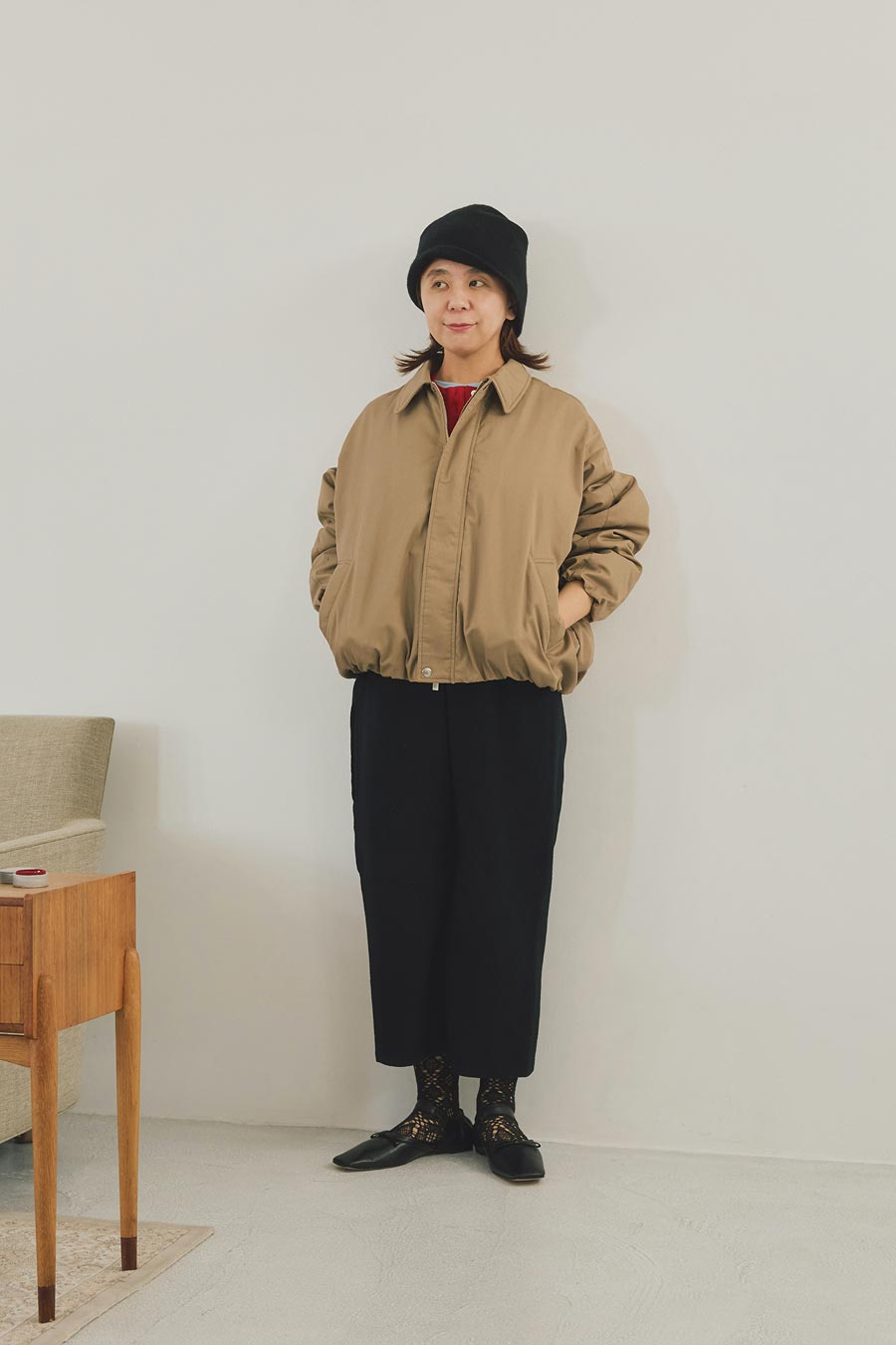「立体的なシルエットはモード感があり全体を引き締めてくれるところが好きです。女性らしいアイテム合わせならピリッとした強さを、ベーシック合わせなら個性を、といった包容力が何よりの魅力でとにかく着回しが楽しいです。実はイージーケアなのも個人的お気に入りポイント。」