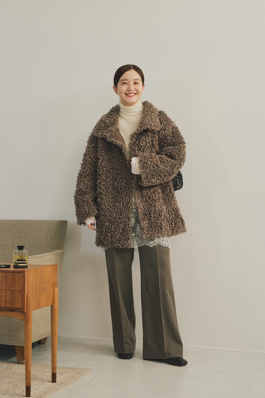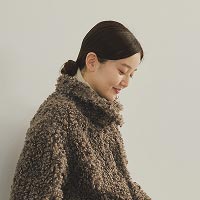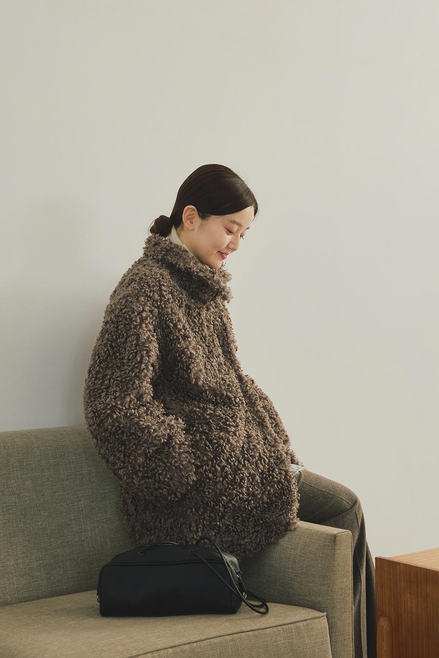 「羽織るだけで華やかになるカーリー素材にまず惹かれました。冬はどうしても重めなスタイリングになりがちなのですがこれなら存在感もあり新鮮です。しかもとっても軽いんです!存在感が強い分、色は落ち着いているので合わせるもののテイストも意外と選べずに使えます。」