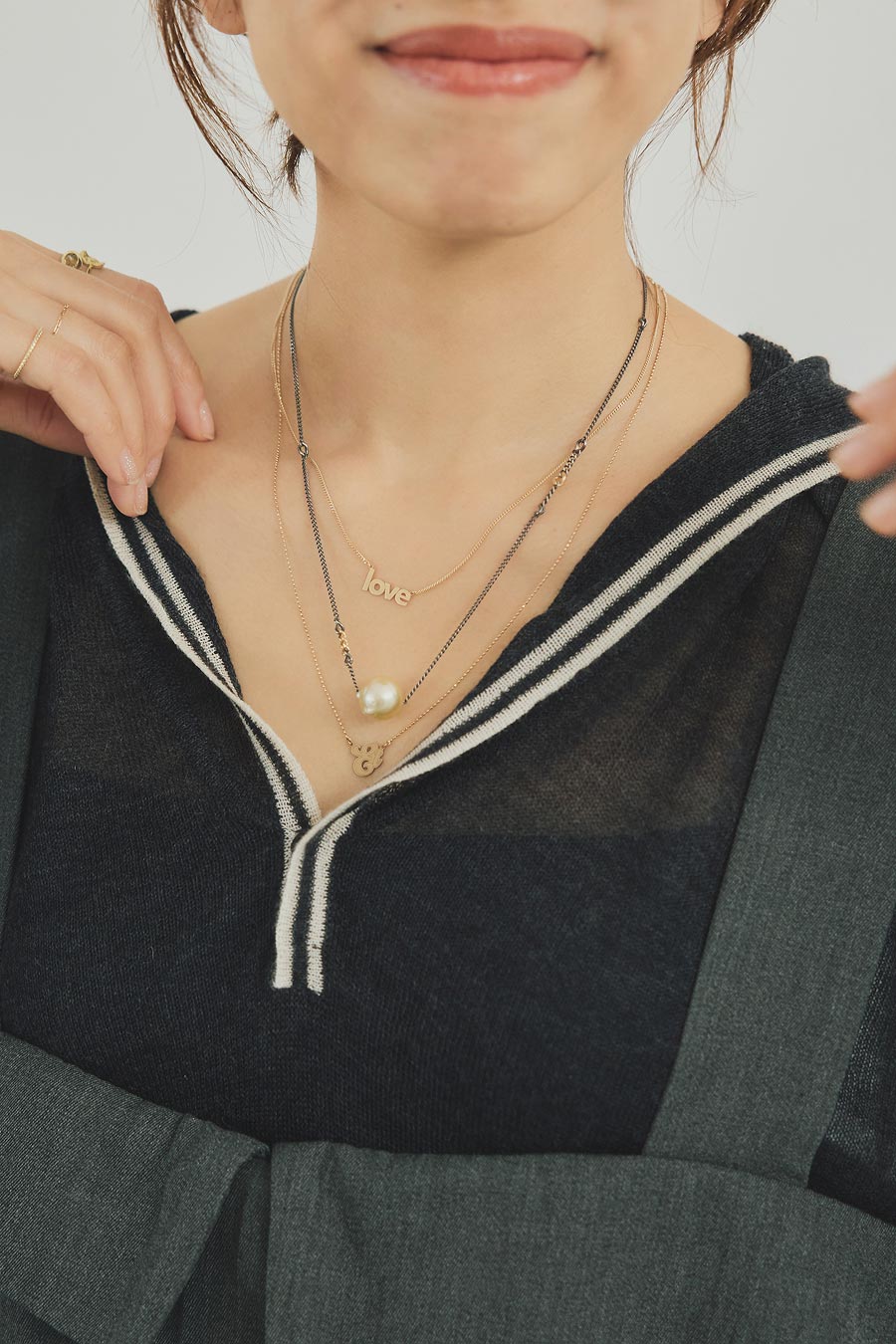 「肌馴染みの良いスキンジュエリーで、私も本当に毎日つけていて、体の一部になりました!毎日でも飽きないんです。他のジュエリーとのレイヤードもしやすいし、パールや天然石のものなど気分によって楽しんでいます。」