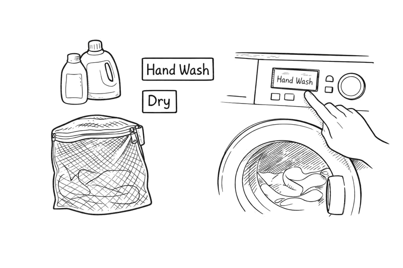 秋冬素材は摩擦に弱いため、洗濯機を使う場合も手洗いコースやドライコースを選びます。洗濯ネットに入れ、洗剤は中性洗剤を使用するのが基本です。