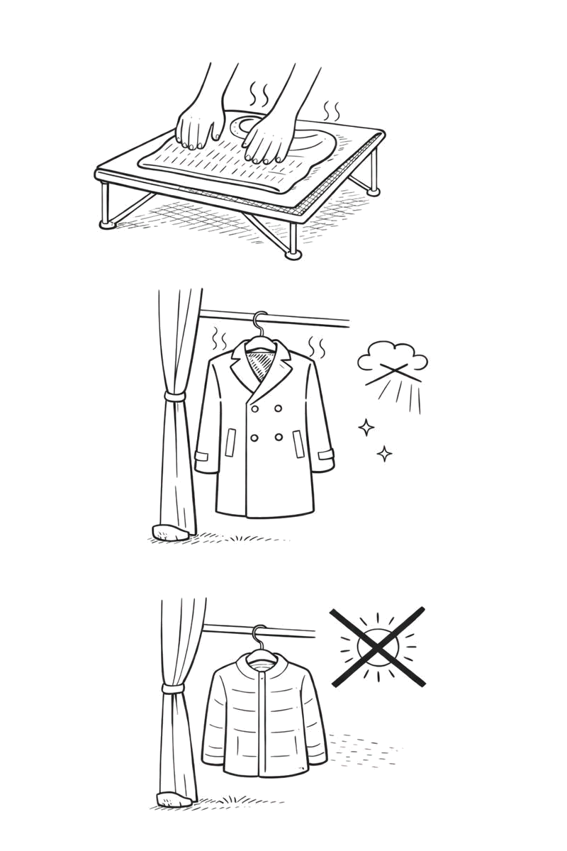 脱水は必要最低限にとどめ、長時間かけないようにします。洗い終えたらすぐに形を整え、ニットは平干し、アウターは厚みのあるハンガーで陰干しします。直射日光は色あせや硬化の原因になるため避けましょう。
