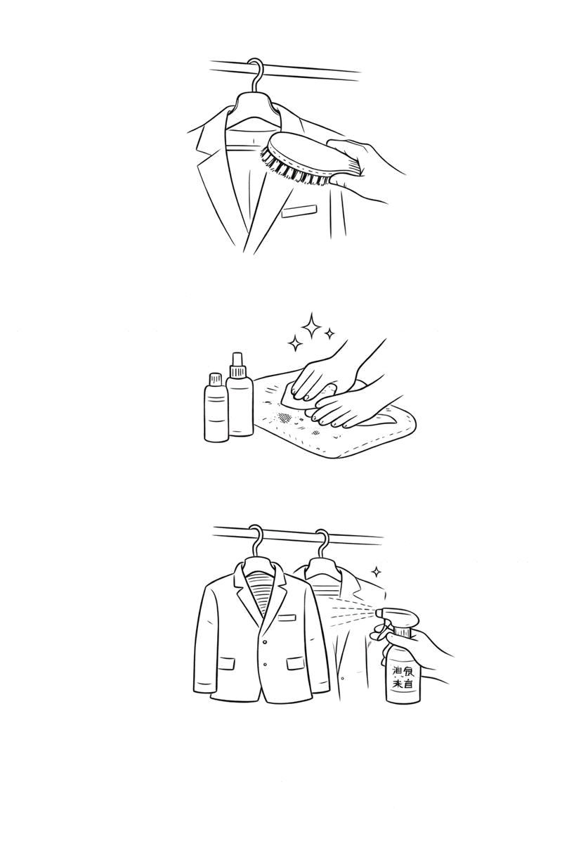 すべてを洗濯する必要はありません。軽いニオイや表面の汚れであれば、ブラッシングや部分洗い、消臭・抗菌スプレーで対応することで、生地への負担を減らせます。洗いすぎないことも、衣類を長持ちさせるコツです。