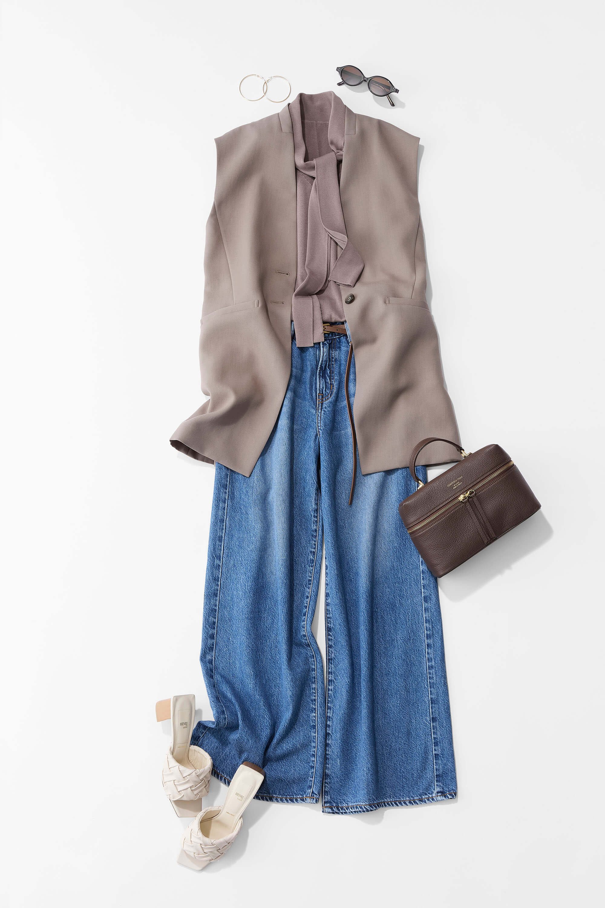長さがあってゆったりとしたジレは真面目すぎず使いやすいアイテム。袖があるもので合わせるより、ノースリーブの軽快さが今っぽい表情に仕上がります。クラシカルなタイ付きニットをインナーに据えれば、カジュアルの枠を超えた洗練が生まれます。