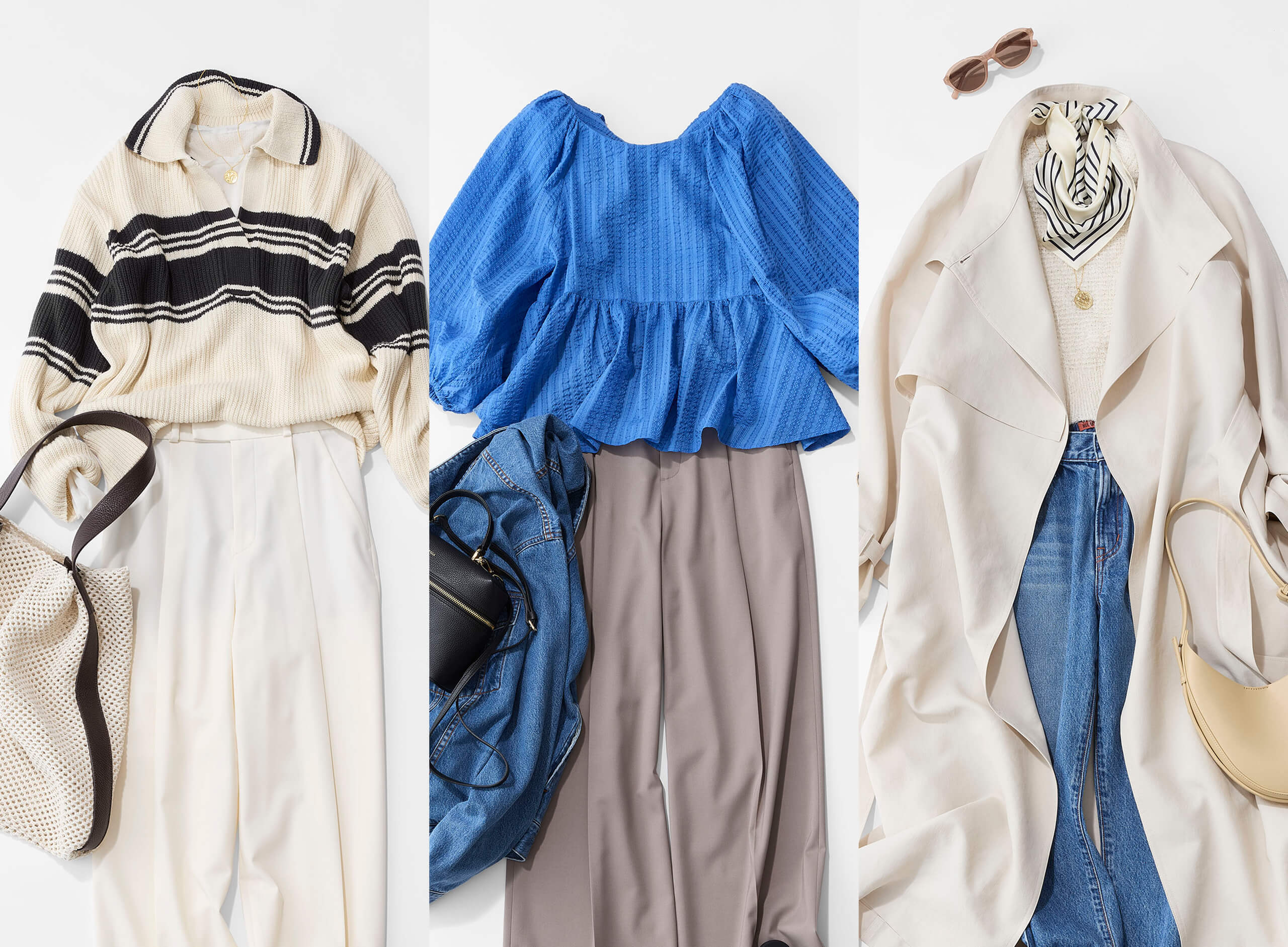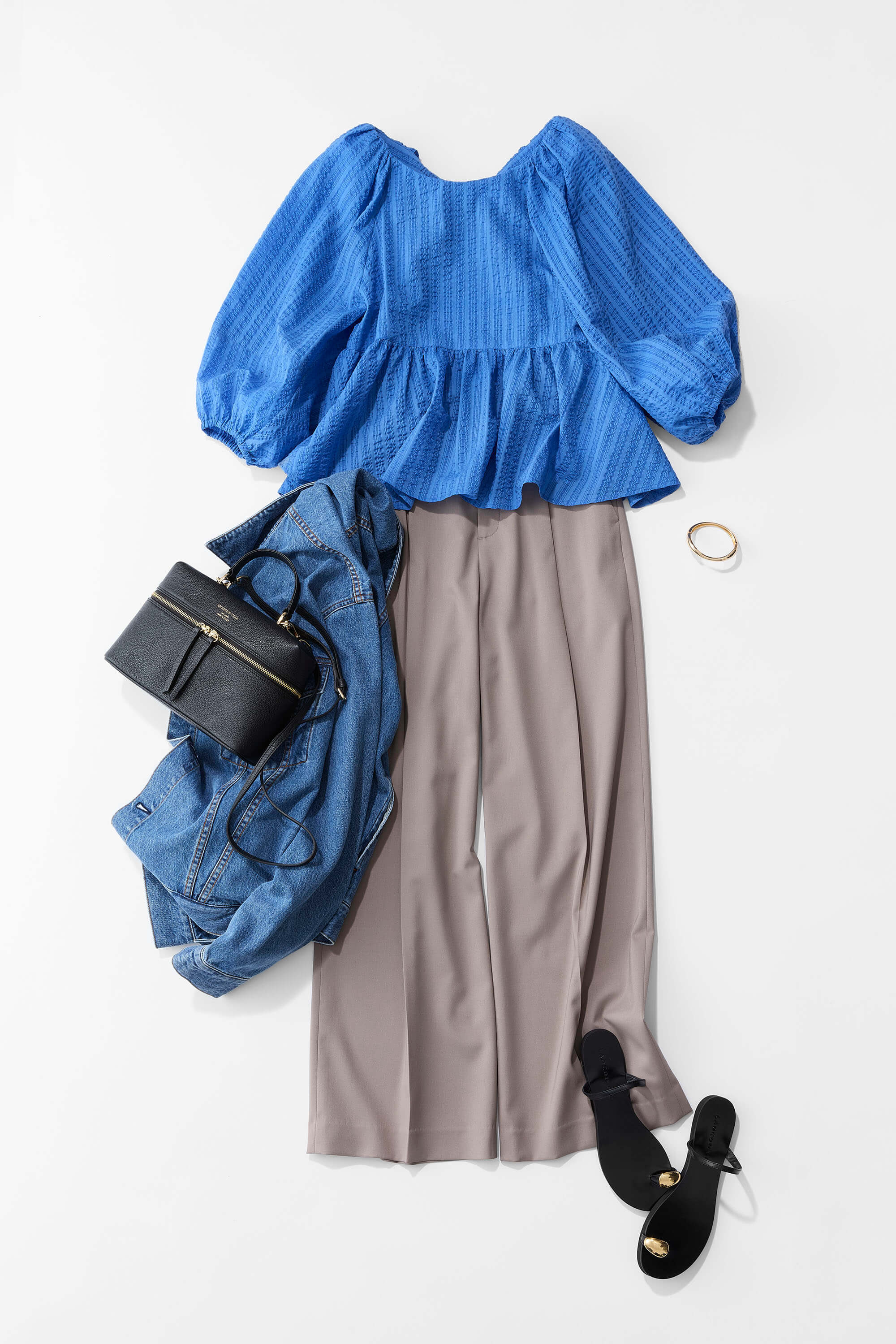 今回の主役は、ドラマチックなボリュームが目を引くペプラムブラウス。あえてストンと落ちるワイドパンツを合わせることで、甘さを引き算した洗練のバランスが完成します。小物は黒でキリッと引き締めて。まだ寒さの残る景色に凛と映える、スタイリングが完成します。