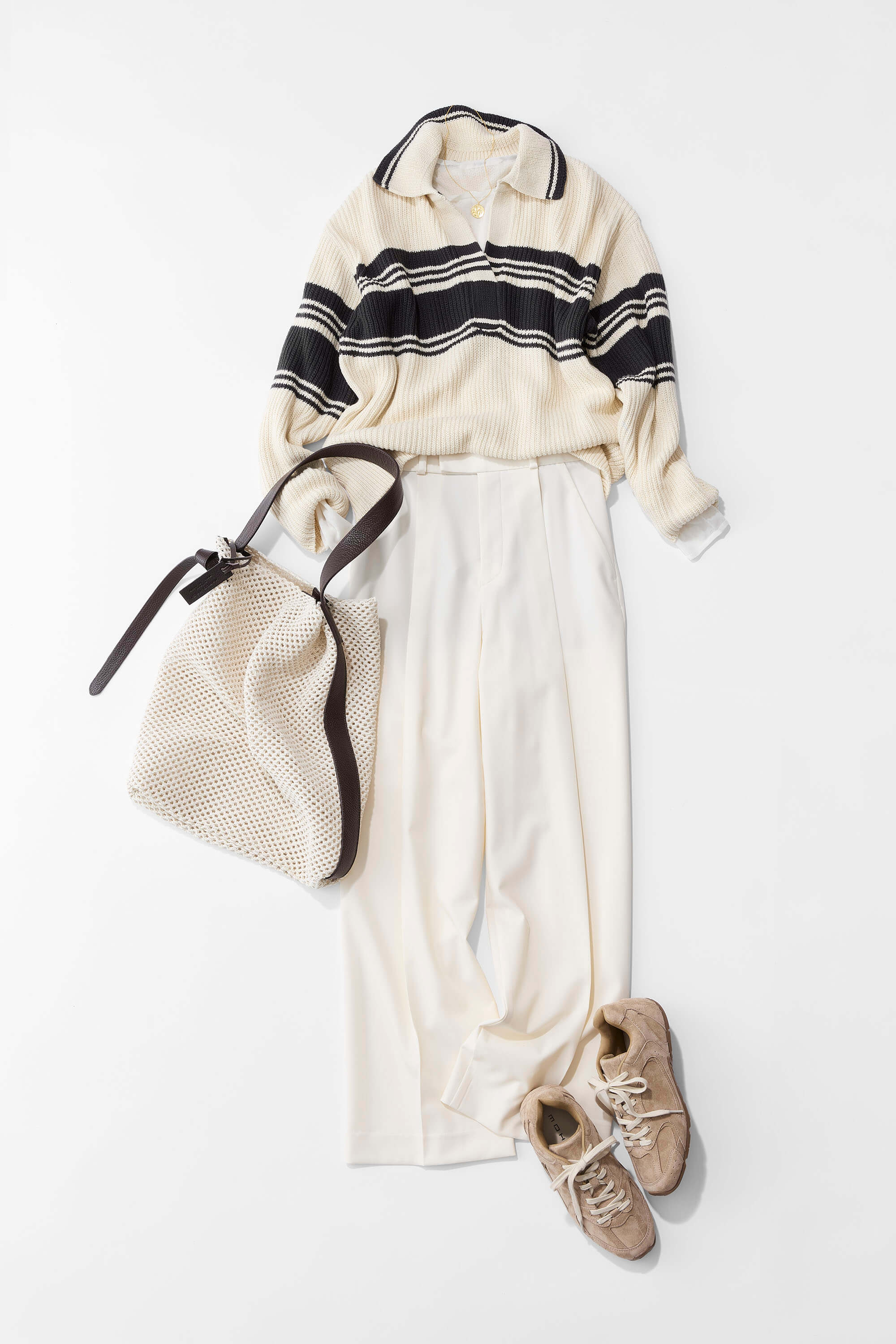 マリンボーダーのポロニットは、クラシカルな気品と快活さが魅力。春の立ち上がりには、あえて同色のシアーなインナーをレイヤードし、質感のコントラストを忍ばせるのが今の気分です。仕上げにメッシュバッグとスニーカーを添えれば、軽やかなリズムが生まれる大人のカジュアルスタイルが完成します。