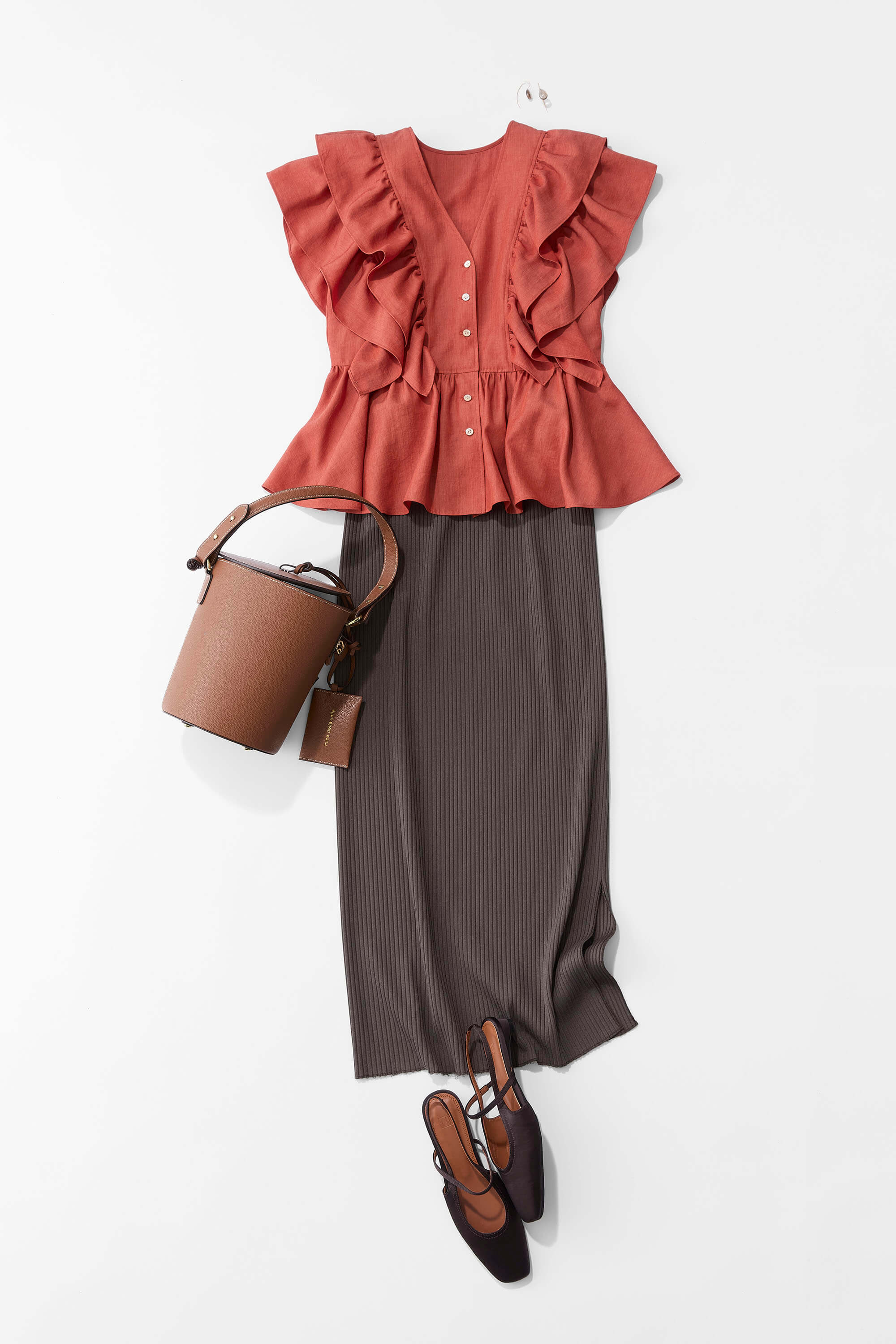 ブラウンの情調を秘めたテラコッタには、同じ温度感を持つブラウン小物を添えて。裾が美しく広がるペプラムのデザインを、潔いIラインのタイトスカートで凛と引き締めて。曲線と直線のコントラストが、計算された現代的なシルエットを完成させます。