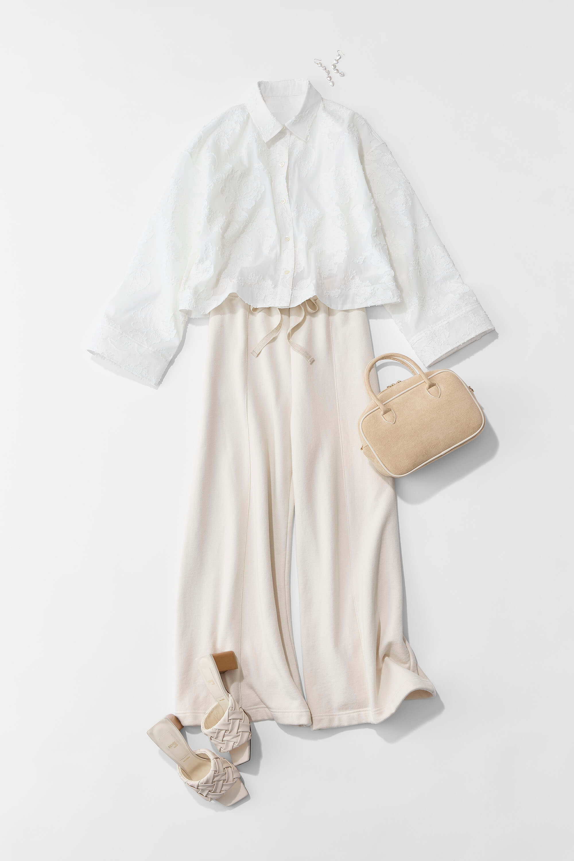 白のジャガードが持つ端正な佇まいを、スウェットパンツのリラクシーな空気感を合わせて、相反するアイテムで互いの個性を引き立てて。色味をワントーンに絞るのが、この大胆な組み合わせのポイントです。軽やかな春夏こそ、スエード小物の重みで引き締めるのがおすすめです。