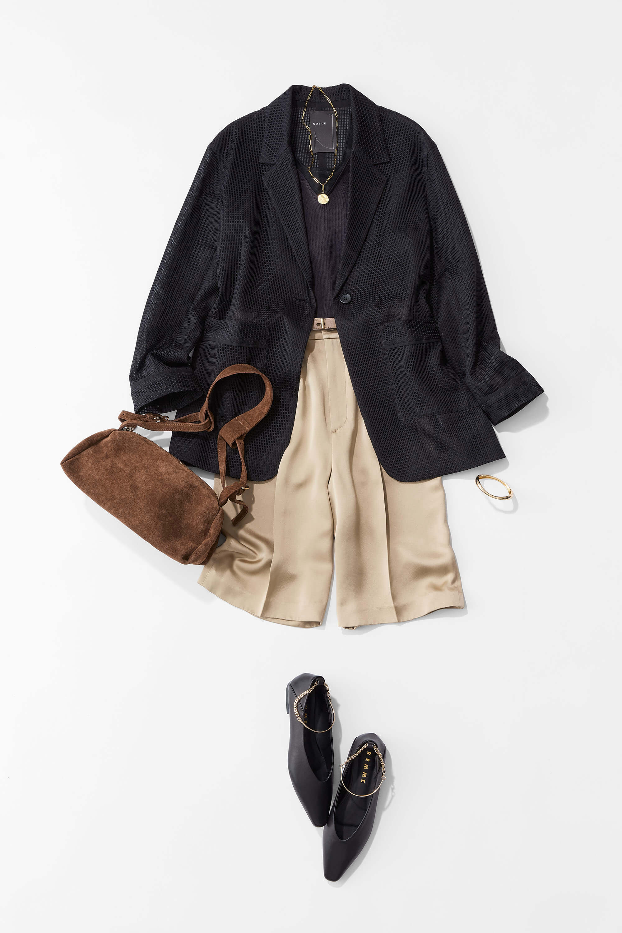 トレンドを象徴するメッシュジャケットは、黒を選ぶことでぐっと端正な表情に。ノースリーブを忍ばせて透ける肌を繊細にコントロールすれば、腕のラインを美しく見せてくれます。ハーフパンツが運ぶ心地よい開放感を、足元の黒で引き締めると、よりスマートに決まります。