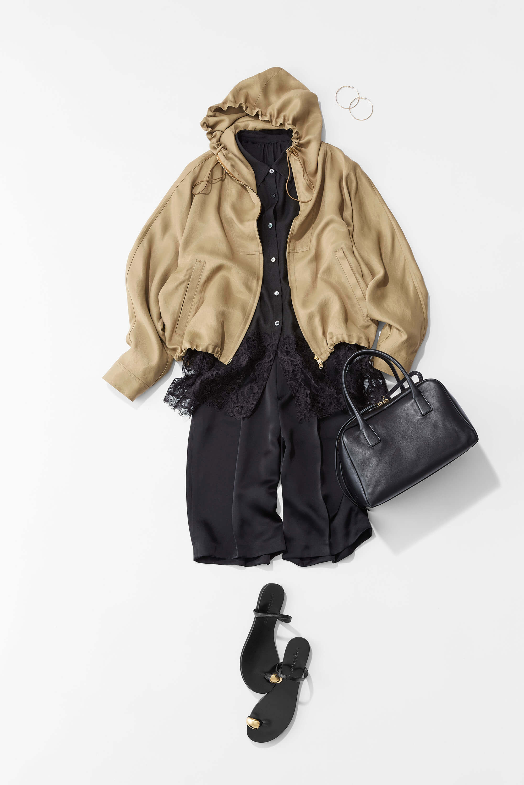 ブルゾンだけどきれいめな質感だったり、袖口がシャツのようなデザインなのでスポーティーすぎないのが良いですね。レースブラウスと艶感のあるハーフパンツで、きれいめブルゾンスタイルに仕上げました。今季のムードを象徴する、裾から覗くレースのレイヤード。ブルゾンのラフな空気感に、繊細な気品をひとさじ添えることで、鮮度の高いバランスへ。オールブラックで繋いだインナーが、裾から覗くレースを「大人の甘さ」へと導きます。