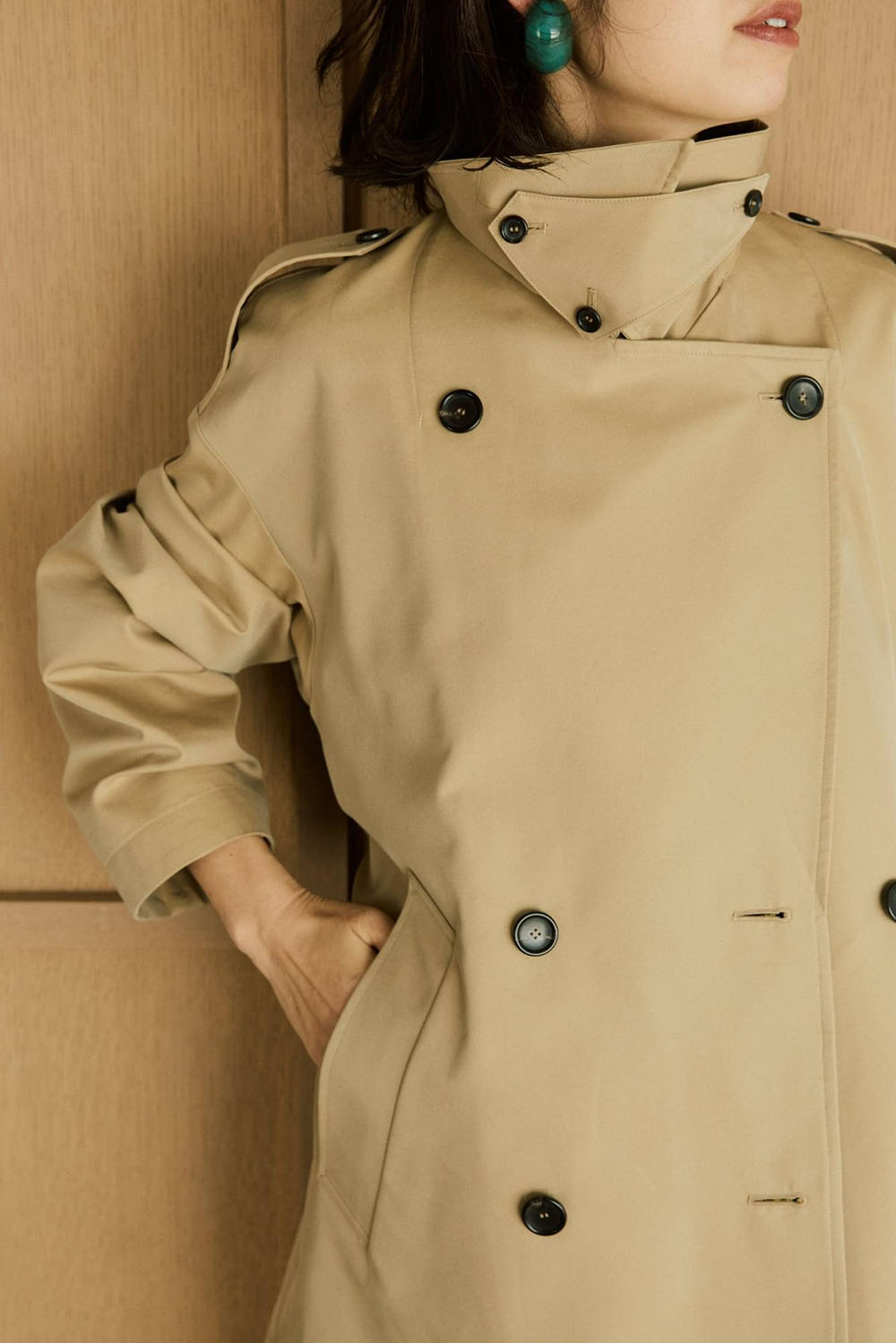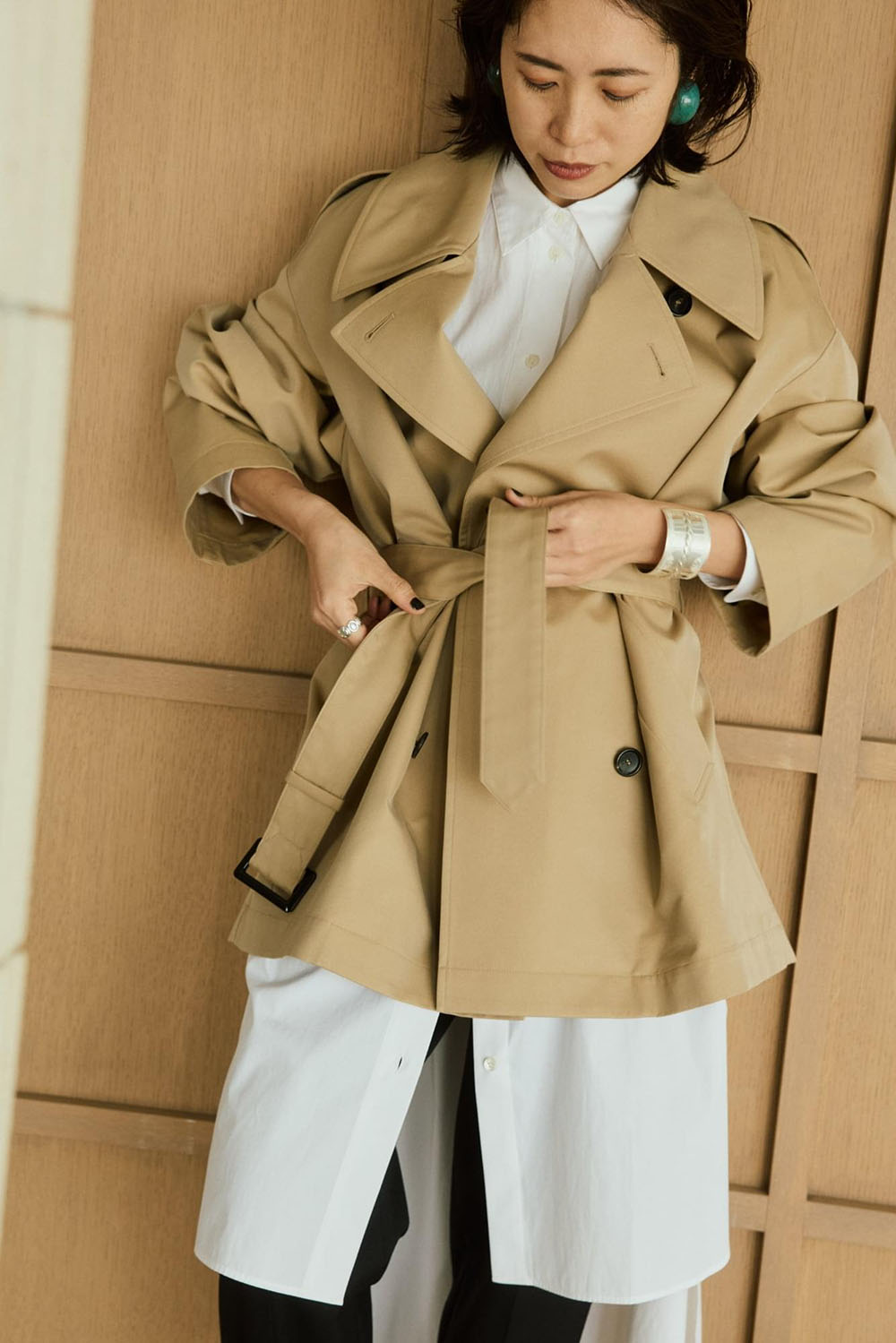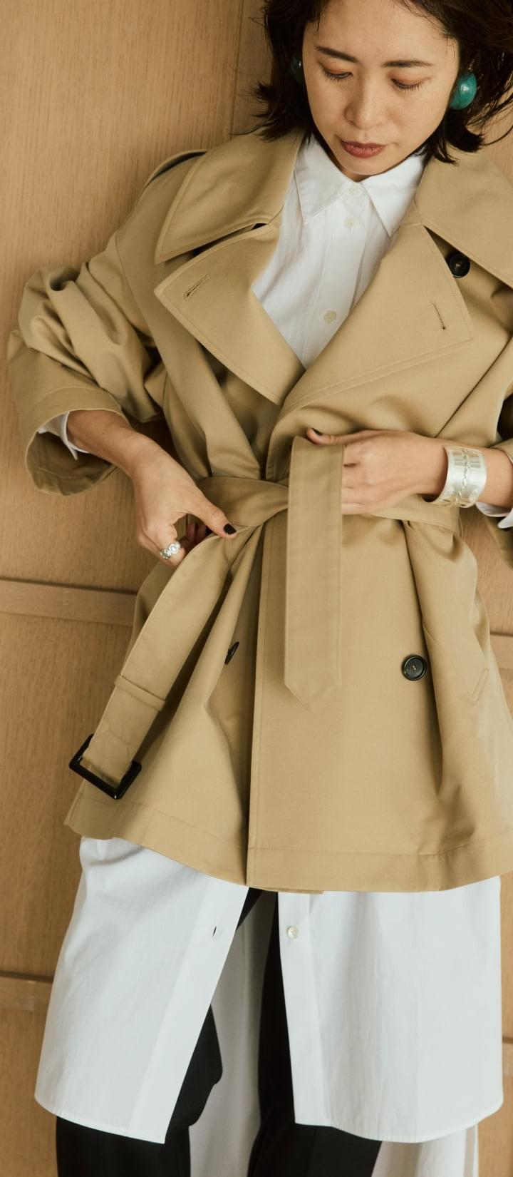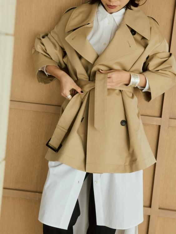 VINTAGEライクな風合いのコットンギャバとシワになりにくいポリエステルをブレンドしたありそうで なかった絶妙な素材を使用したコートが大人のためのトレンチコートの進化版として登場。 伝統的なディテールを残しながら、コンパクトな丈感でトレンドの抜け感があります。 水牛ボタンと小さめのボタンホールにも拘りが。ミニマルで洗練された上質感がポイントです。 モードでミニマルなロングシャツドレスとも好相性。シャープで知的なスタイルが完成します。
