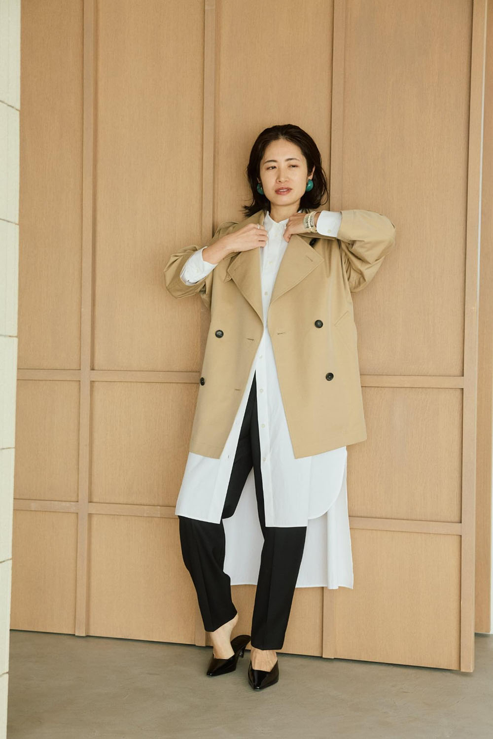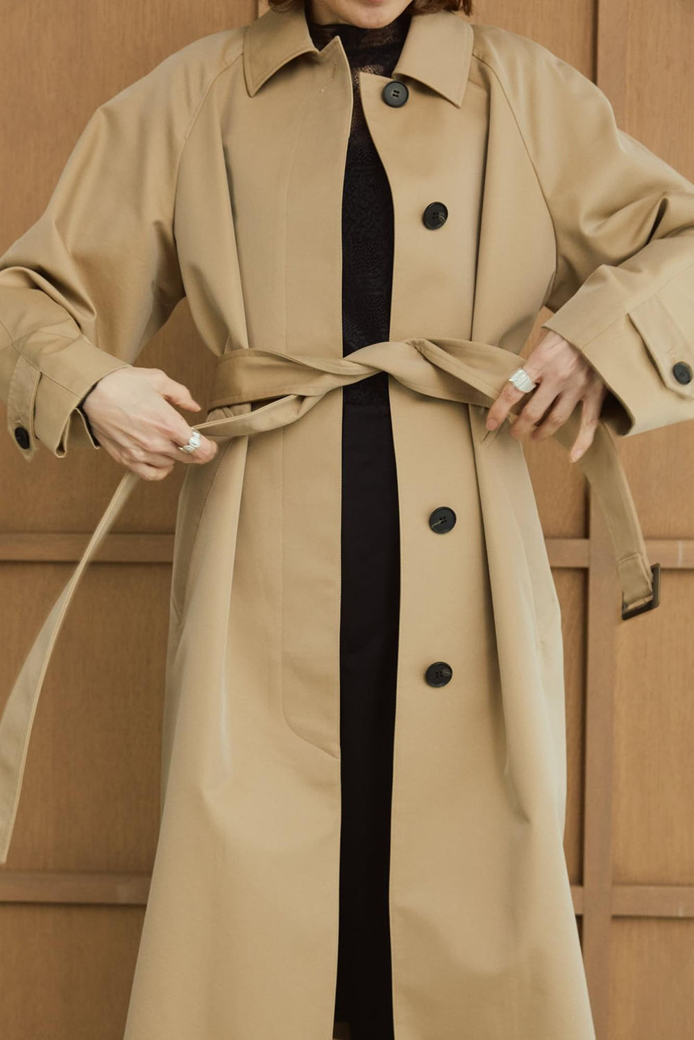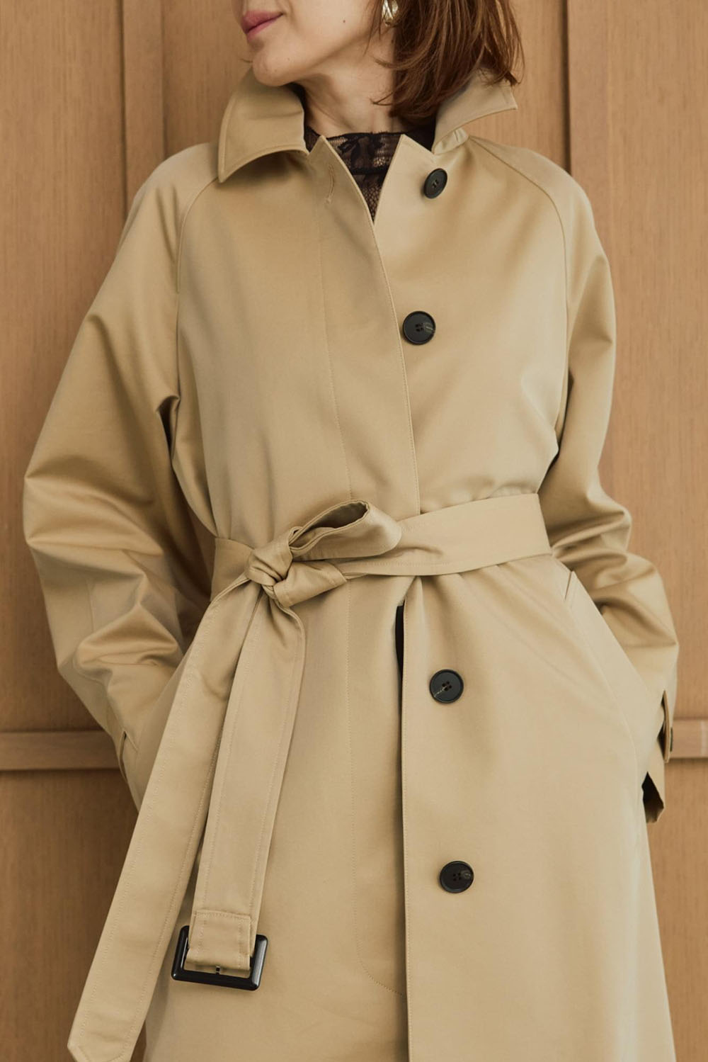 VINTAGEライクな風合いのコットンギャバとシワになりにくいポリエステルをブレンドしたありそうで なかった絶妙な素材を使用したコートが大人のためのトレンチコートの進化版として登場。 伝統的なディテールを残しながら、コンパクトな丈感でトレンドの抜け感があります。 水牛ボタンと小さめのボタンホールにも拘りが。ミニマルで洗練された上質感がポイントです。 モードでミニマルなロングシャツドレスとも好相性。シャープで知的なスタイルが完成します。