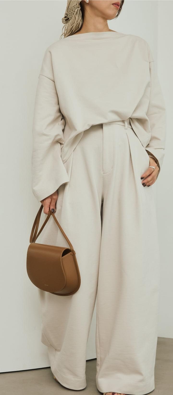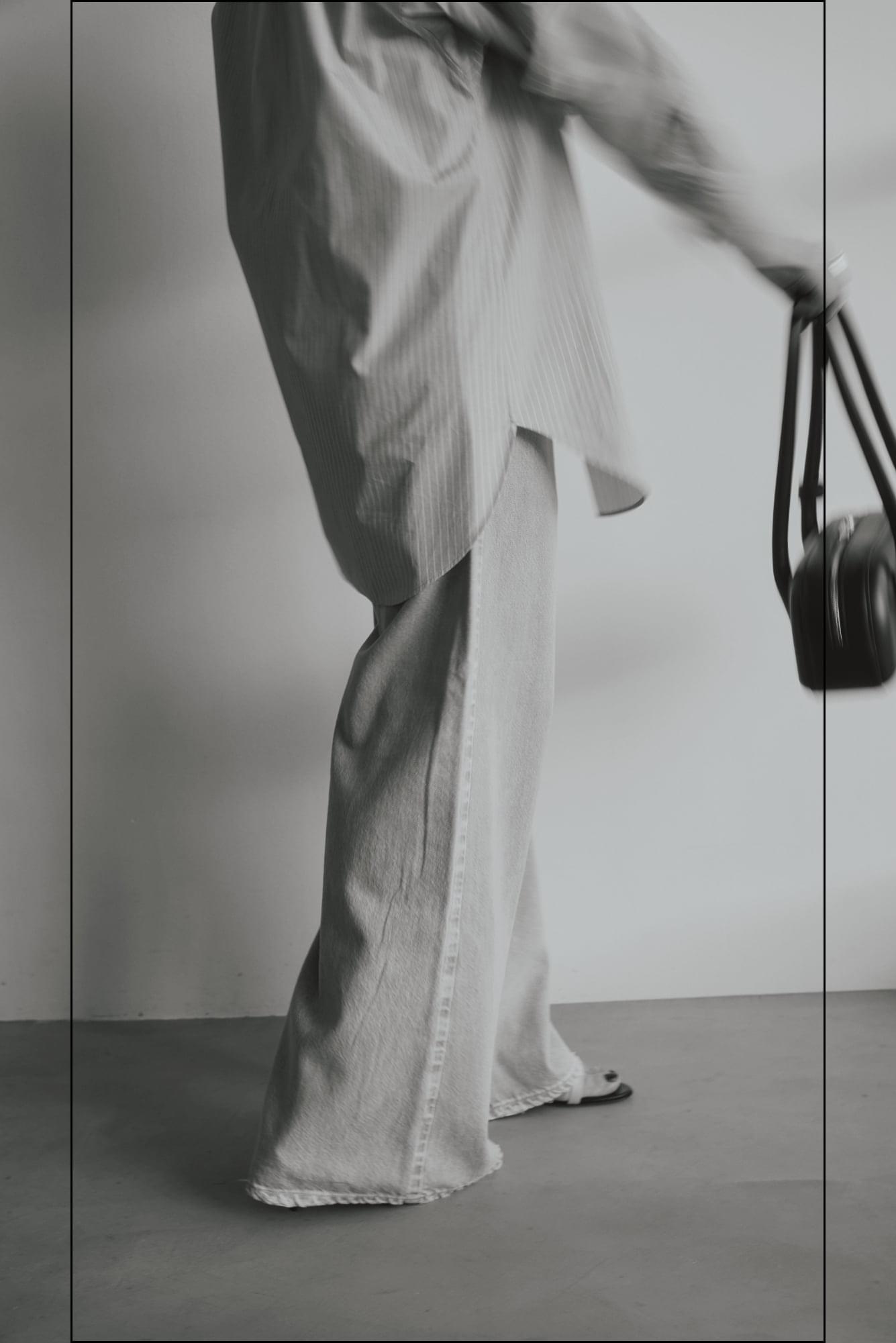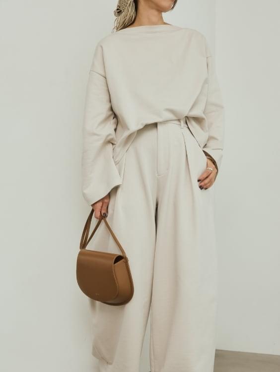 綿と再生ポリエステルをブレンドしたサスティナブルな新素材“インレー”を使用した新鮮セットアップ。 生地は軽やかでドライな質感かつ程よいハリ感がプラスせれていて、フォルムを作り出し身体を美しく見せてくれます。ゆったりとしたラウンドスリーブとコンパクトな着丈のトップスとカーブなシルエットのワイドパンツがでモードなフォルムが出るセットアップです。