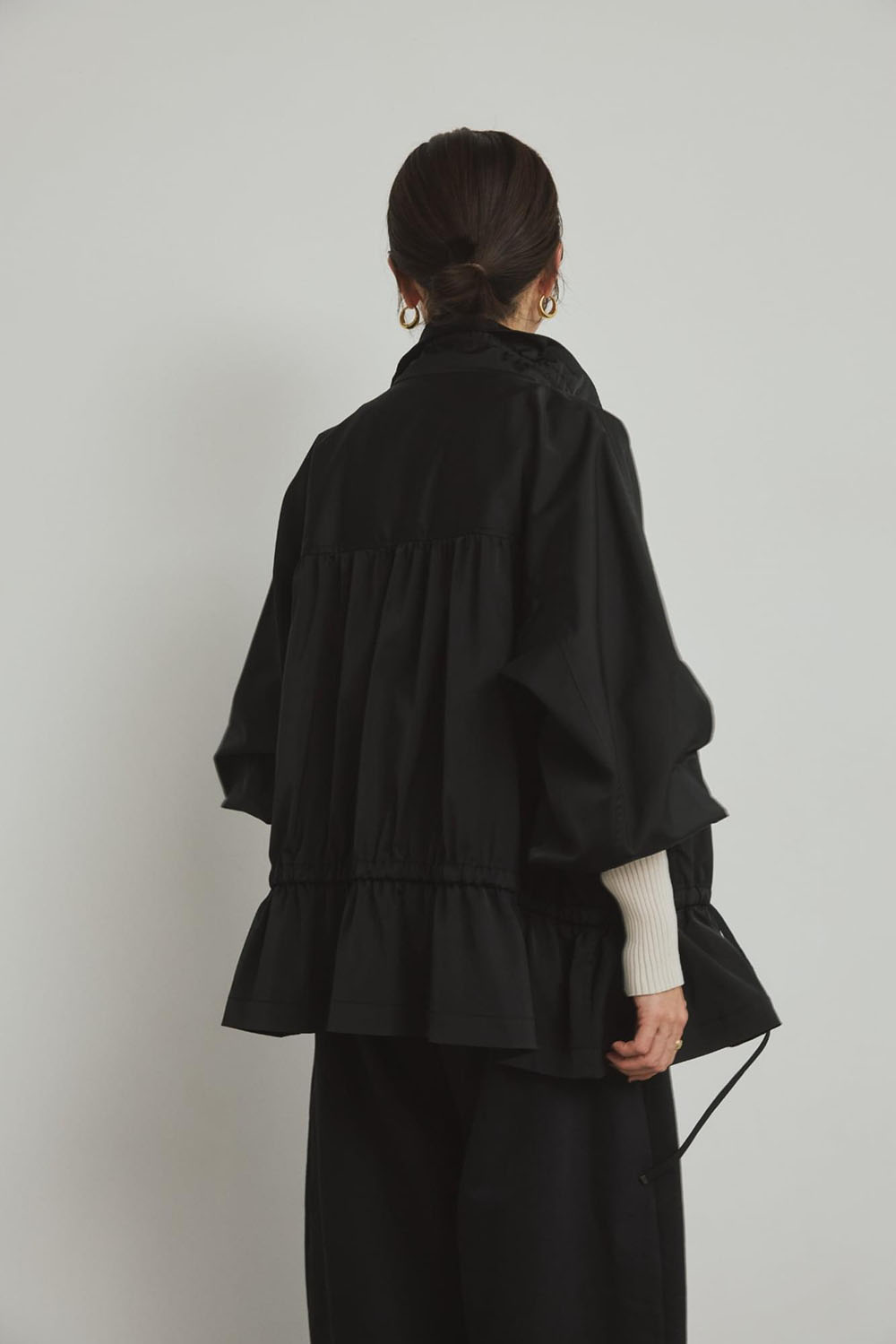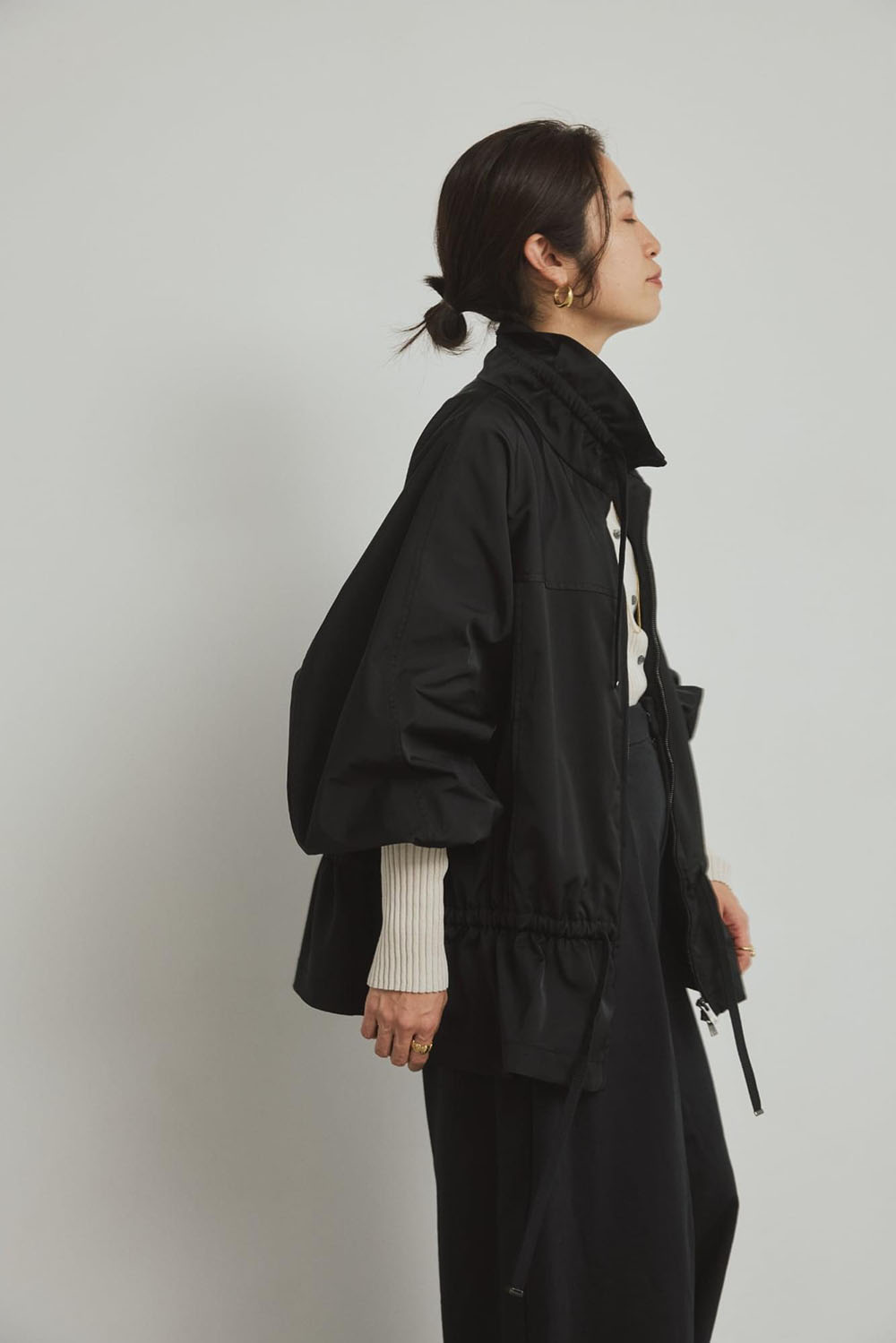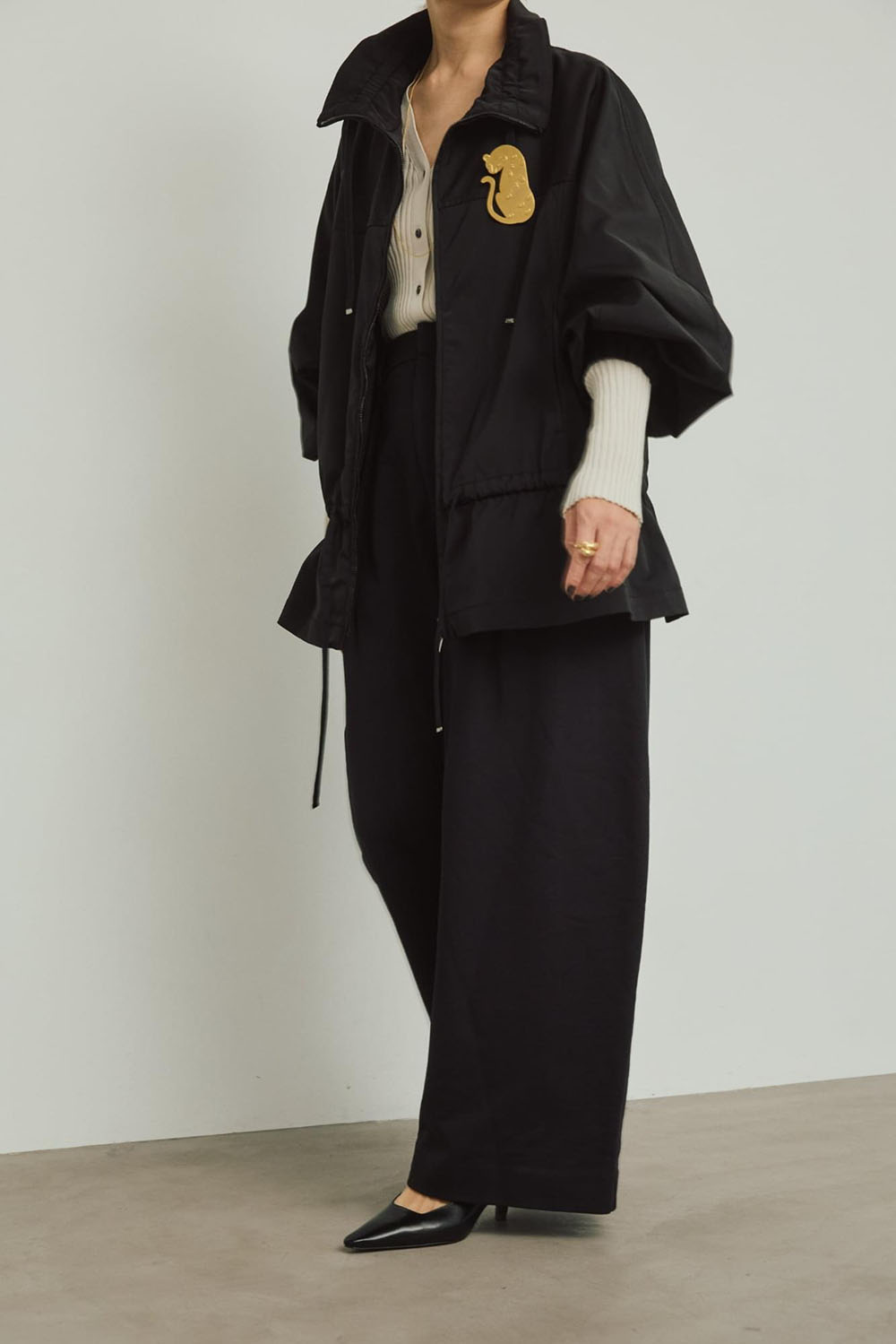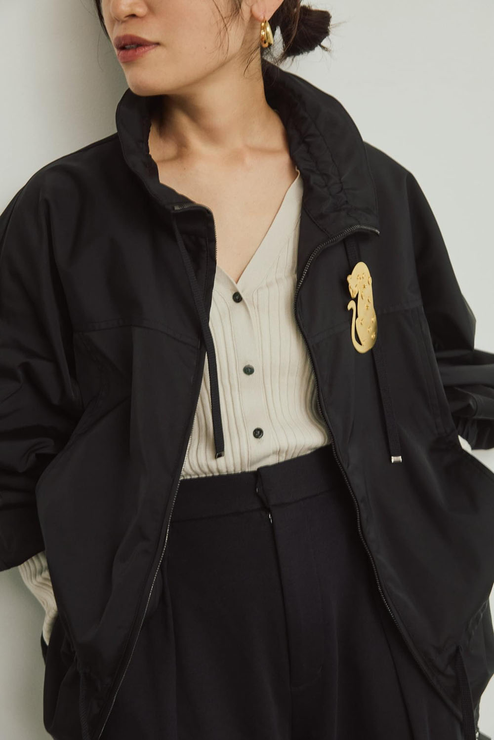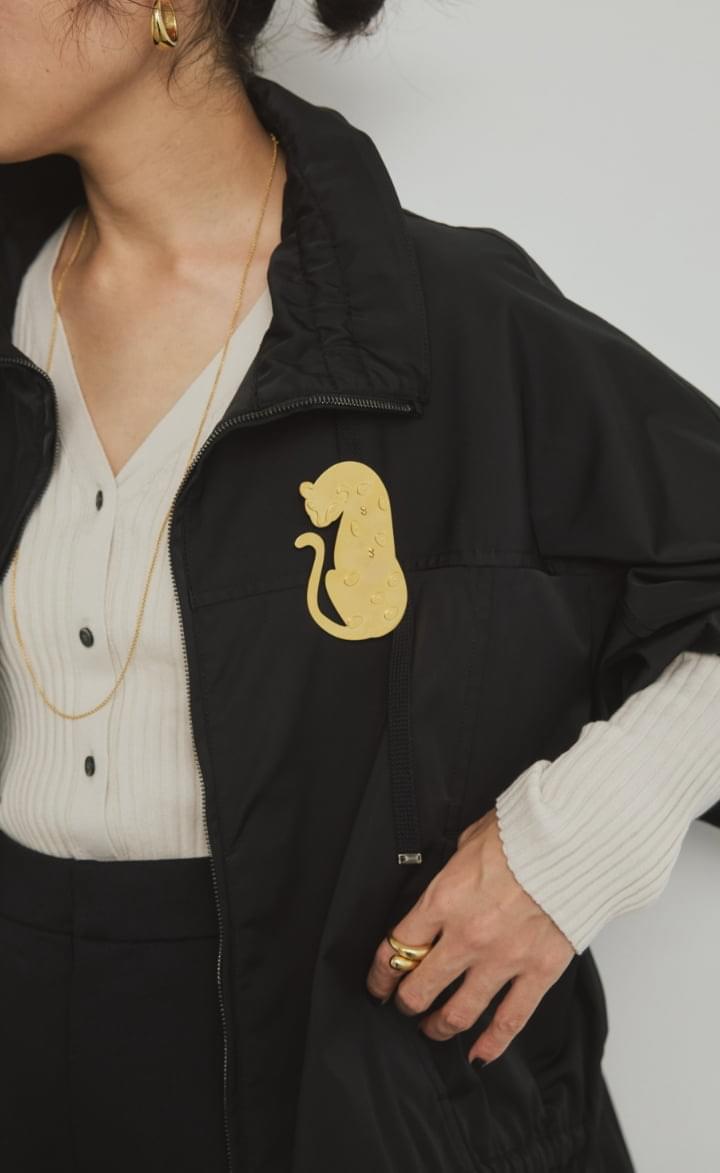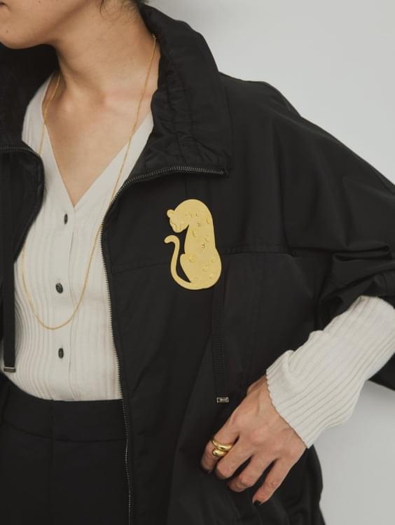 なめらかな質感と程よい厚みを持つダブルサテン素材で仕立てた新型ジップブルゾン。 スポーティーでありながら、たっぷり入れたギャザーのデザインがフェミニンさも併せ持つこなれブルゾンは、着回し力抜群の一枚。 サスティナブルな新素材“インレー”のボトムとの相性も抜群で、軽やかな素材ミックススタイルが 今シーズンの気分です。ワンポイントにジャガーブローチをつけて遊び心をプラス。