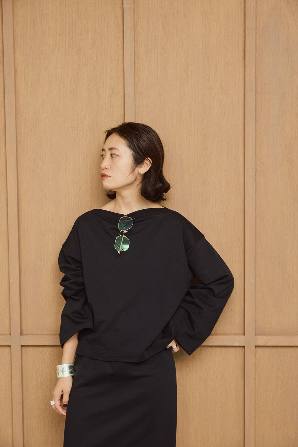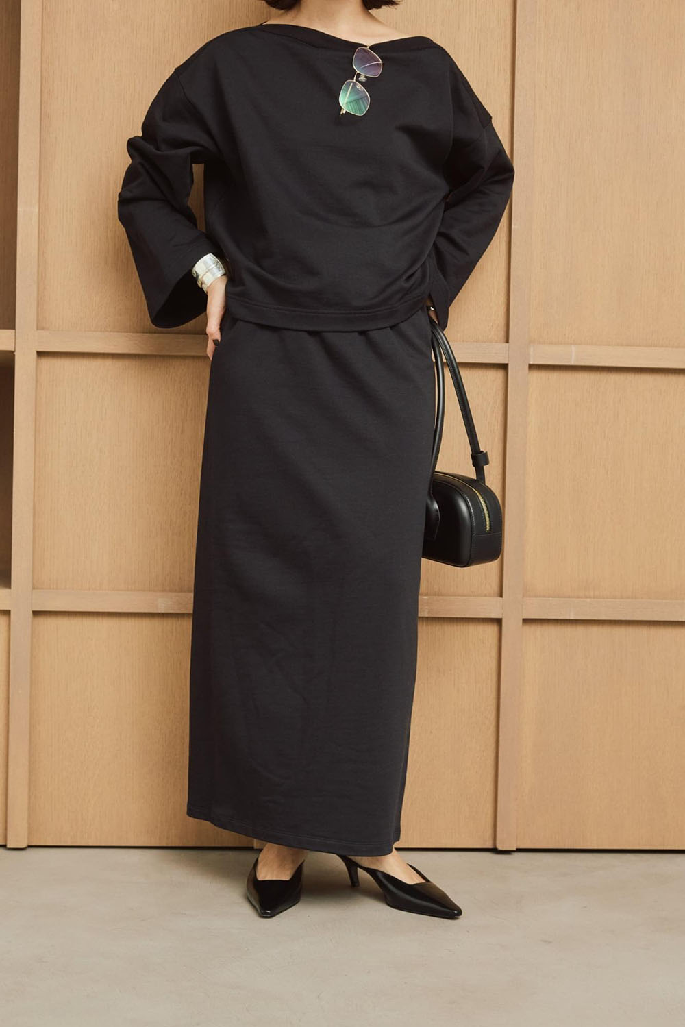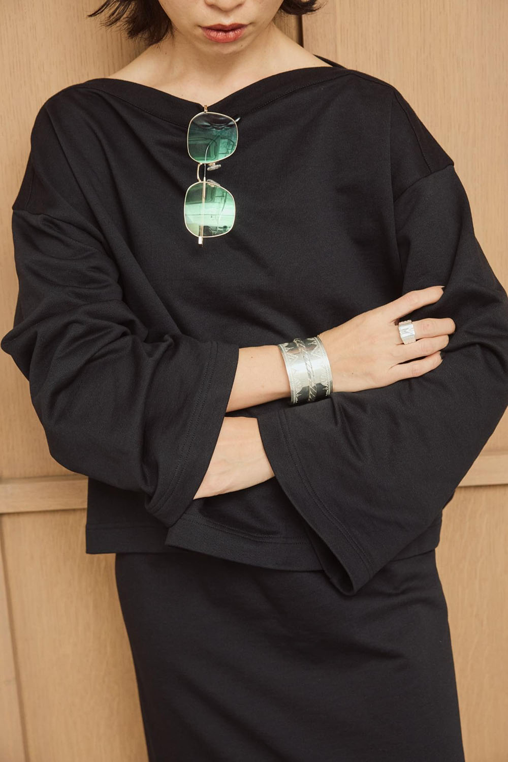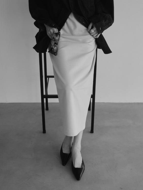 綿と再生ポリエステルをブレンドしたサスティナブルな新素材“インレー”を使用したトップスとスカートの 新鮮セットアップ。 生地は軽やかでドライな質感かつ程よいハリ感がプラスせれていて、フォルムを作り出し身体を美しく見せてくれます。スカートは動きやすく後ろのシルバージップがデザインポイントで素敵です。 シルバーのアクセを重ね付けして春の軽快なスカートスタイリングが完成します。