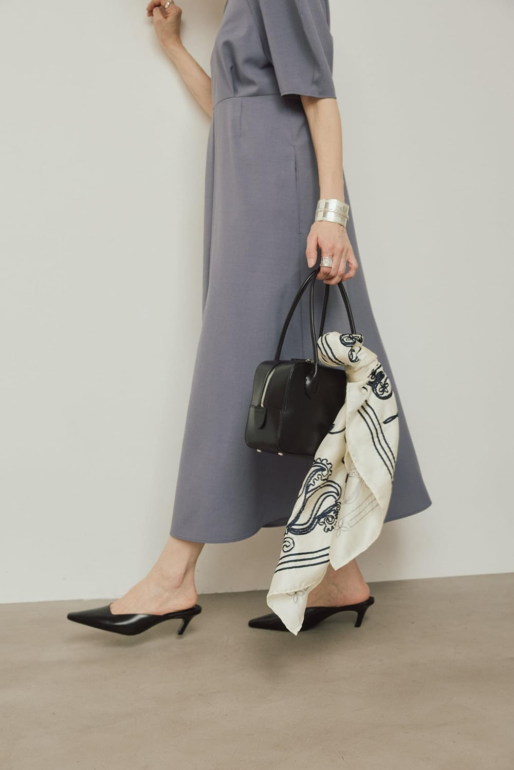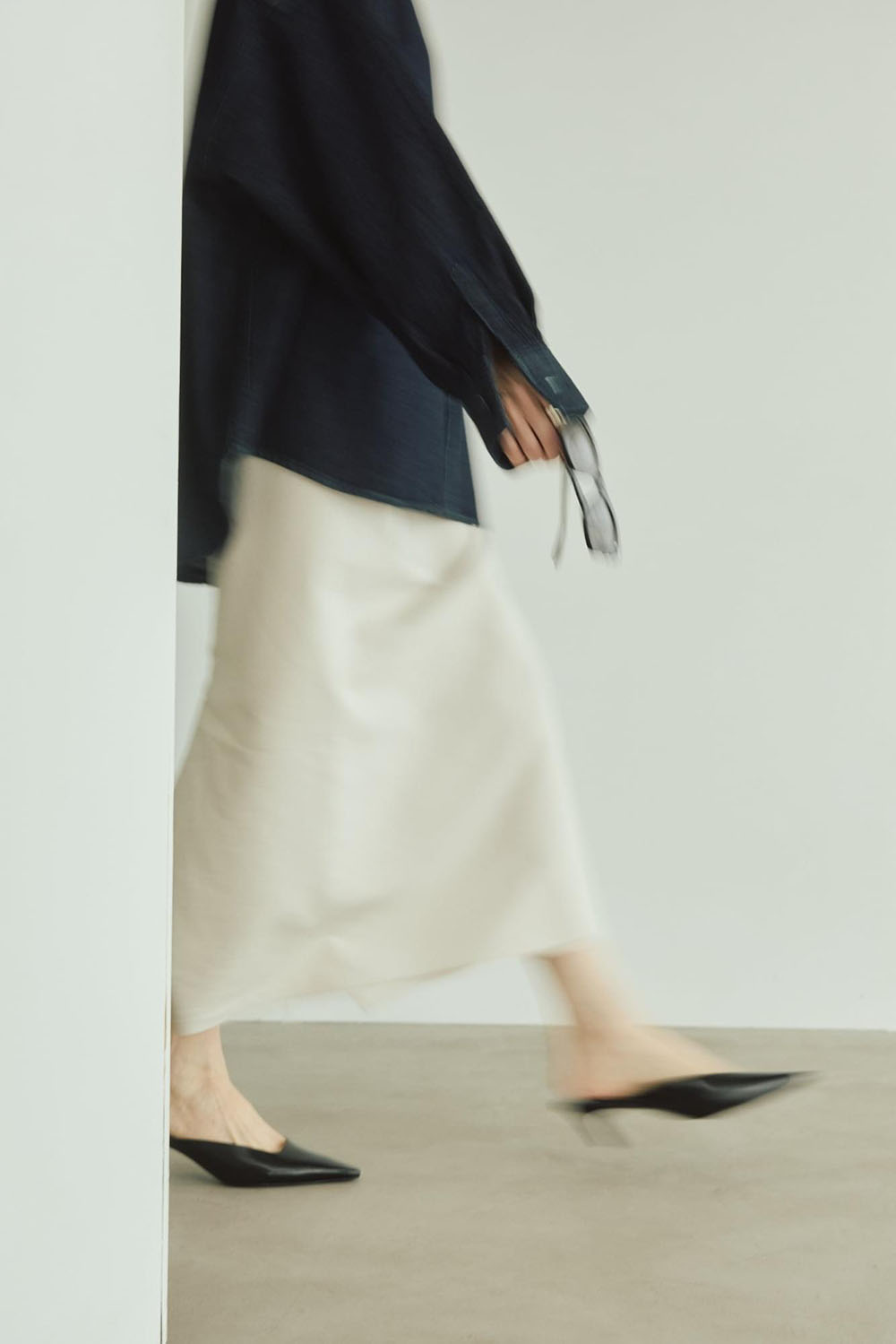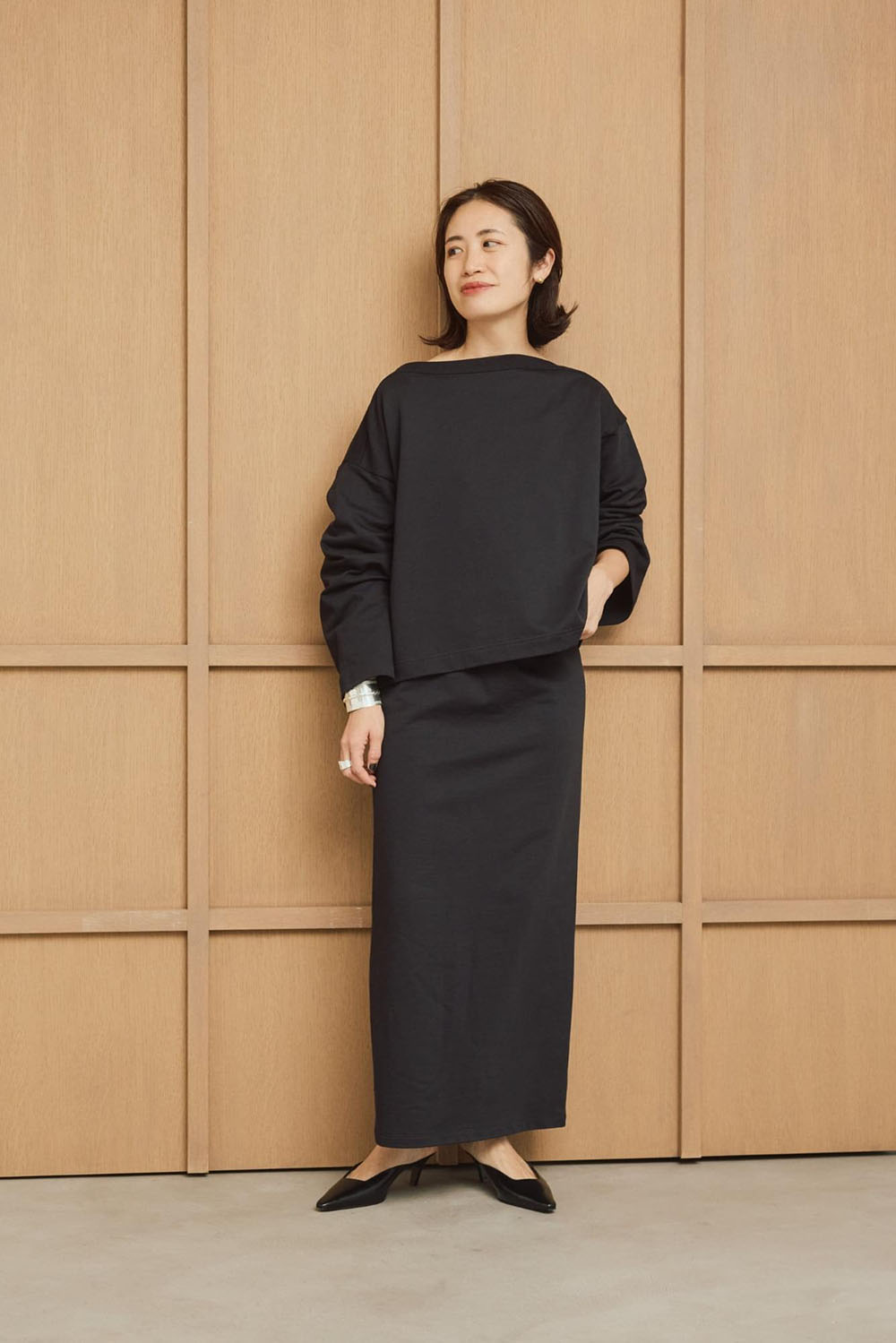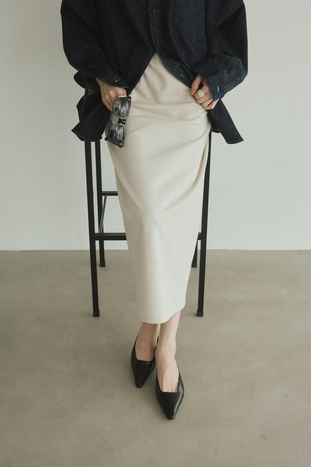 綿と再生ポリエステルをブレンドしたサスティナブルな新素材“インレー”を使用したトップスとスカートの 新鮮セットアップ。 生地は軽やかでドライな質感かつ程よいハリ感がプラスせれていて、フォルムを作り出し身体を美しく見せてくれます。スカートは動きやすく後ろのシルバージップがデザインポイントで素敵です。 シルバーのアクセを重ね付けして春の軽快なスカートスタイリングが完成します。