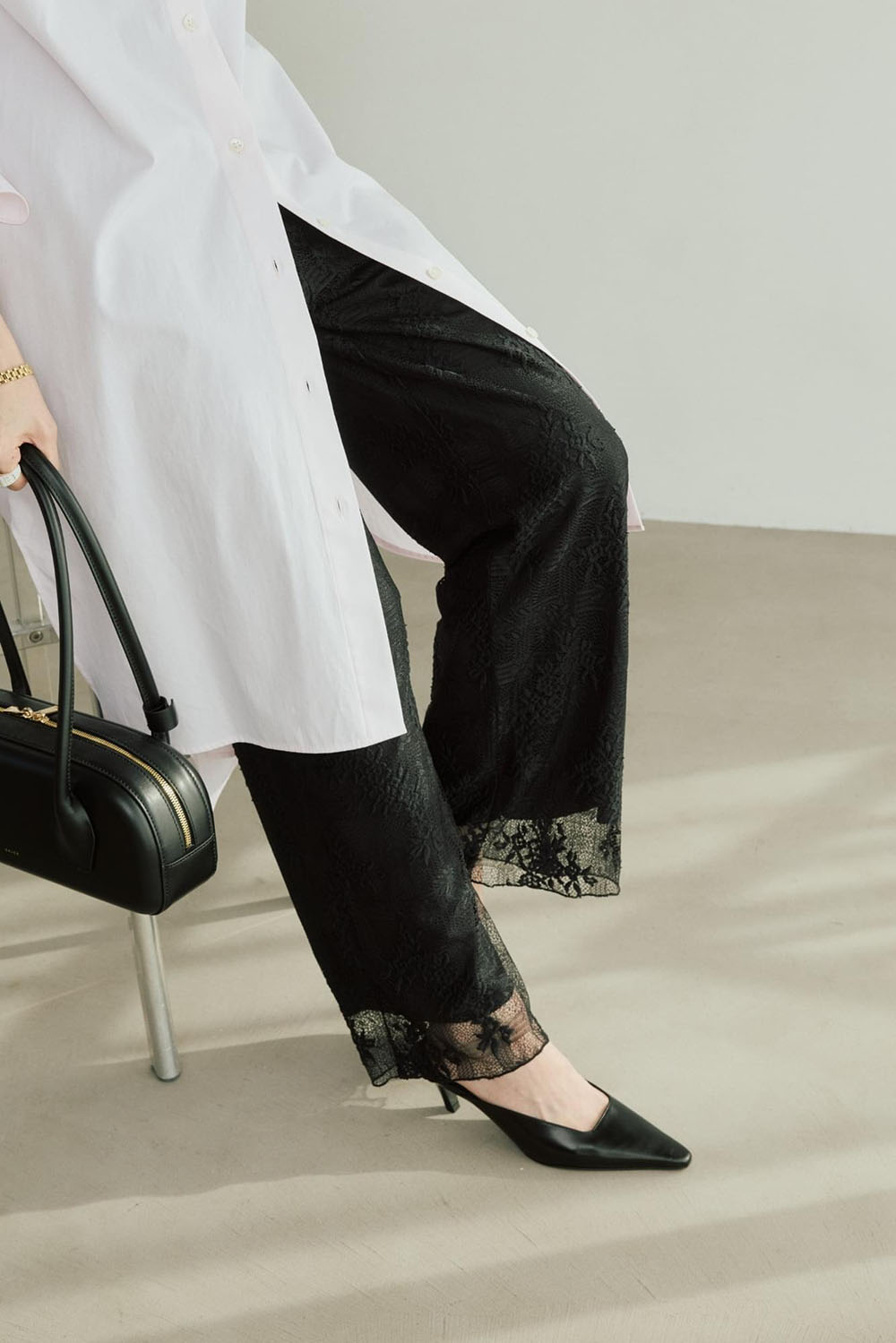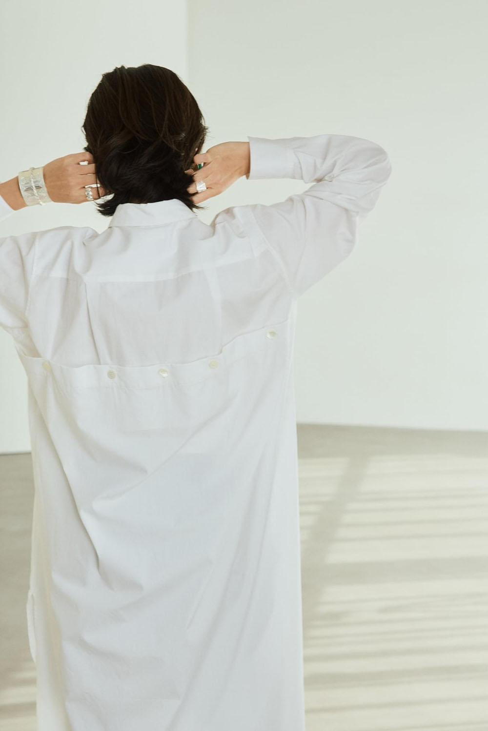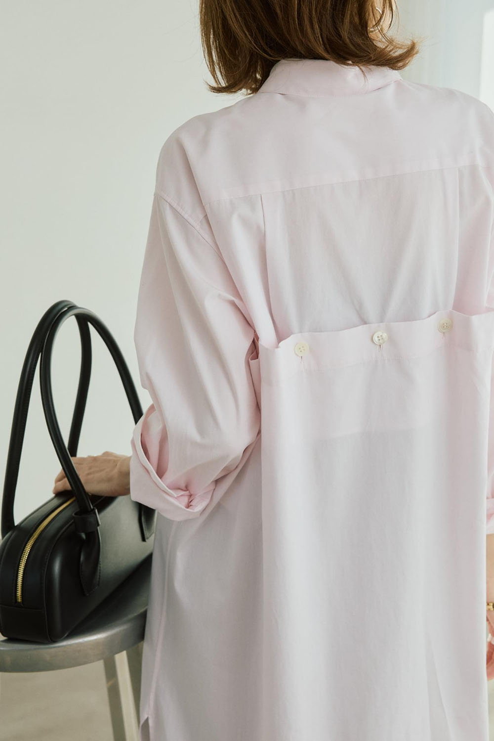 バックスタイルのデザインがほんのりモードで、印象的な上質なコットン仕立てのロングシャツドレス。この春、大人がチャレンジできる甘くないシャーベットピンクが新鮮。黒のレースパンツと合わせてPINK×BLACKの繊細かつモードな色の掛け合いを楽しんで。