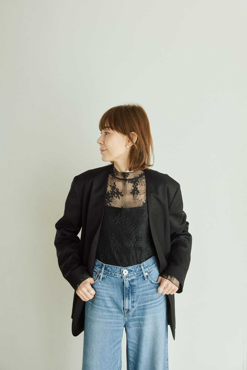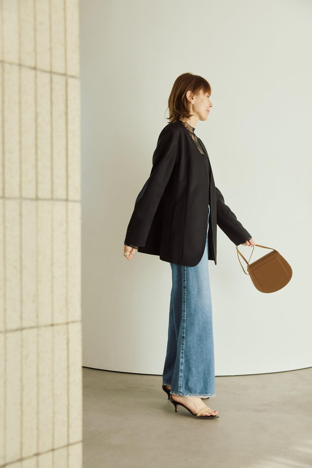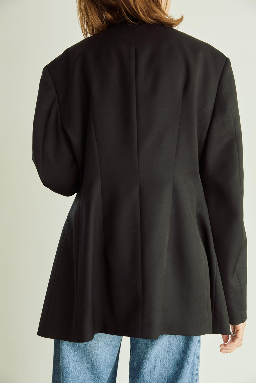 トリアセテートとウールを掛け合わせたハイブリッド素材が生み出すほどよい落ち感とドライな風合いが新鮮。 特徴的なのはウエストラインをさりげなくシェイプし、後ろにいれたさりげなく構築的なデザインが華やかかつ スッキリ見えが叶う。今シーズンの進化系ノーカラージャケットです。 トップスはレースブラウスを選び、シックにまとめて。ボトムはトレンド感あるワイドなデニムでアレンジを。