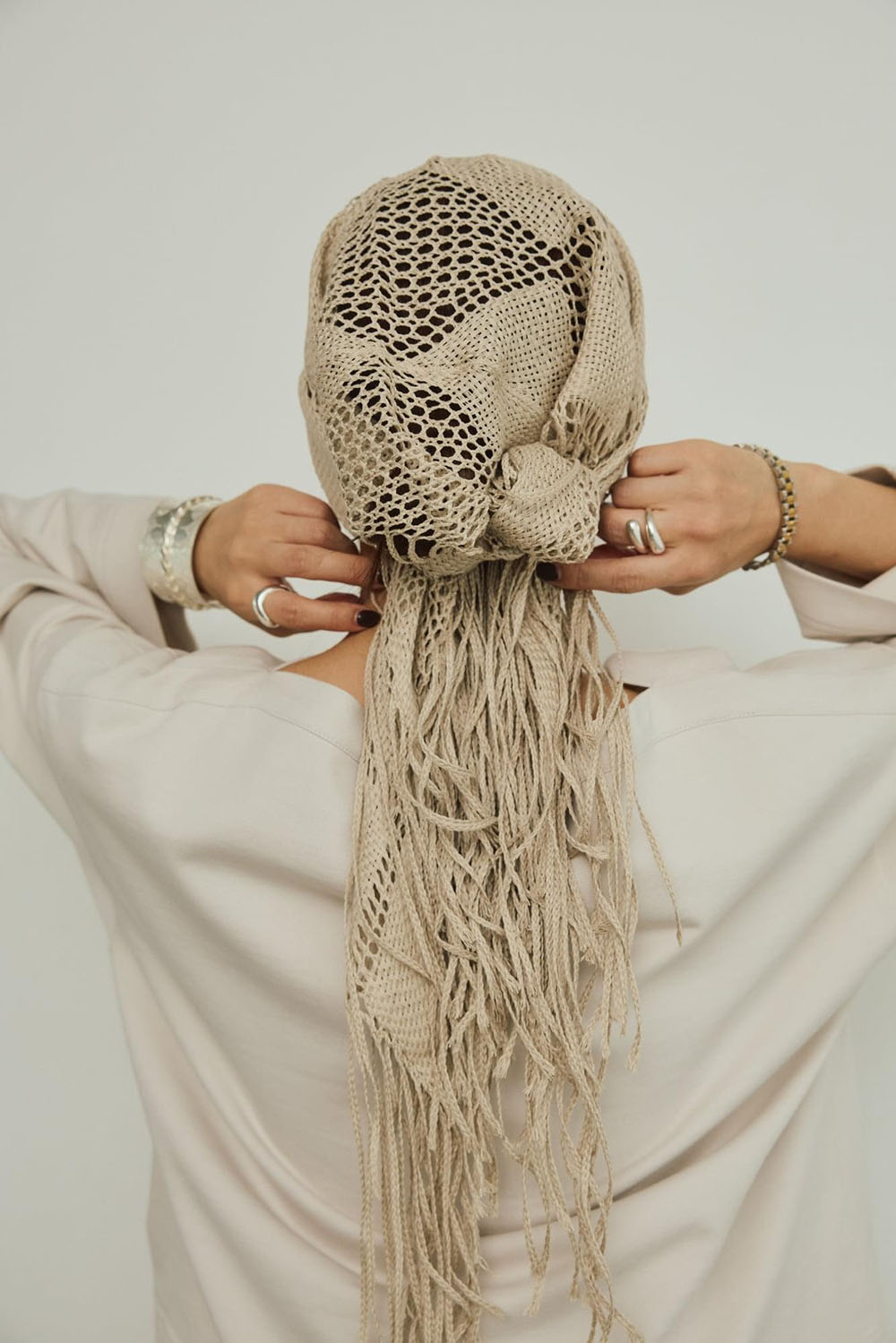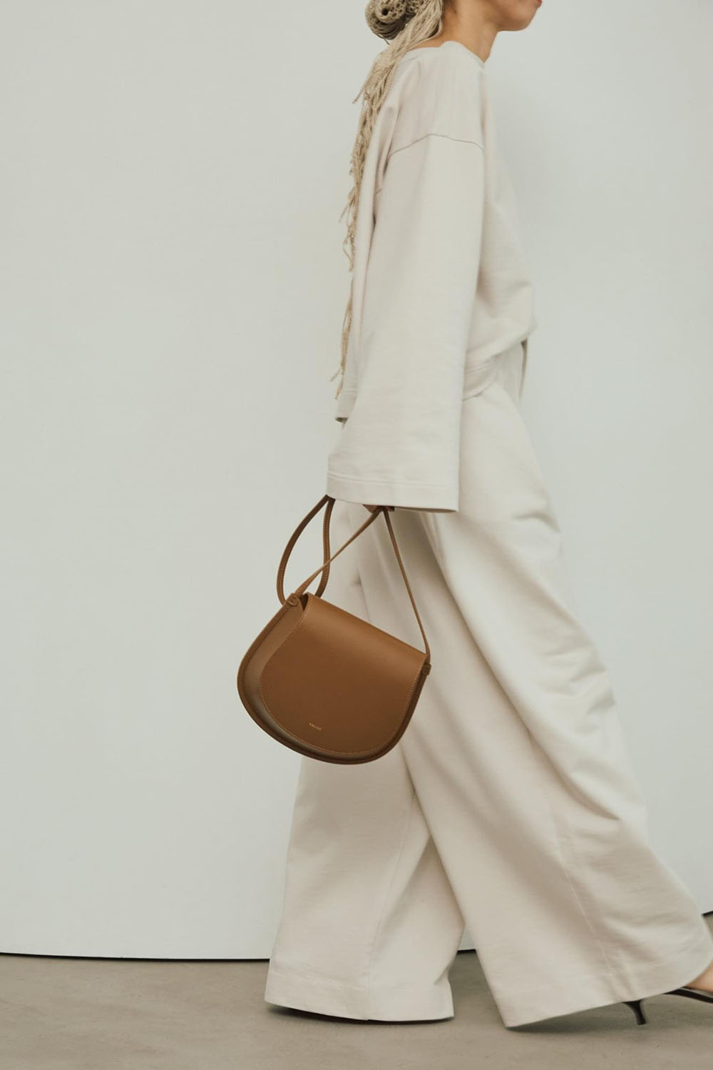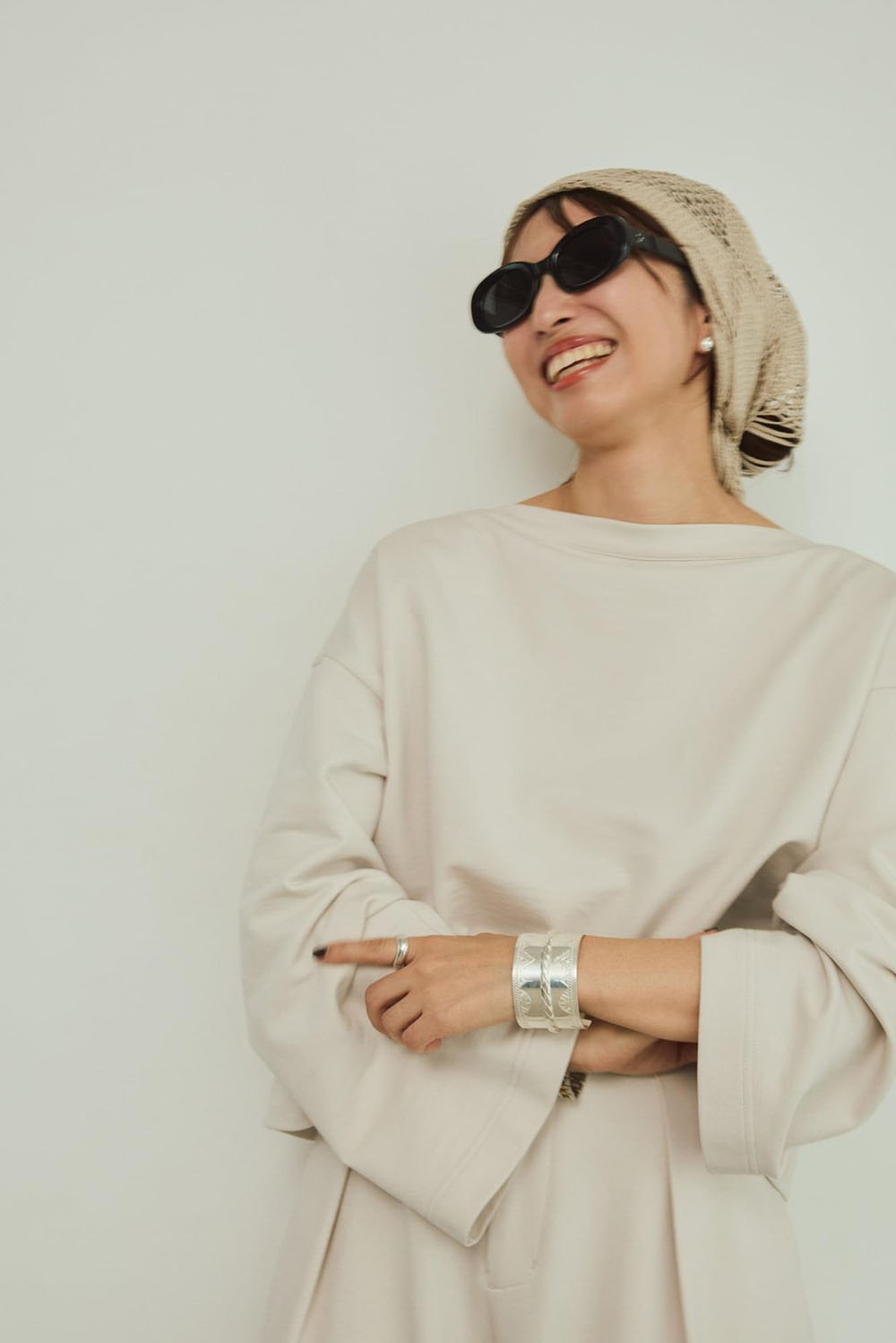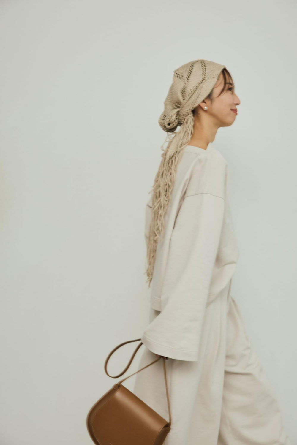 綿と再生ポリエステルをブレンドしたサスティナブルな新素材“インレー”を使用した新鮮セットアップ。 生地は軽やかでドライな質感かつ程よいハリ感がプラスせれていて、フォルムを作り出し身体を美しく見せてくれます。ゆったりとしたラウンドスリーブとコンパクトな着丈のトップスとカーブなシルエットのワイドパンツがでモードなフォルムが出るセットアップです。 ASAUCE MELER(アソースメレ)の同系色メッシュのスカーフでearthyなスタイリングにも。