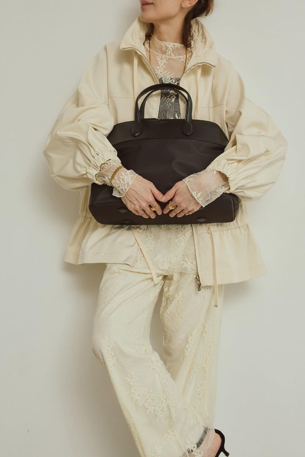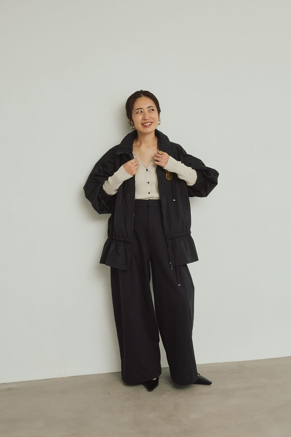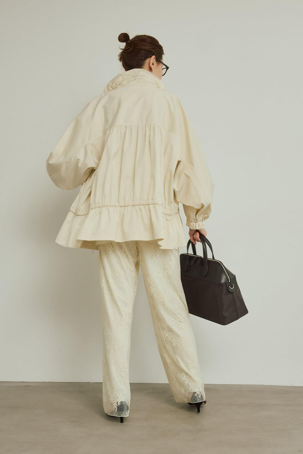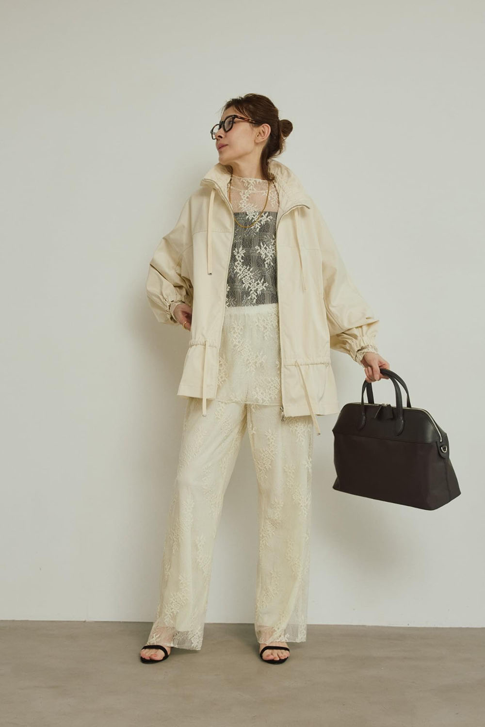 今シーズン1枚は持っていたい上品でモードなイージーパンツ。ワイド過ぎないすっきりシルエットが、脚長効果も期待できます。同素材のレースブラウスでセットアップとしてスタイリングしても素敵です。 特に今シーズンはミルキーなオフホワイトが大人の肌を美しくシャレ見えしてくれます。 思いきってブルゾンもオフホワイトを選んで素材ミックスのワントーンコーデも注目のスタイリングです。