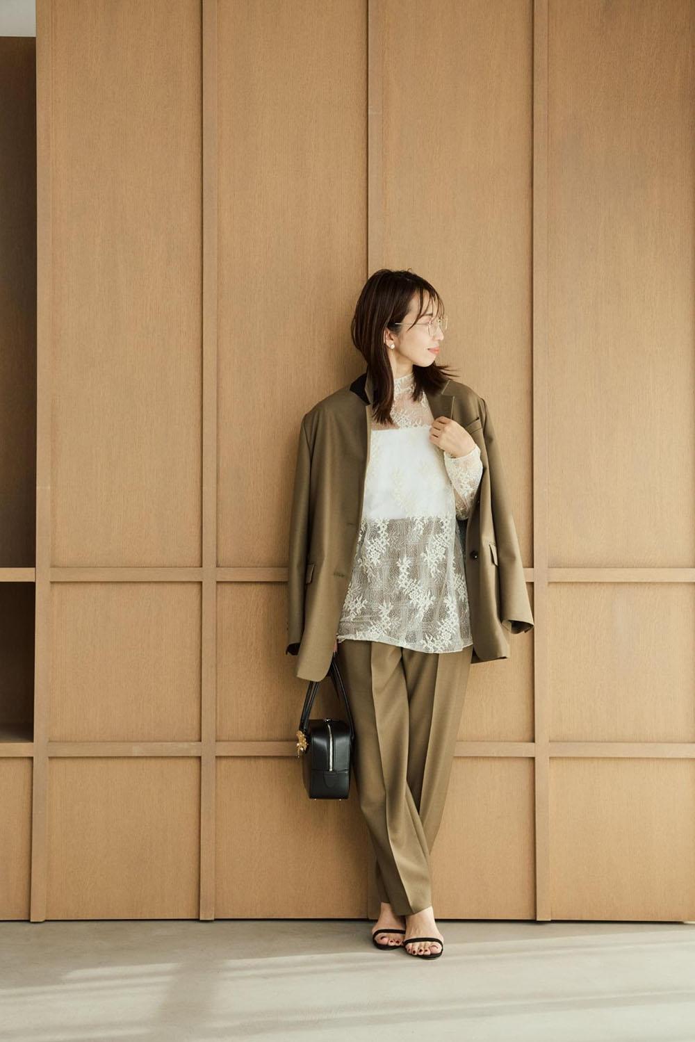 さっと羽織るだけでサマになるテーラードジャケットとパンツのセットアップ。 ウール100%の糸を3本強撚に撚り合わせて織り上げた、シャリ感のある素材が特徴。 軽やかなニュアンスカラー、カーキをトレンドのレースブラウスにあわせると、 アクセ使いも楽しくなります。