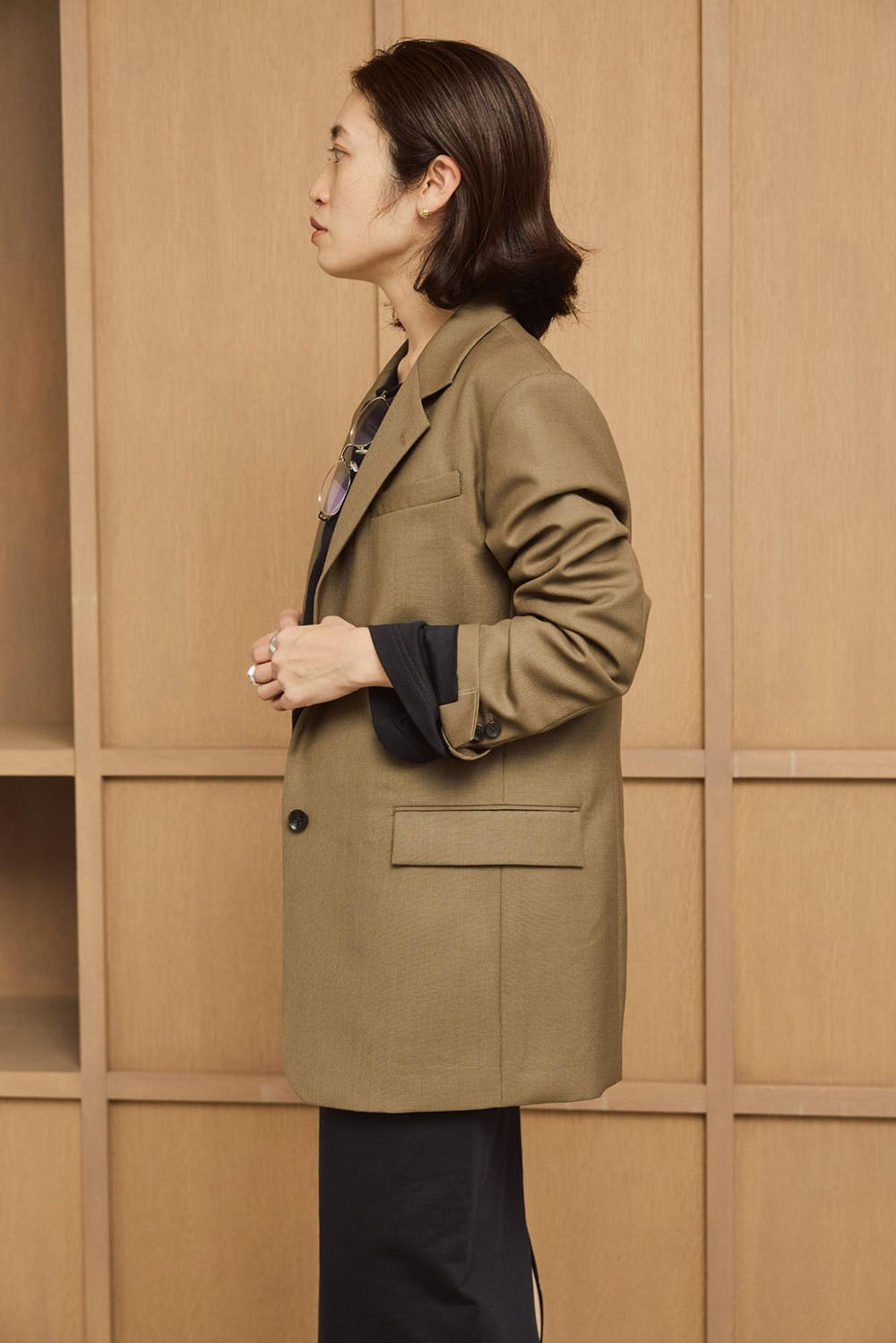 メンズライクな中にも女性らしさがしっかりとある注目のジャケット。 ウール100%の糸を3本強撚に撚り合わせて織り上げた、シャリ感のある素材も魅力的です。 軽やかなカーキはさっと羽織るだけで、スタイリングに抜け感をプラスしてくれます。
