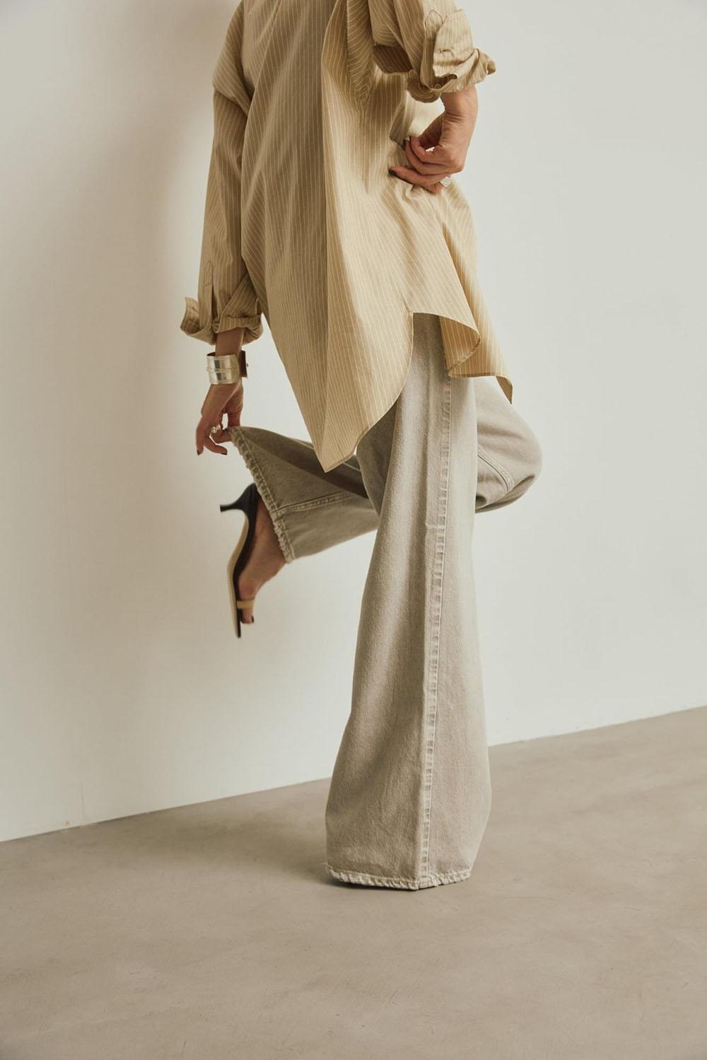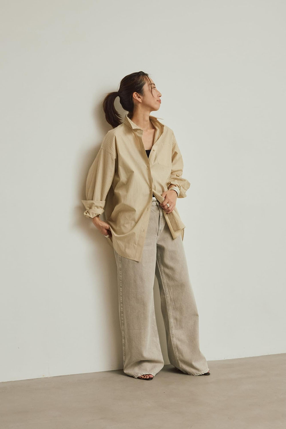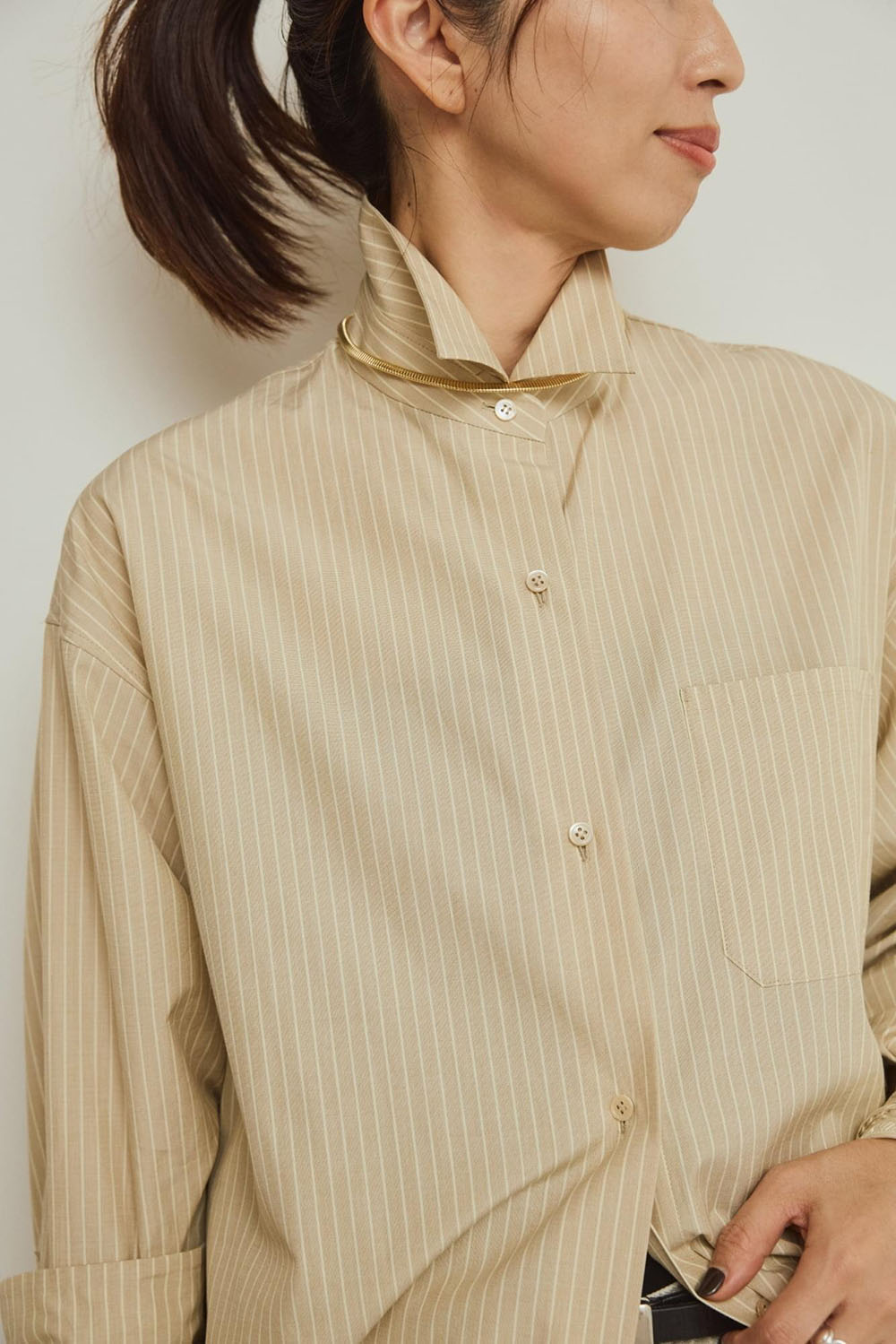 ベーシックながら計算されたシルエットの新レギュラーシャツのストライプ。 ベージュのストライプが新鮮です。 この春、注目のグレーデニムと合わせるだけで一気に今年のスタイリングに。