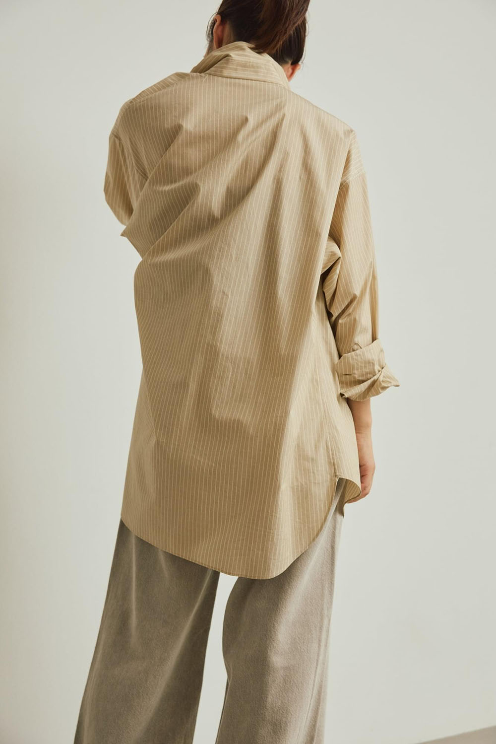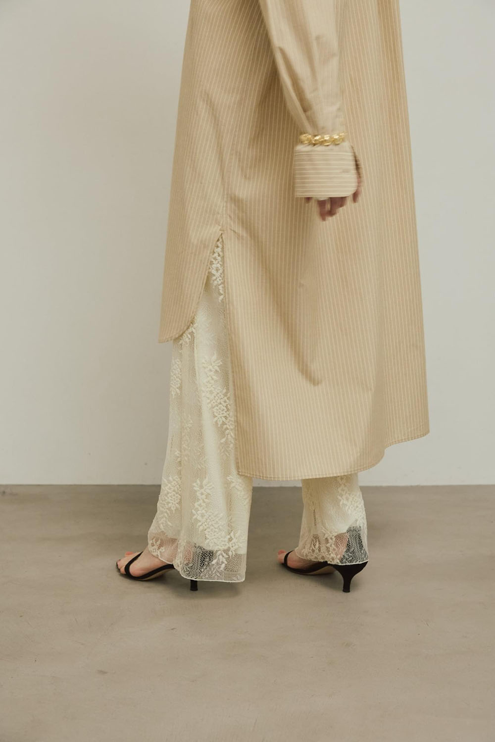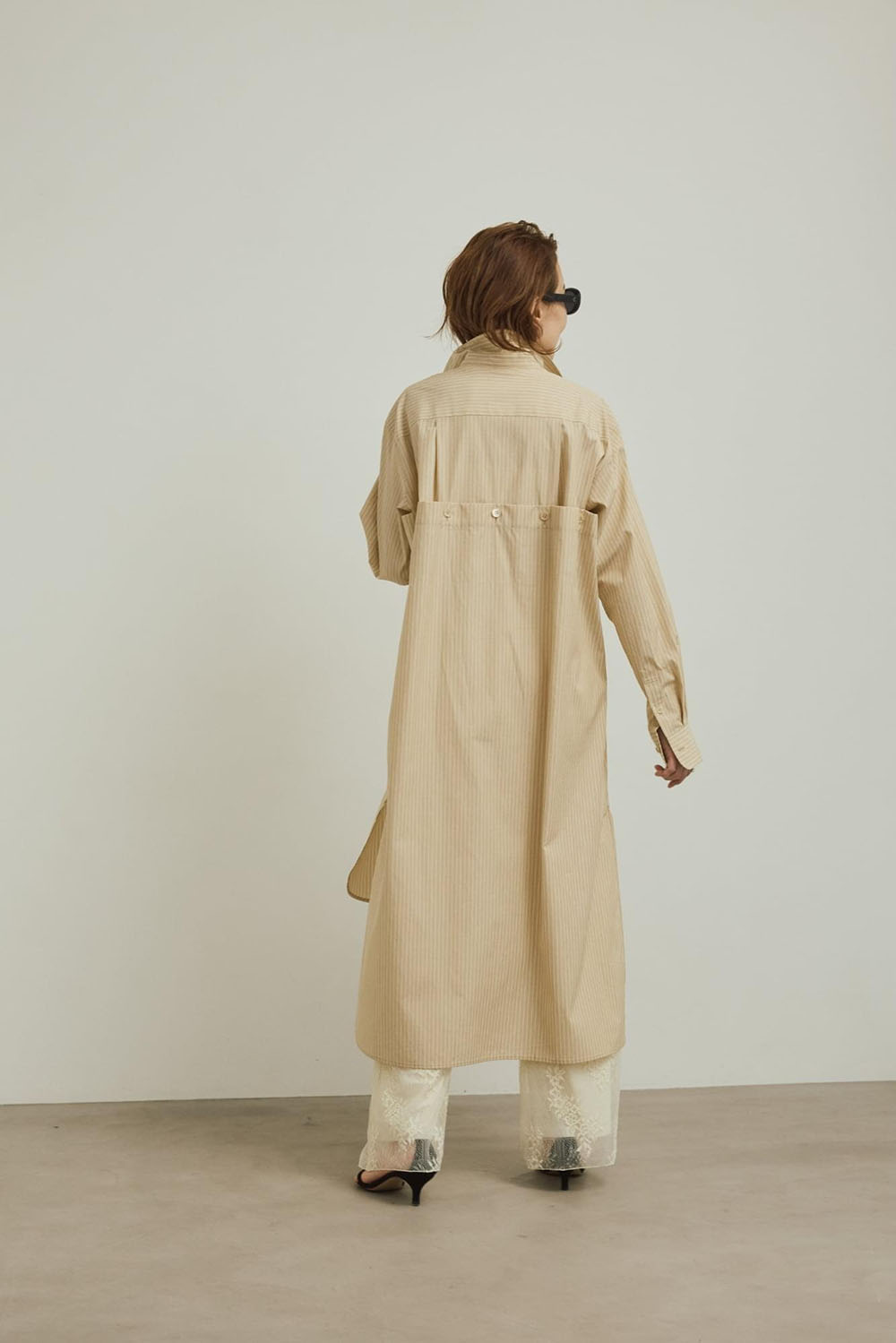 バックスタイルのデザインがほんのりモードで、印象的な上質なコットン仕立てのロングシャツドレスのストライプバージョン。 注目のベージュストライプは、ミルキーなオフホワイトのレースパンツと華やかでモードなスタイルに。