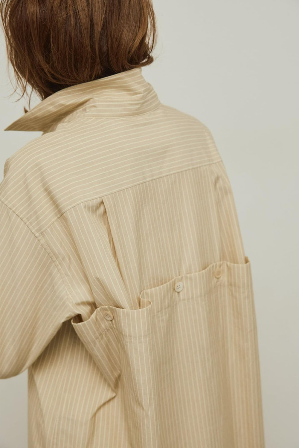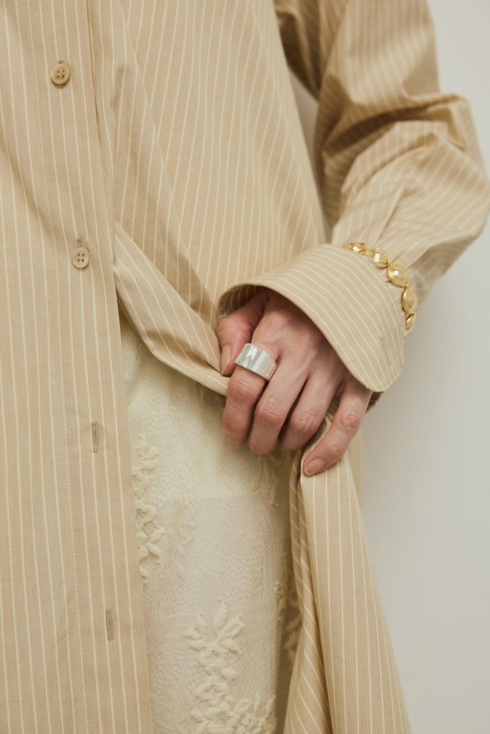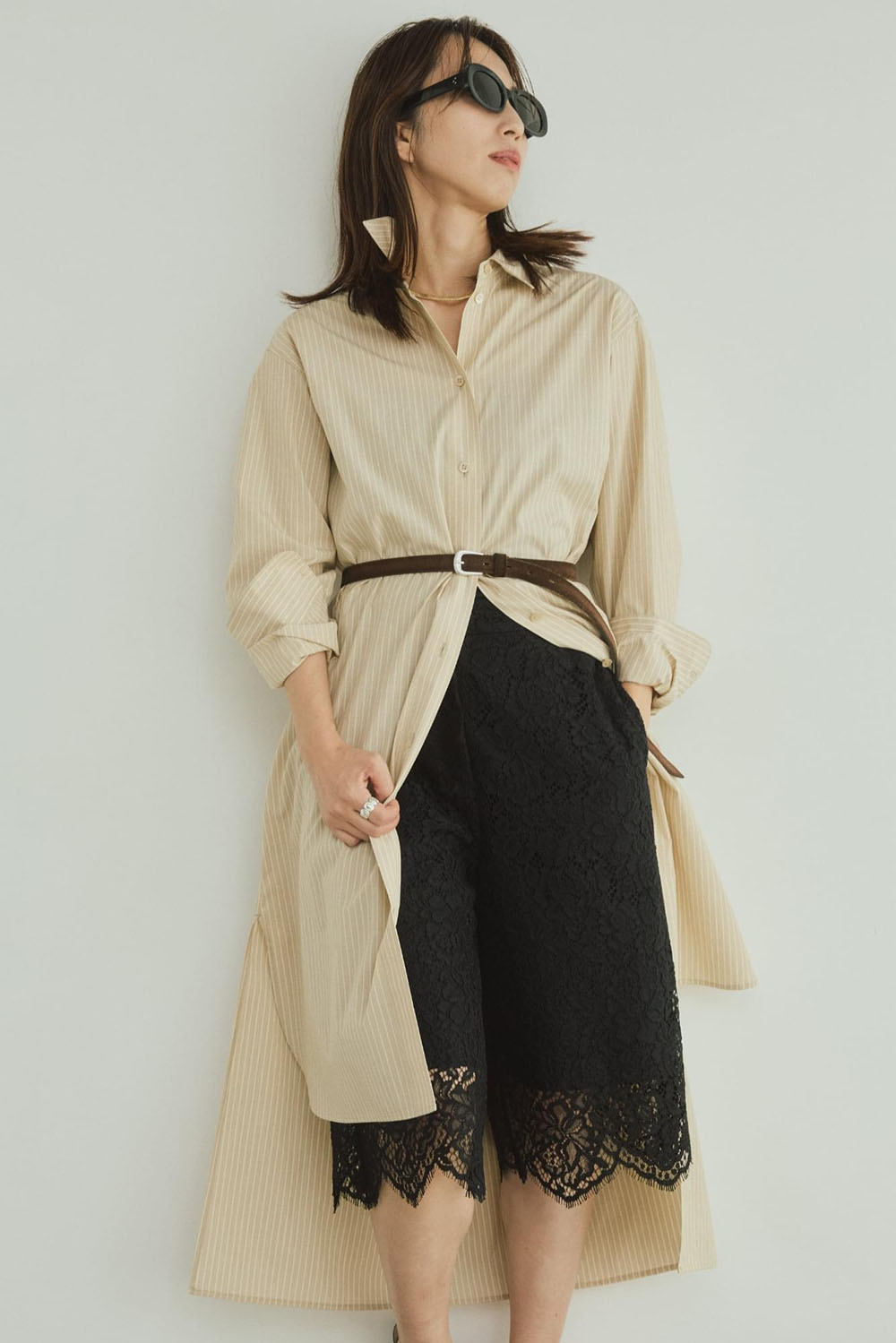 バックスタイルのデザインがほんのりモードで、印象的な上質なコットン仕立てのロングシャツドレスのストライプバージョン。 注目のベージュストライプは、ミルキーなオフホワイトのレースパンツと華やかでモードなスタイルに。