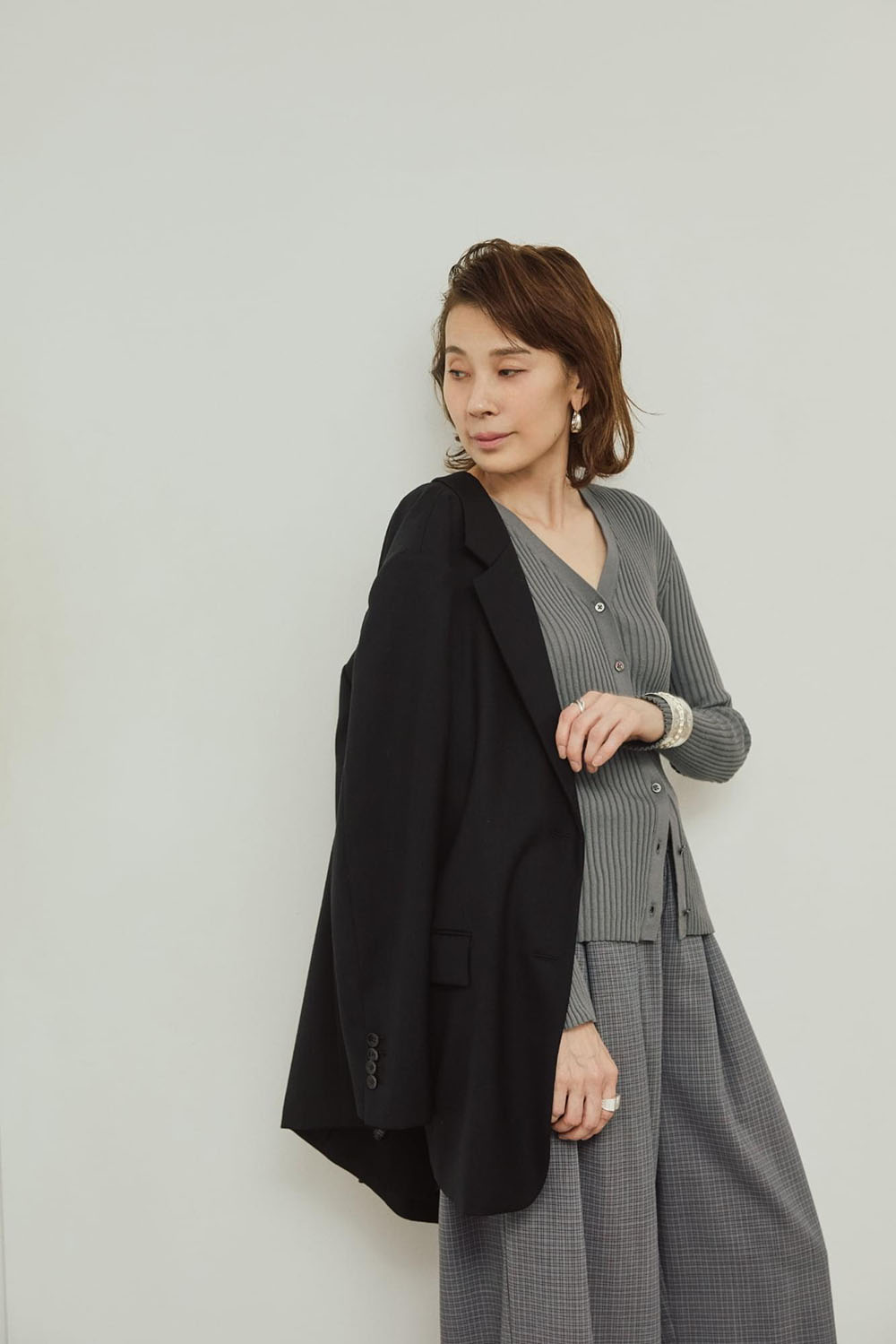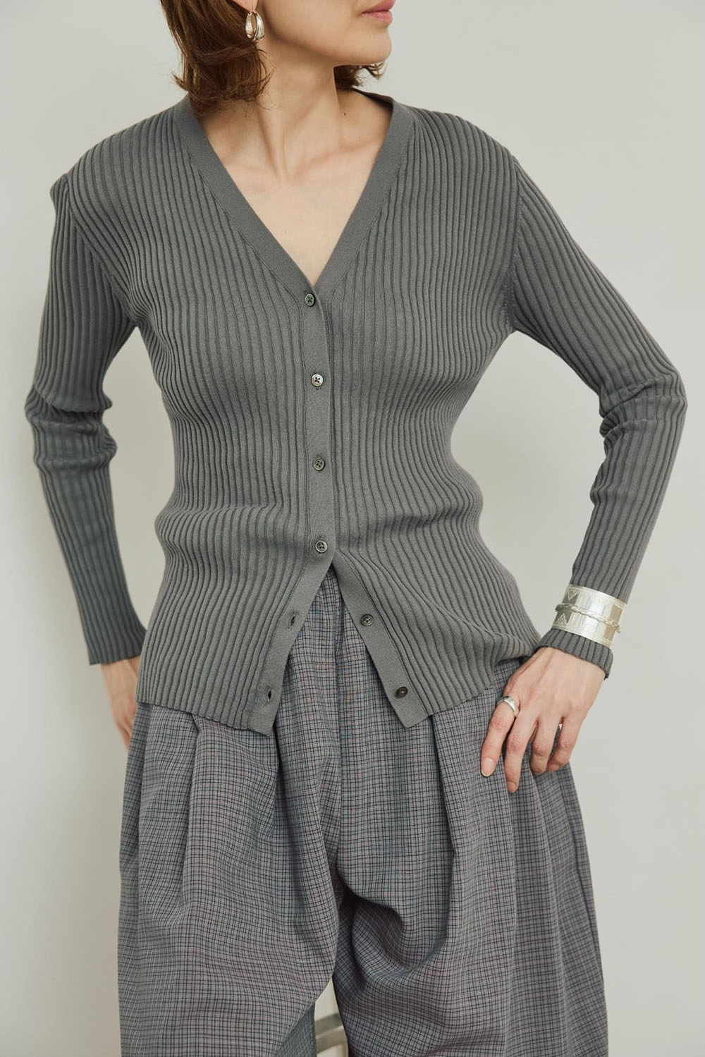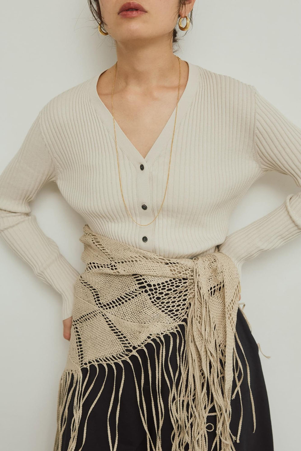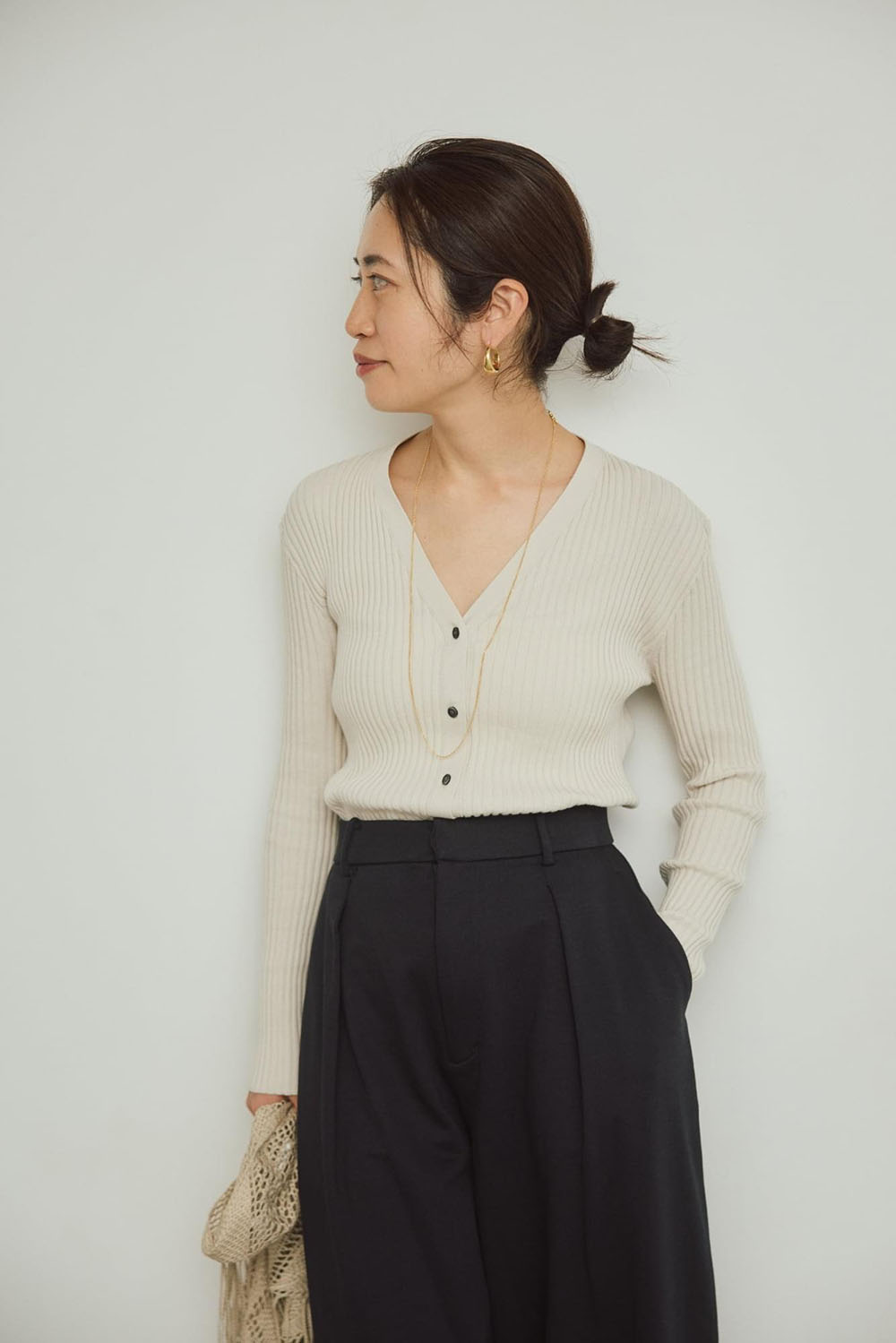 上質なイタリア糸で編み立てたイタリアヤーンリブニットシリーズ。 綿100%ならではの柔らかな風合いと、リブ編みが生み出す程よいフィット感が、シャープで女性らしいシルエットを作ります。リブのピッチの変化で、視覚的なメリハリが出るのが嬉しいポイント。 今シーズンは同系色の小物でアレンジしていつものスタイリングをブラッシュアップ。