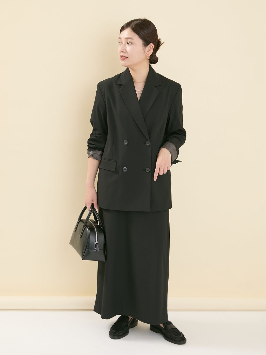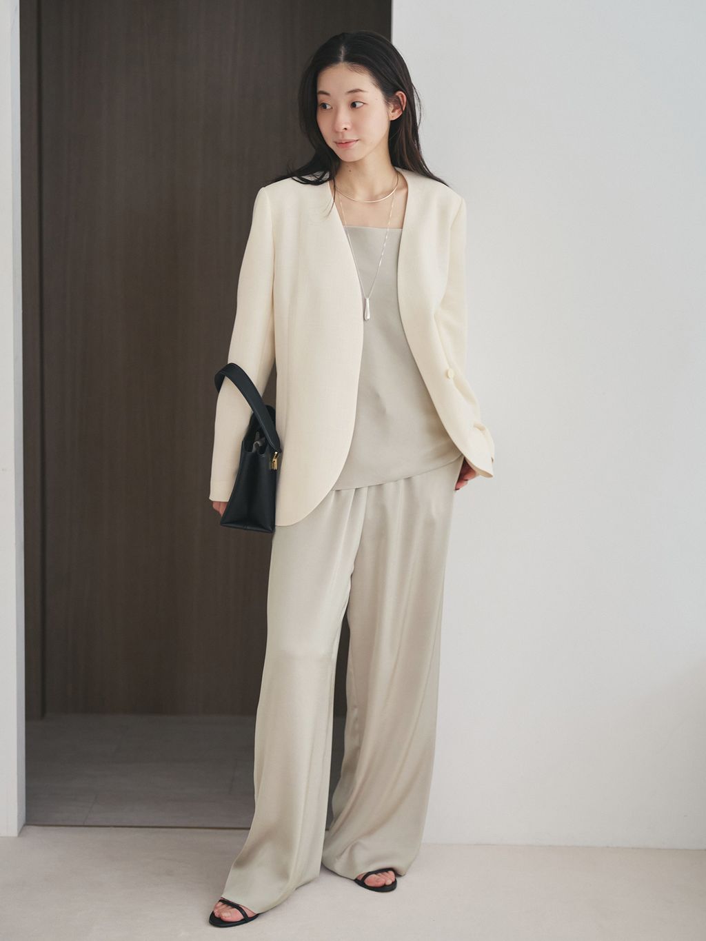 オフホワイトでまとめたスタイルは、柔らかく明るい印象に。袖にパフ感のあるジャケットが程よい甘さを添え、白の中でも素材感に変化をつけることで奥行きのあるコーディネートに仕上がります。小物は黒で引き締めることで、甘くなりすぎず、大人の卒入園式スタイルとしてちょうどいいバランスに。