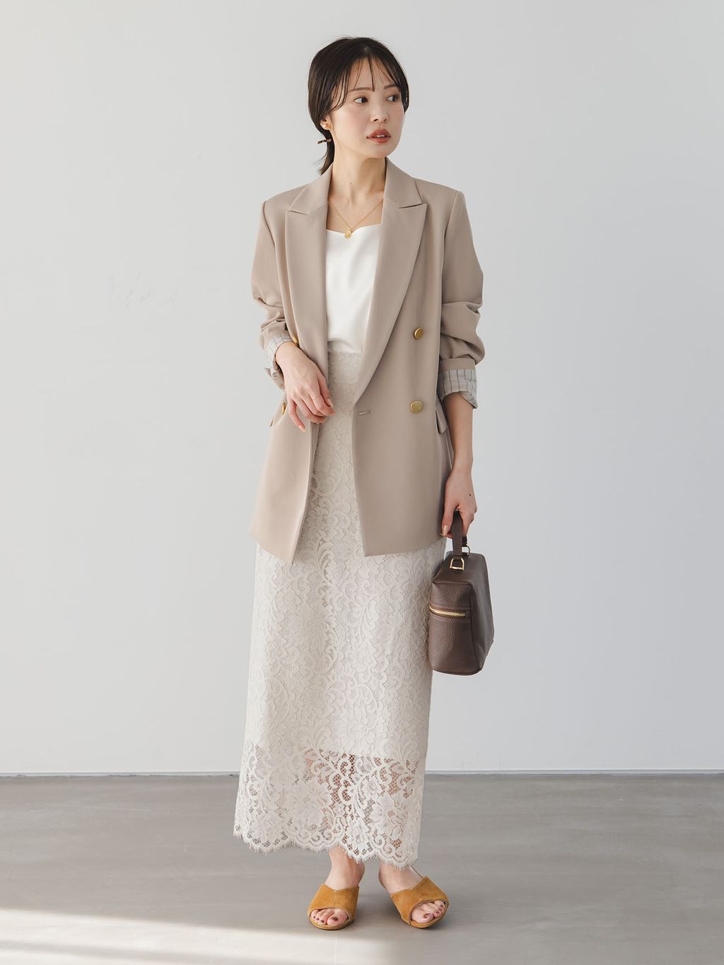 卒入園式では黒やネイビーを選ぶ方が多いからこそ、ベージュのセットアップはさりげなく差がつく選択。ややメンズライクな印象のセットアップも、インナーにレースを仕込むだけで一気にきちんと感が増し、女性らしい柔らかさもプラス。素材のツヤや柔らかさが出ることで、今っぽさのバランスも◎。程よく華やぎがあり、オケージョンシーンにも自然になじむスタイルです。