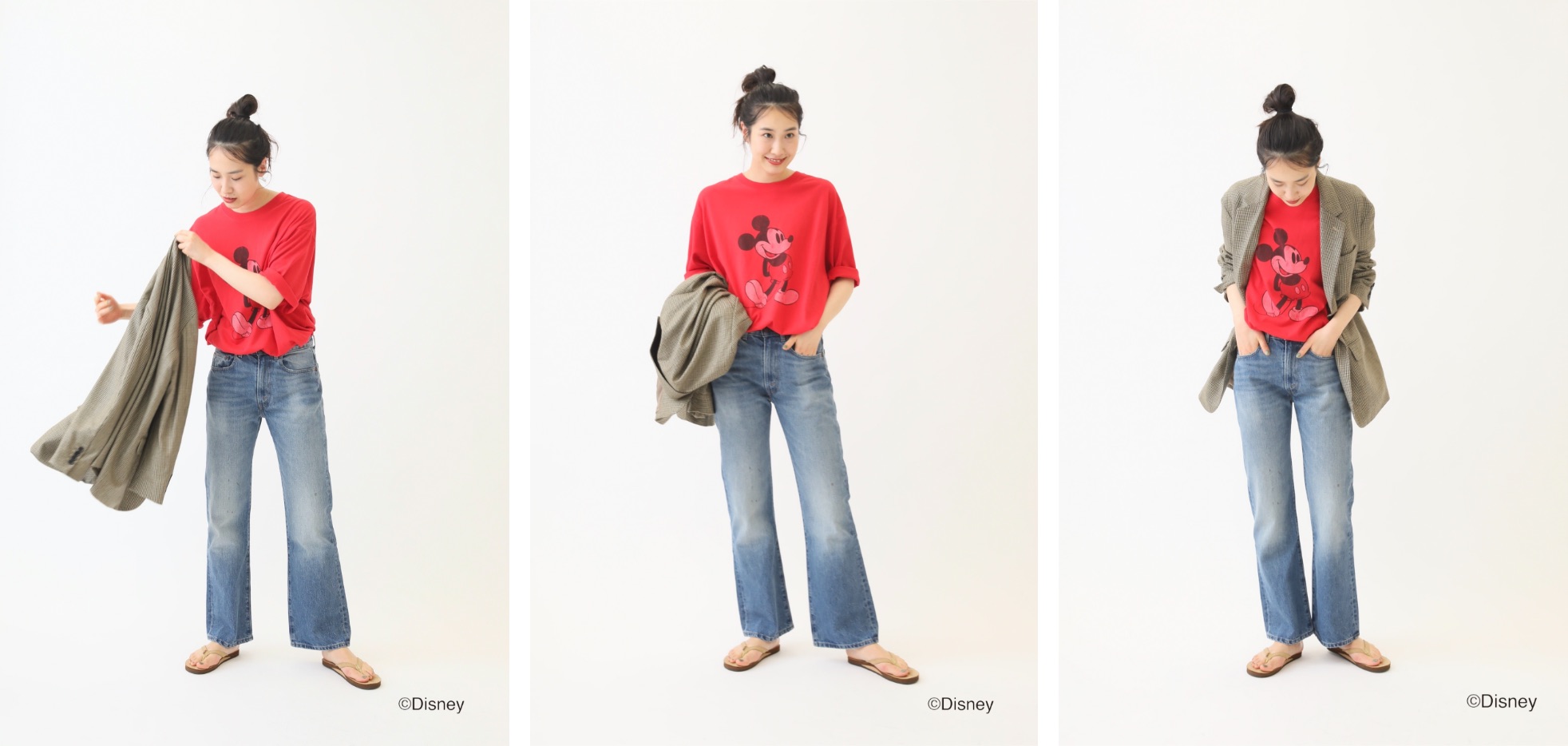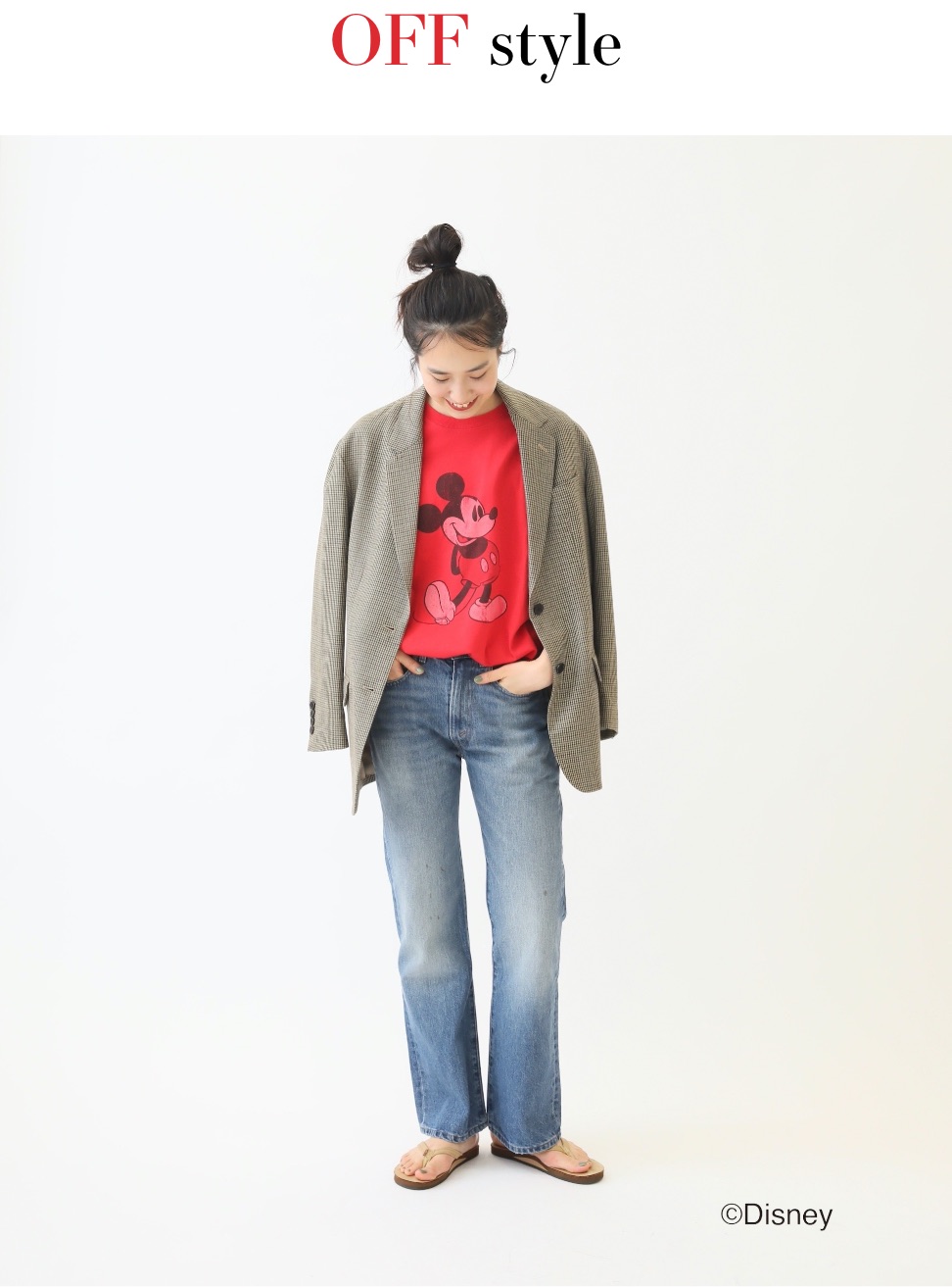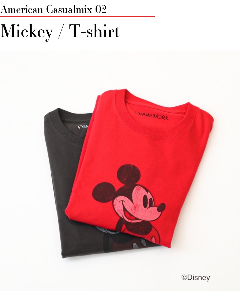 ジャケットを着てもプリントが見えてアクセントになるので遊び心のあるスタイリングに。 - FRAMeWORKMICKEY / BIG T◆¥9,900(税込)
