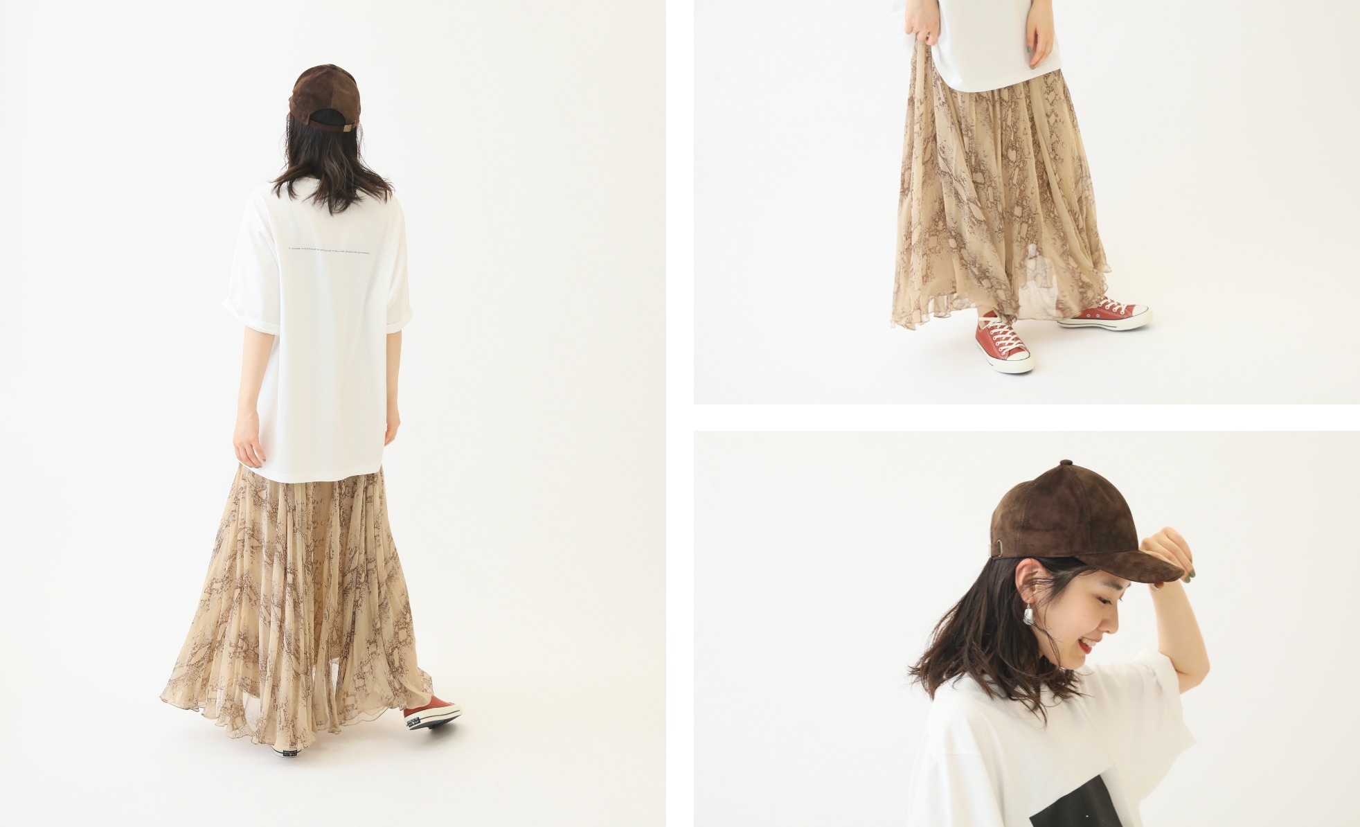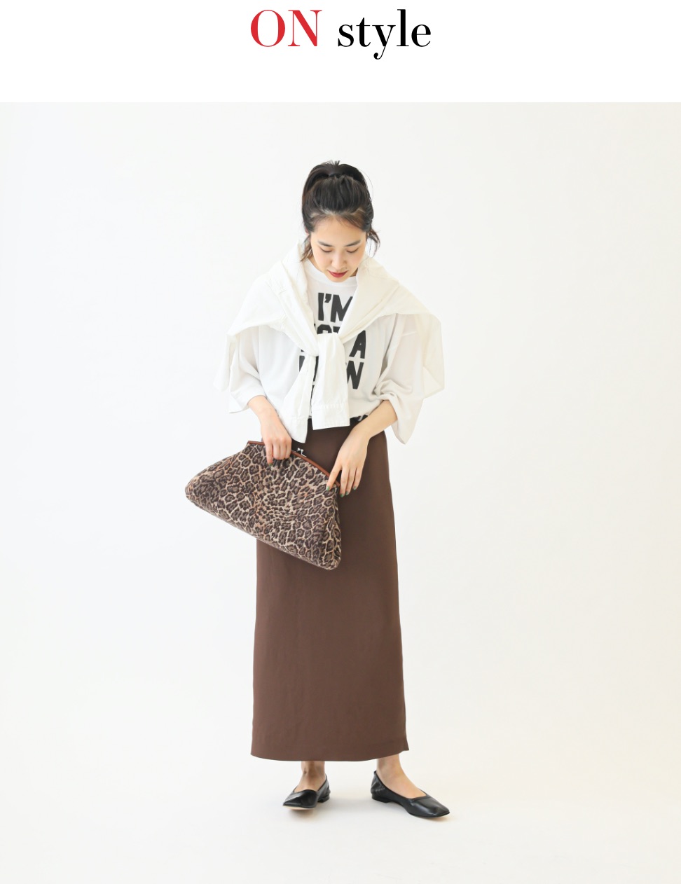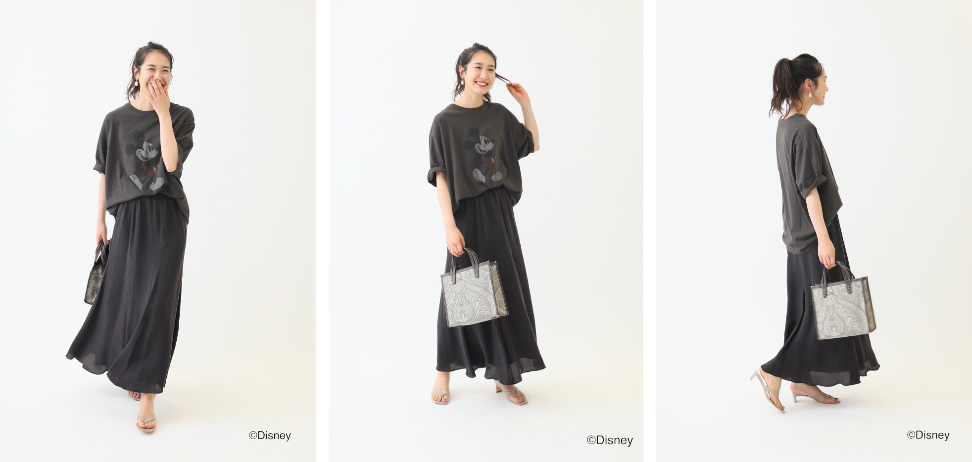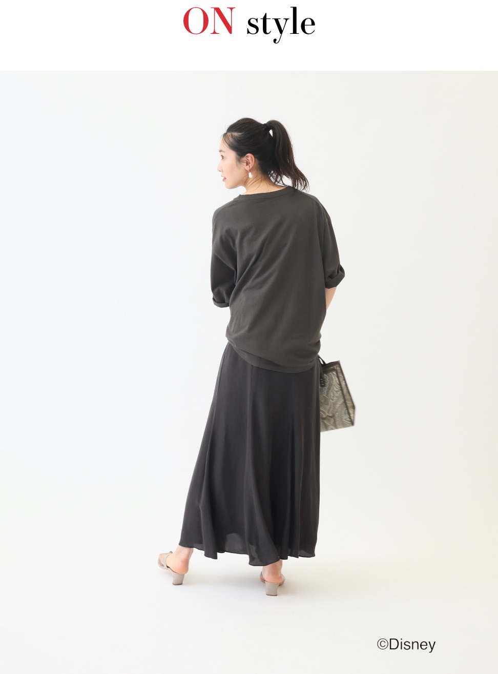 そんな方にはワントーンで合わせたスタイリングがオススメ。マーメイドのスカートを合わせることで上品なスタイリングに。 - FRAMeWORKMICKEY / BIG T◆¥9,900(税込)