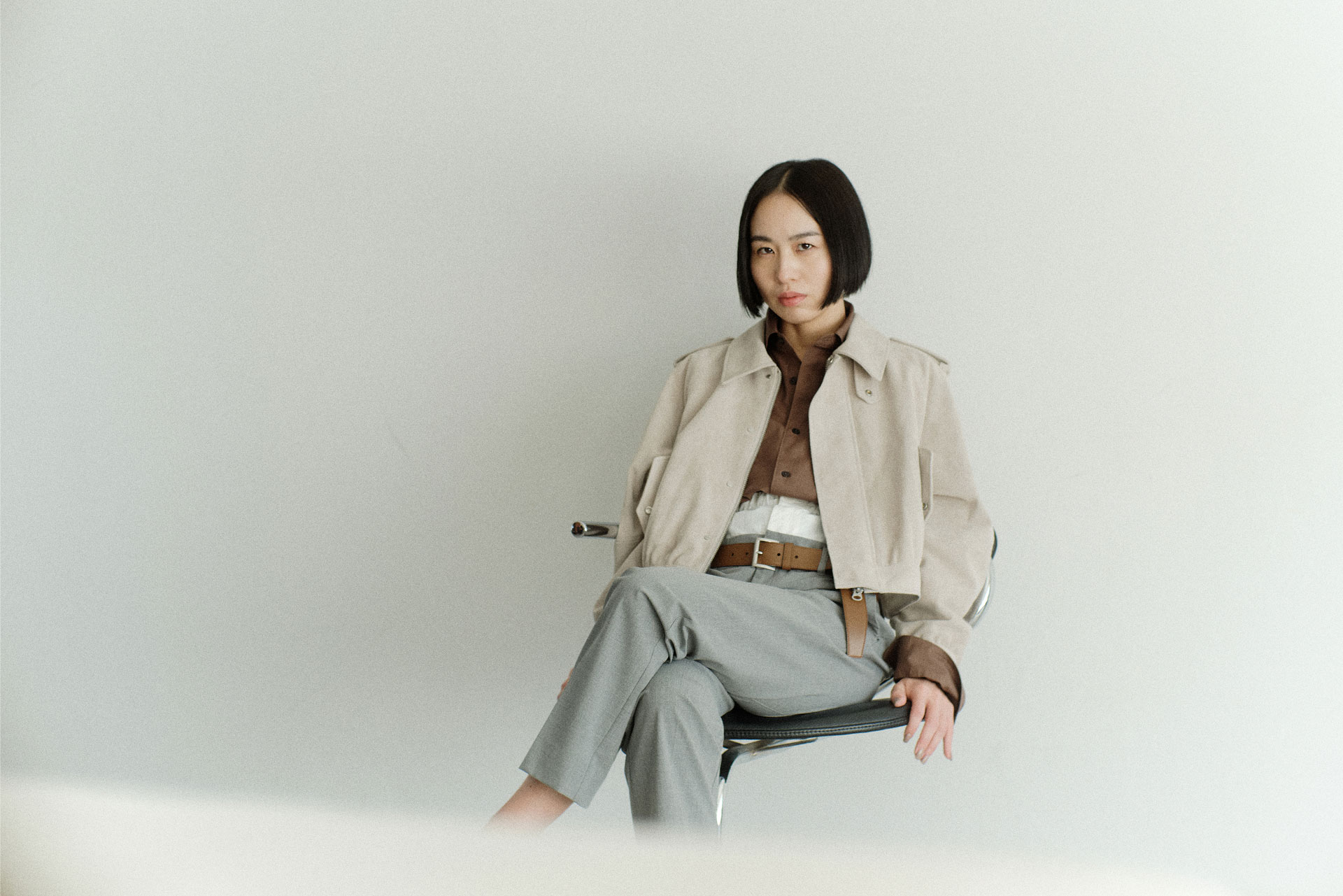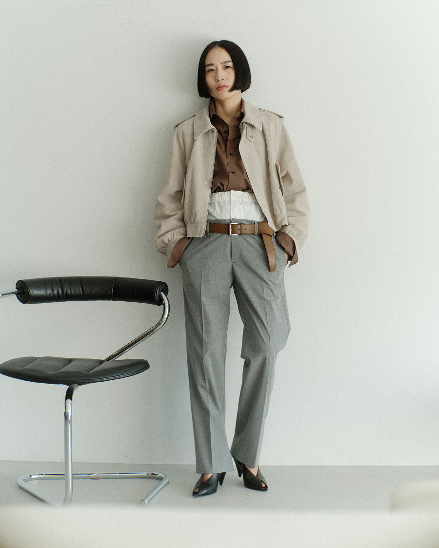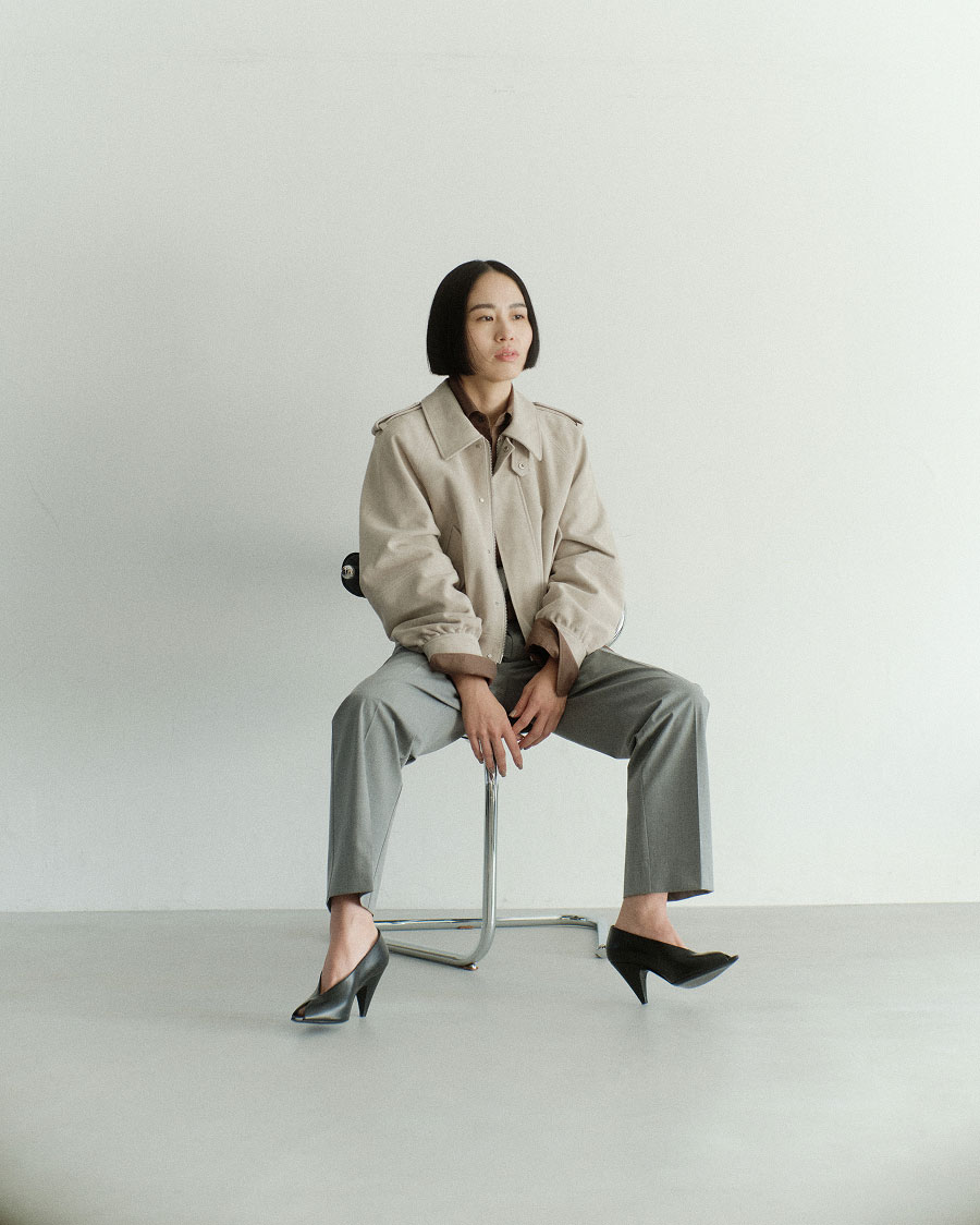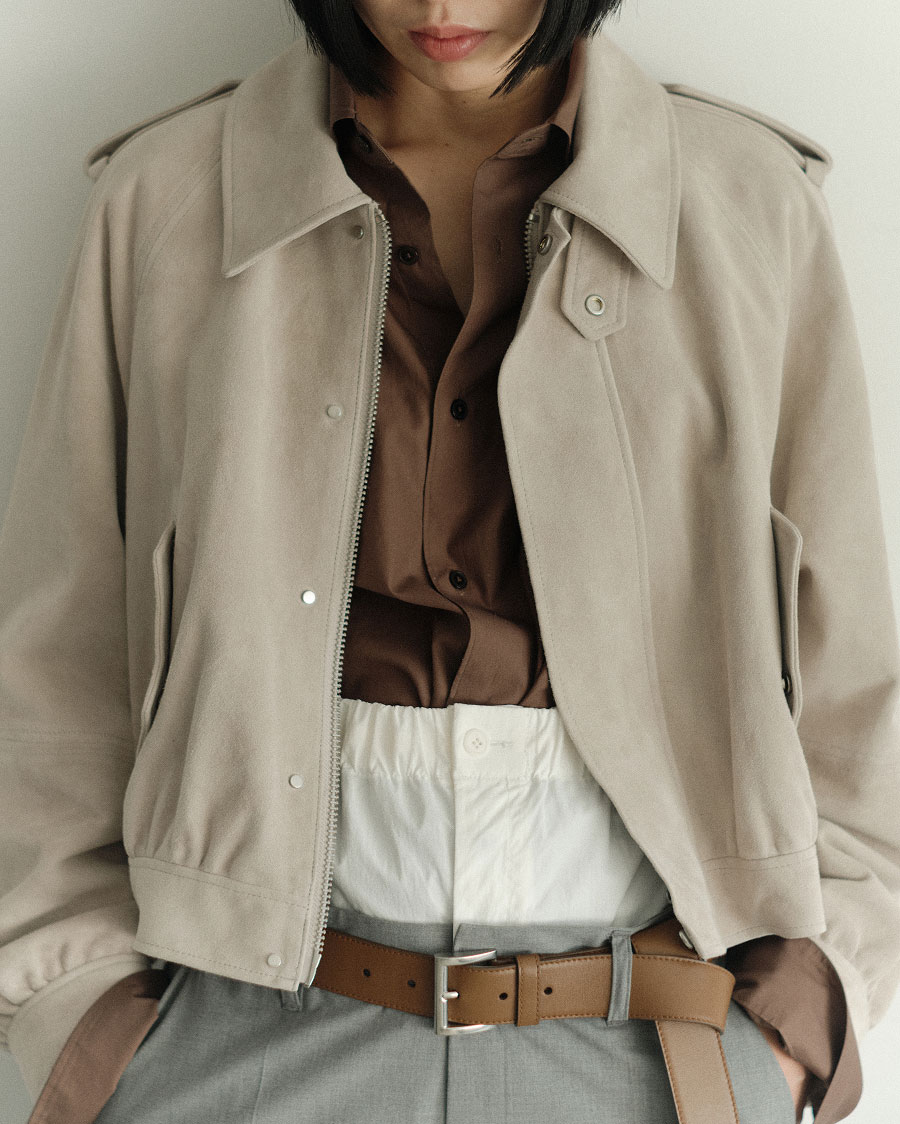 “スウェードブルゾンはあえてコンパクトなサイズ感で、後ろにボリュームを持たせて新鮮な印象に。グレージュはブラウン系のアイテムと好相性だし、デニムを合わせればマニッシュな着こなしも楽しめますよ”