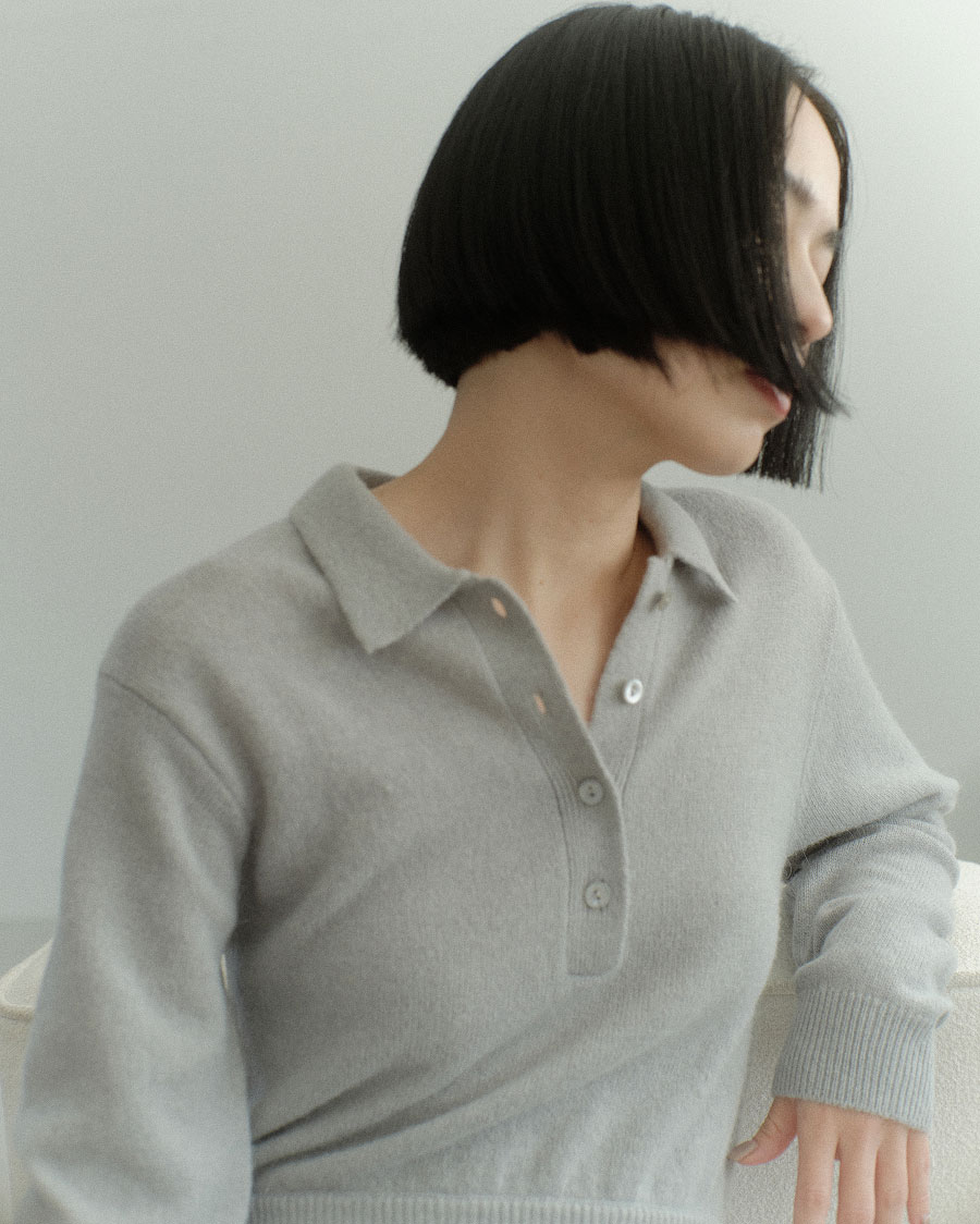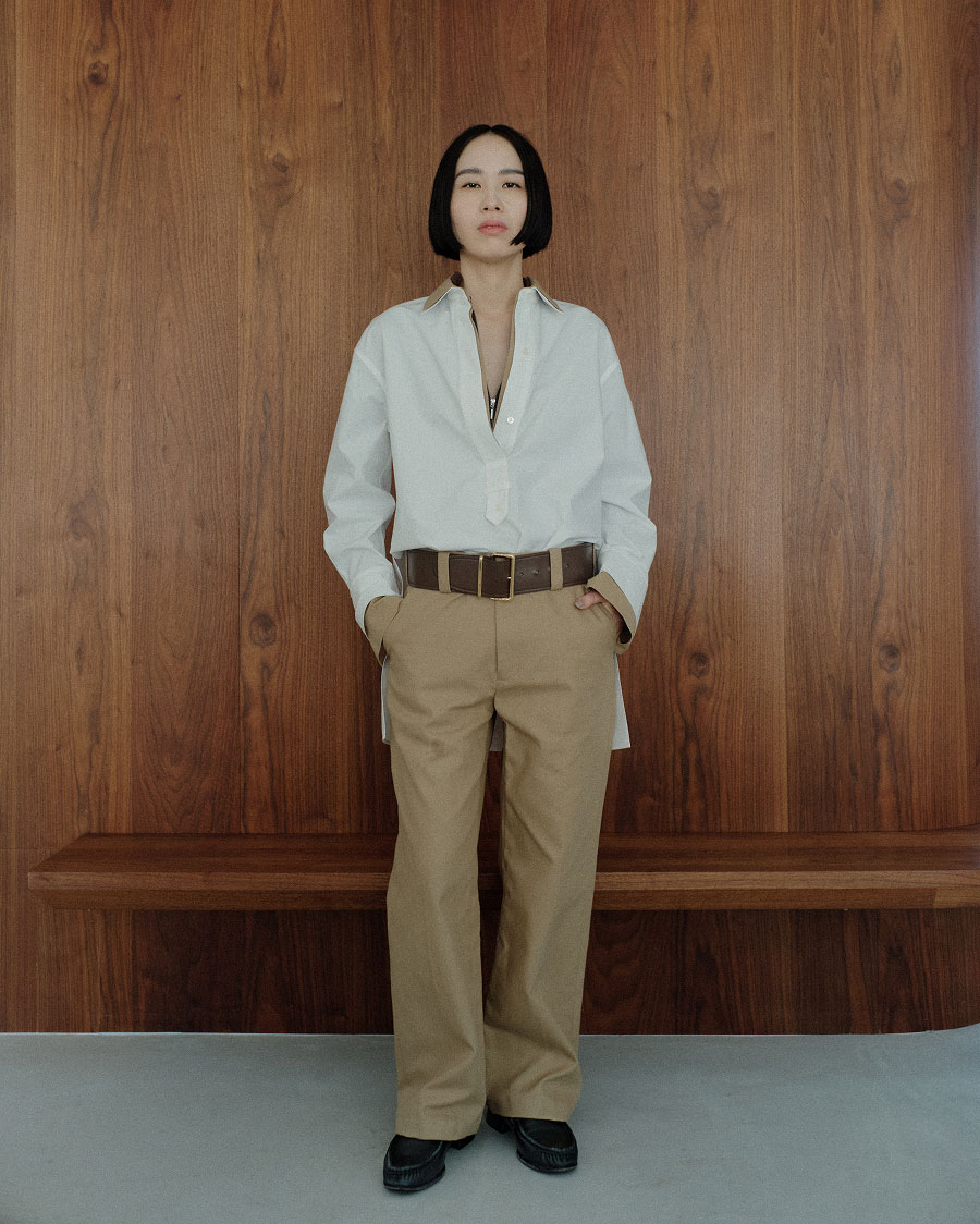 “シャツONシャツのスタイリングを1枚で楽しめるデザイン。襟は付け外し可能に。インしやすい深めのスリットや、スキッパー仕様でメンズライクに仕上げました。アウトにしてレギンスにも好相性な長めの着丈です”