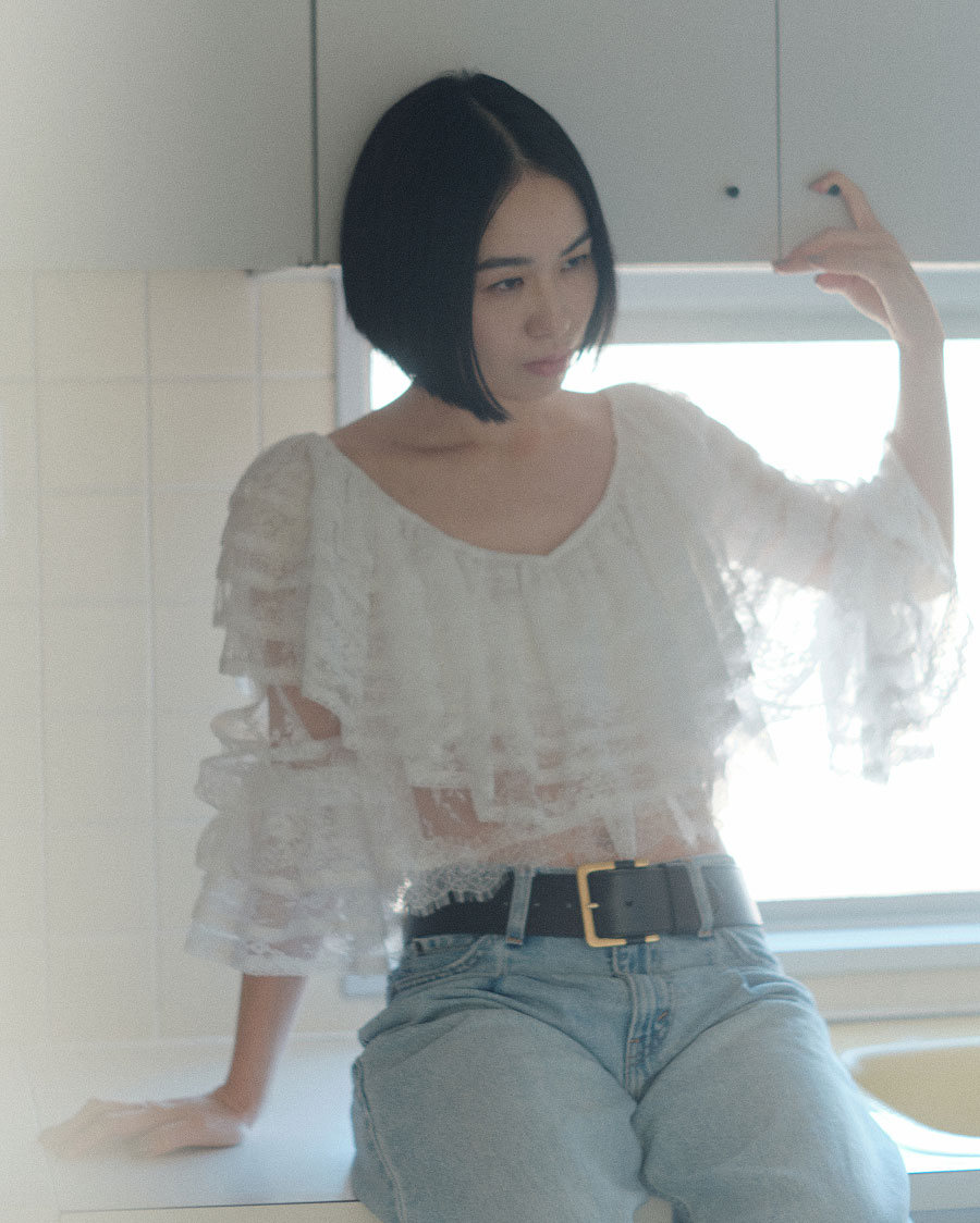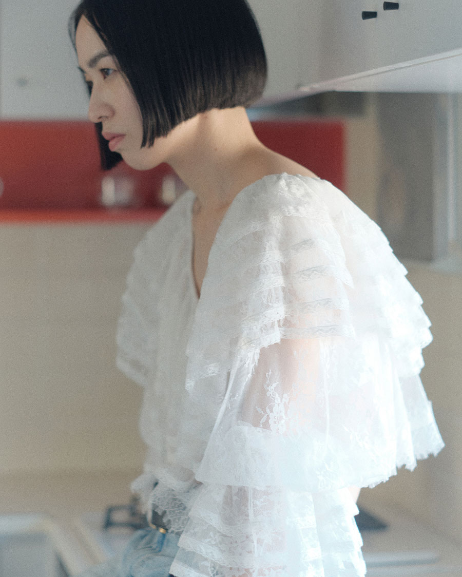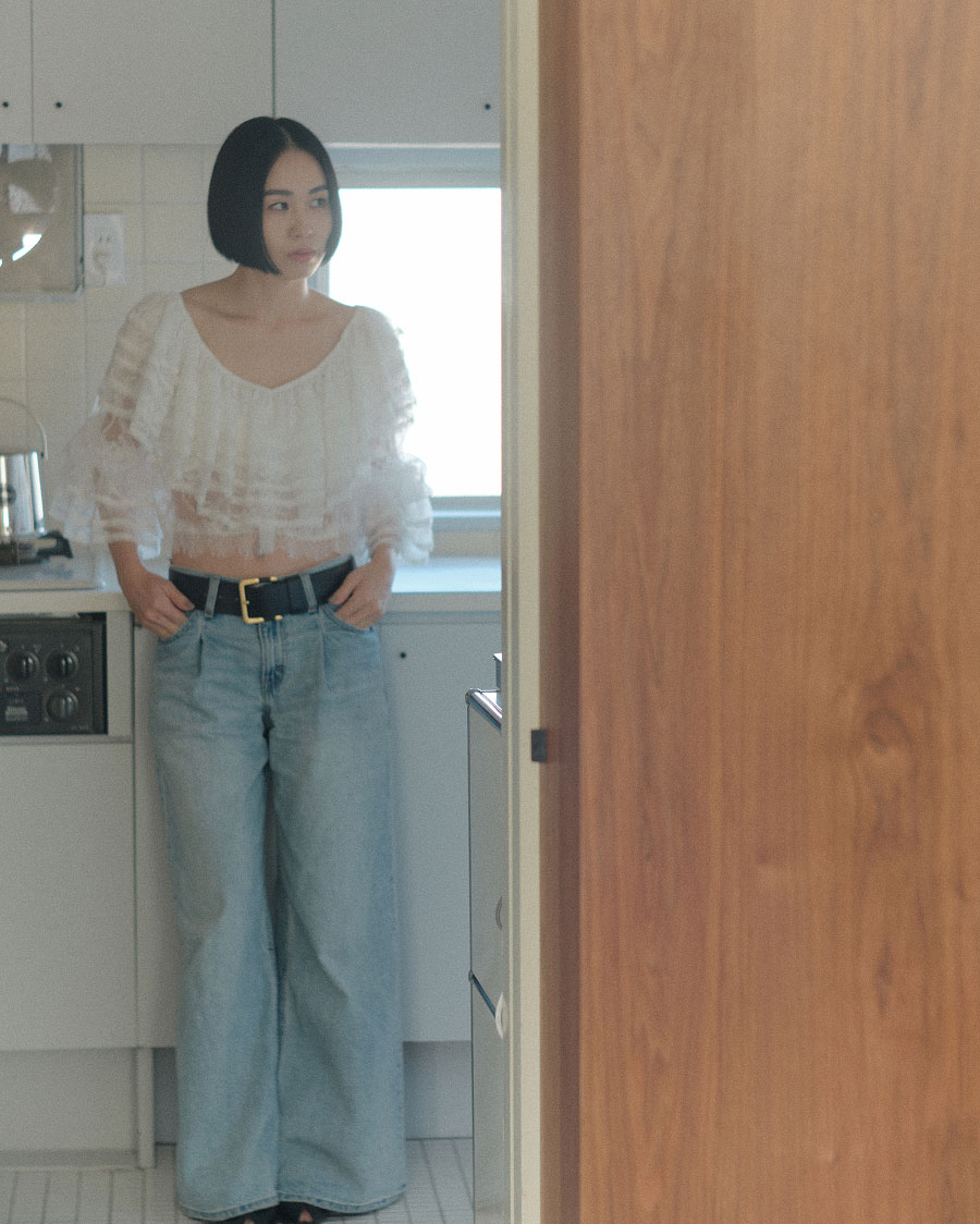 “1枚で存在感を出せるレースブラウス。ショート丈なのでハイウエストパンツと相性が良く、ベルトでウエストマークする着こなしがおすすめ。オフショルダーにもなるデザインなので、レイヤードが広がります”