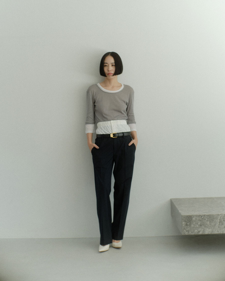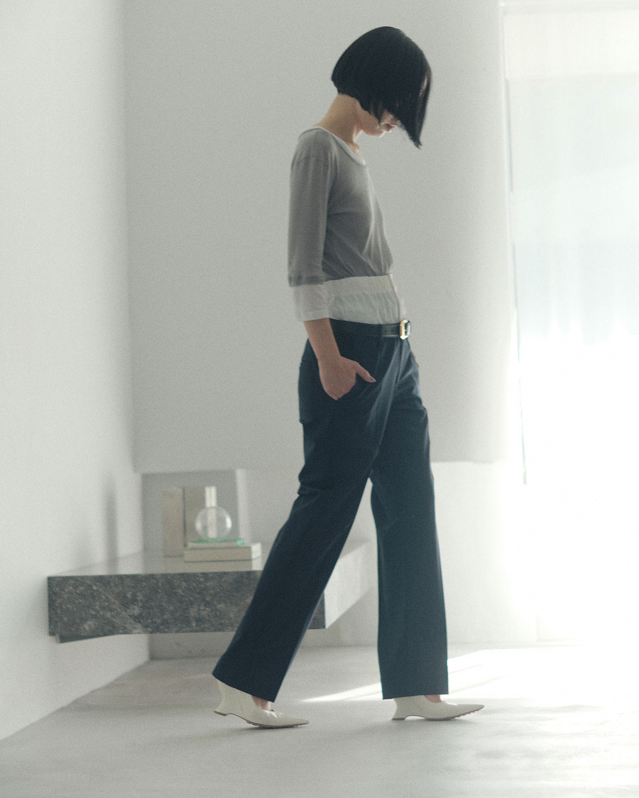 “JOURNAL STANDARDのお客様像を思い浮かべ、スポーティな素材を重ねたレイヤードパンツを作りました。シンプルなトップスを合わせるだけでキマり、パンツONパンツのスタイルが手軽に楽しめます”