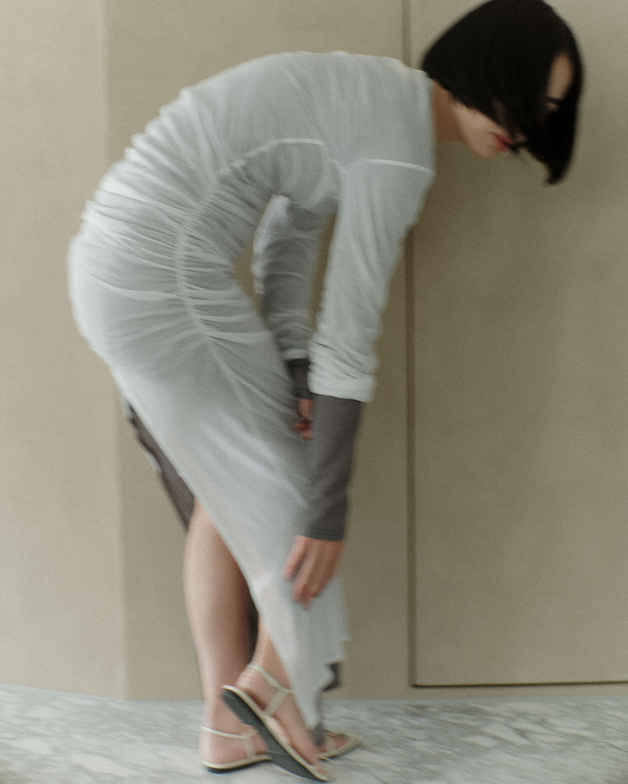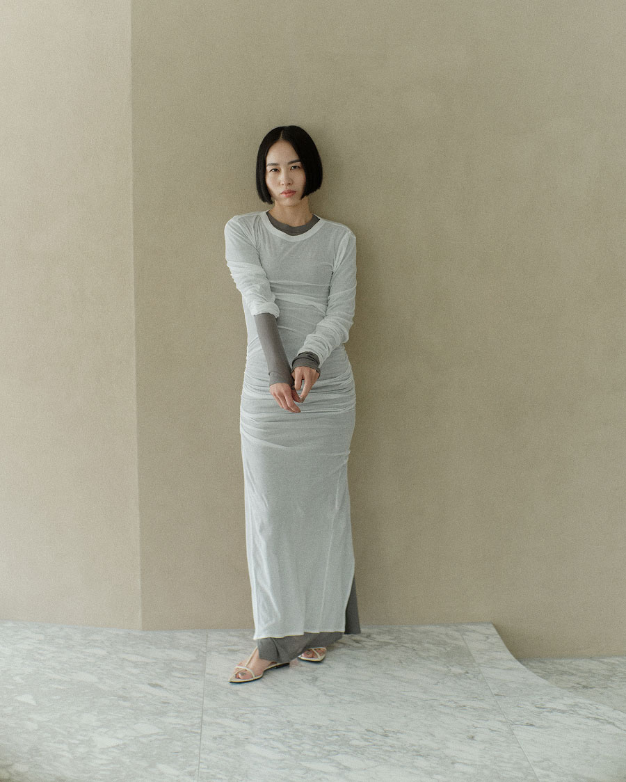 “肌触りがよく透け感のあるTシャツが好き。1枚でさらっと着られるカットソーワンピースを作りました。ウエストのギャザーや深めのバックスリットでスタイルアップも意識。ブルマやパンツとのレイヤードも楽しめます”