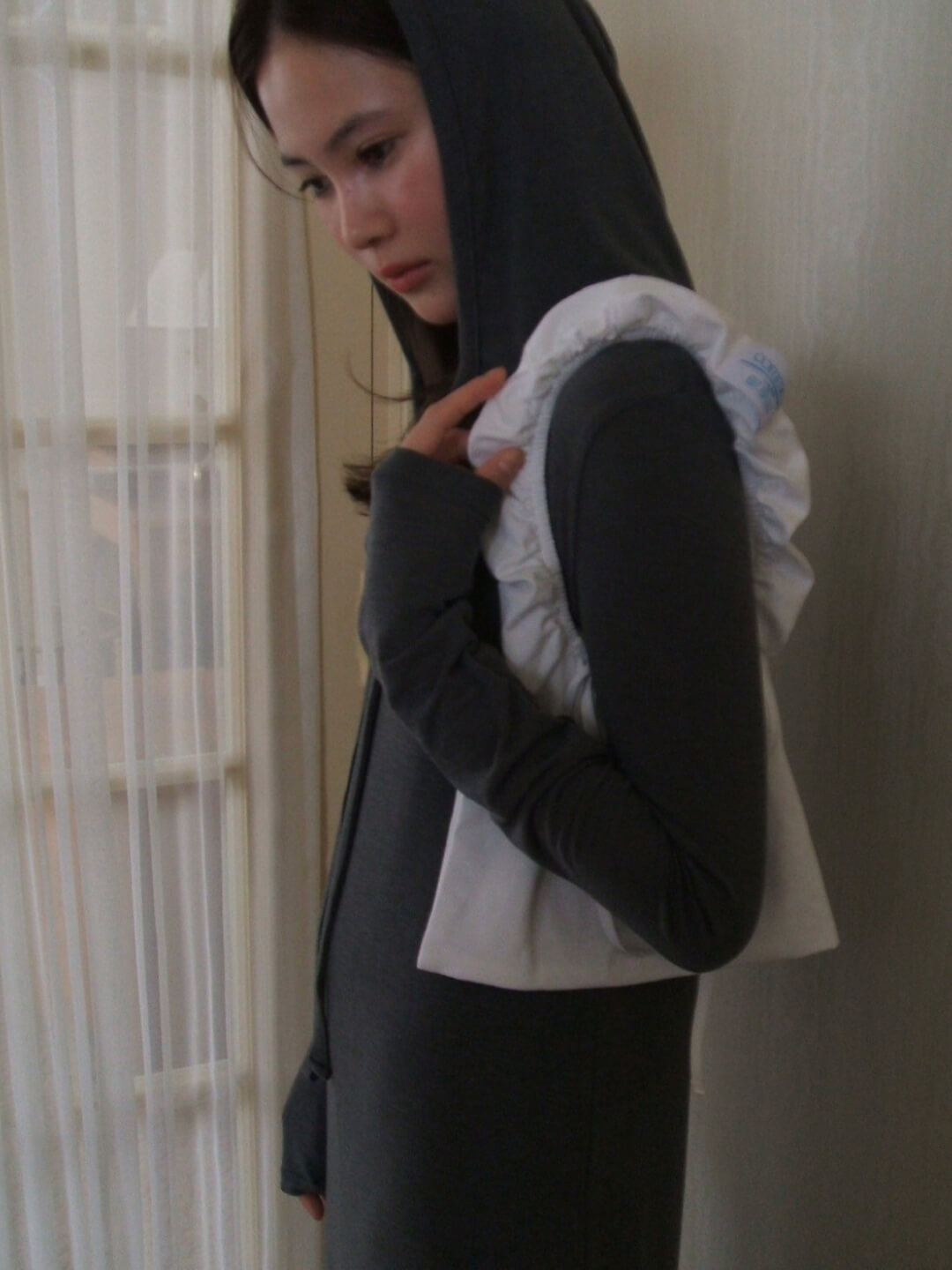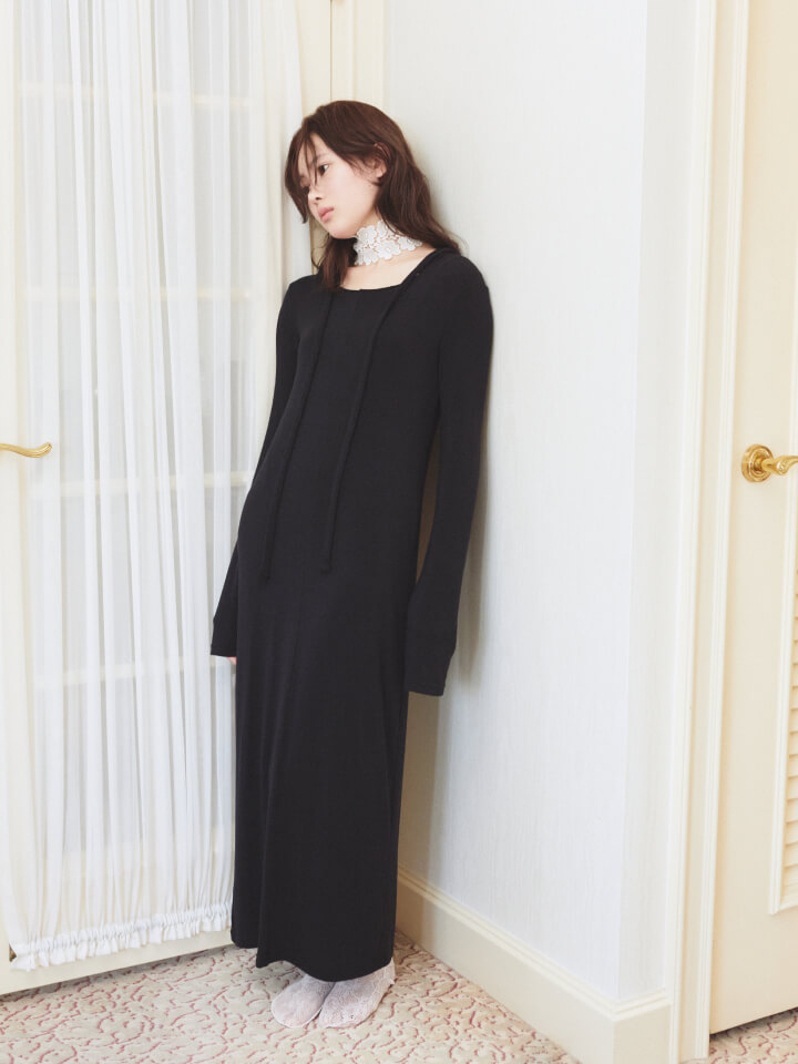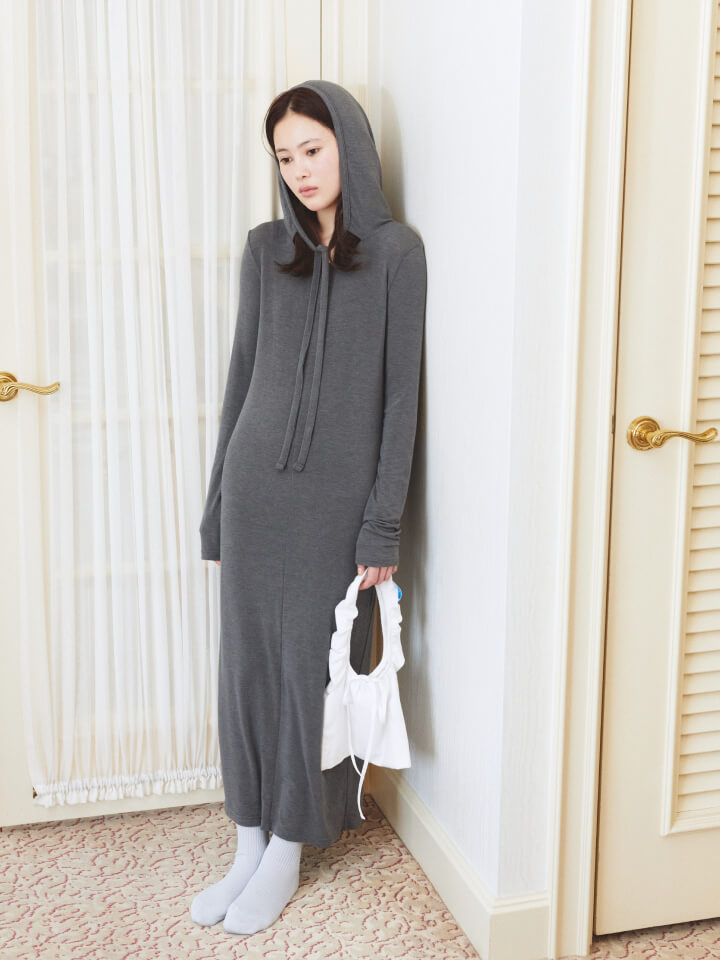 身体を預けるように着られるフーディワンピース。