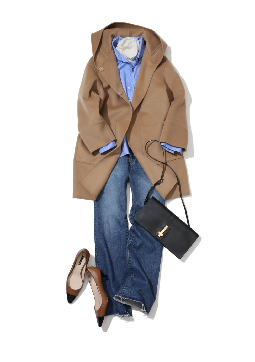 ワードローブに欠かせないオックスフォードシャツとデニム。いつだって着たい定番のアメトラスタイルだけれど、ちょっとマンネリ気味。今日のような秋の深まりを感じる日には、レイヤードとアウターにひと工夫して鮮度をアップしたい。白のタートルネックをインして、今年らしい首回りを演出。今年顔のリバー仕立てのフーデッドコートなら大人っぽく、オフィスにも◎。