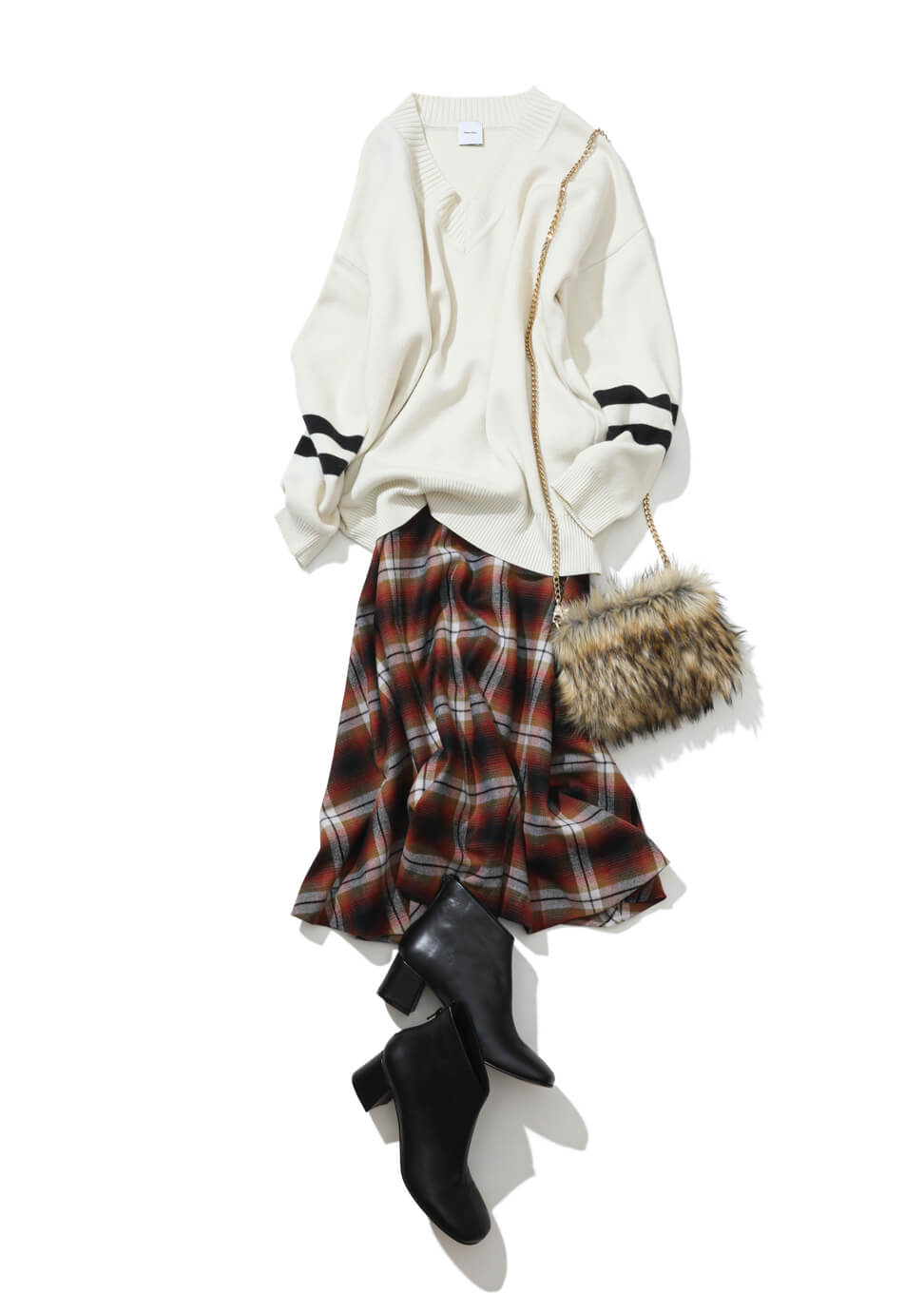 ライン入りのニットにチェックスカートを合わせて、気分はカレッジガール。こなれたオーバーサイジングやフィット&フレアのシルエットなど、落ち着いた女らしい雰囲気を漂わせるのがポイント。さらに、ファーのチェーンバッグで華やかさも盛って。シューズは、素足がチラ見えする程度のショートブーツがグッドバランス。