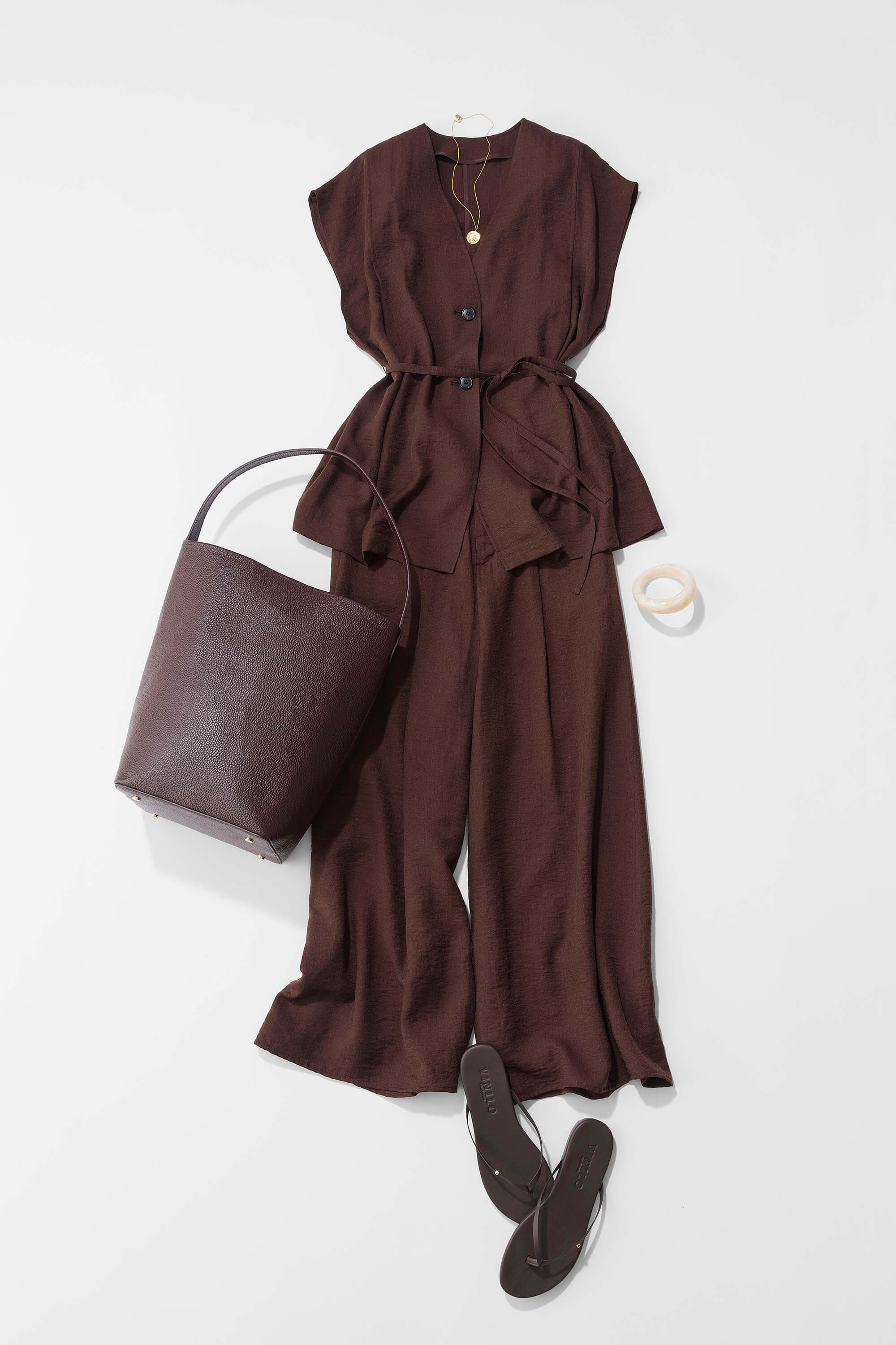 セットアップは、コーディネートが簡単に決まる時短アイテムのひとつ。沈みがちなブラウンもボルドーよりのカラーを選ぶと、女性らしくや柔らかな印象に見せてくれます。腕のカッティングや腰紐のデザインなど、体のラインを美しく見せるディテールも魅力的。セットで着るのはもちろん、上下ともに色んな着回しが楽しめるアイテムです。