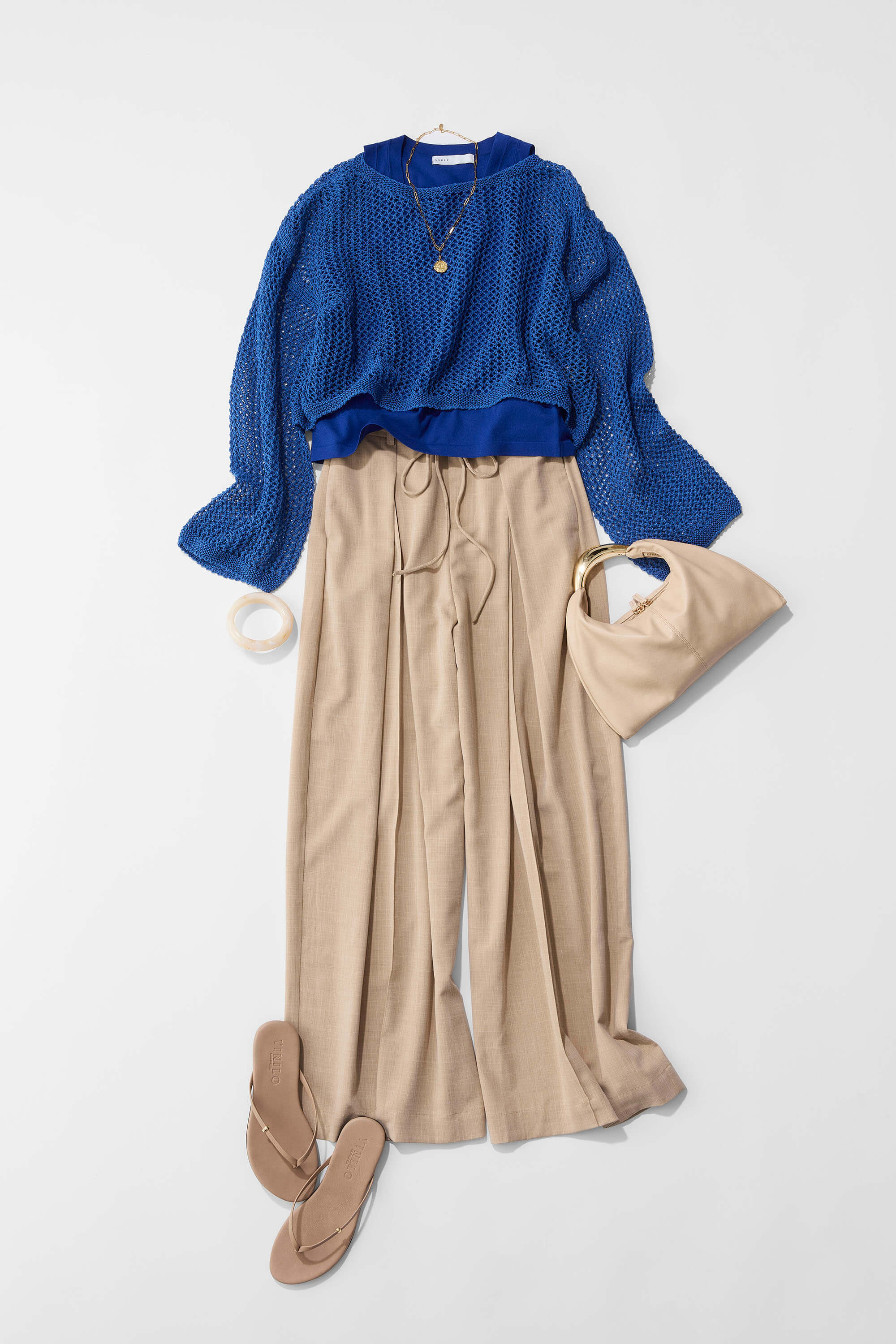 透け感のあるニットはインナー合わせを悩みがちなことも多々。そんな時は同系色を選ぶ事で、インナーが悪目立ちする事なく自然な印象になる為、こちらのアイテムはセット買いがおすすめです。短丈のニットにはタック入りのボリュームパンツなど、ウエスト部分にポイントのあるボトムス合わせがバランス良く着こなせます。