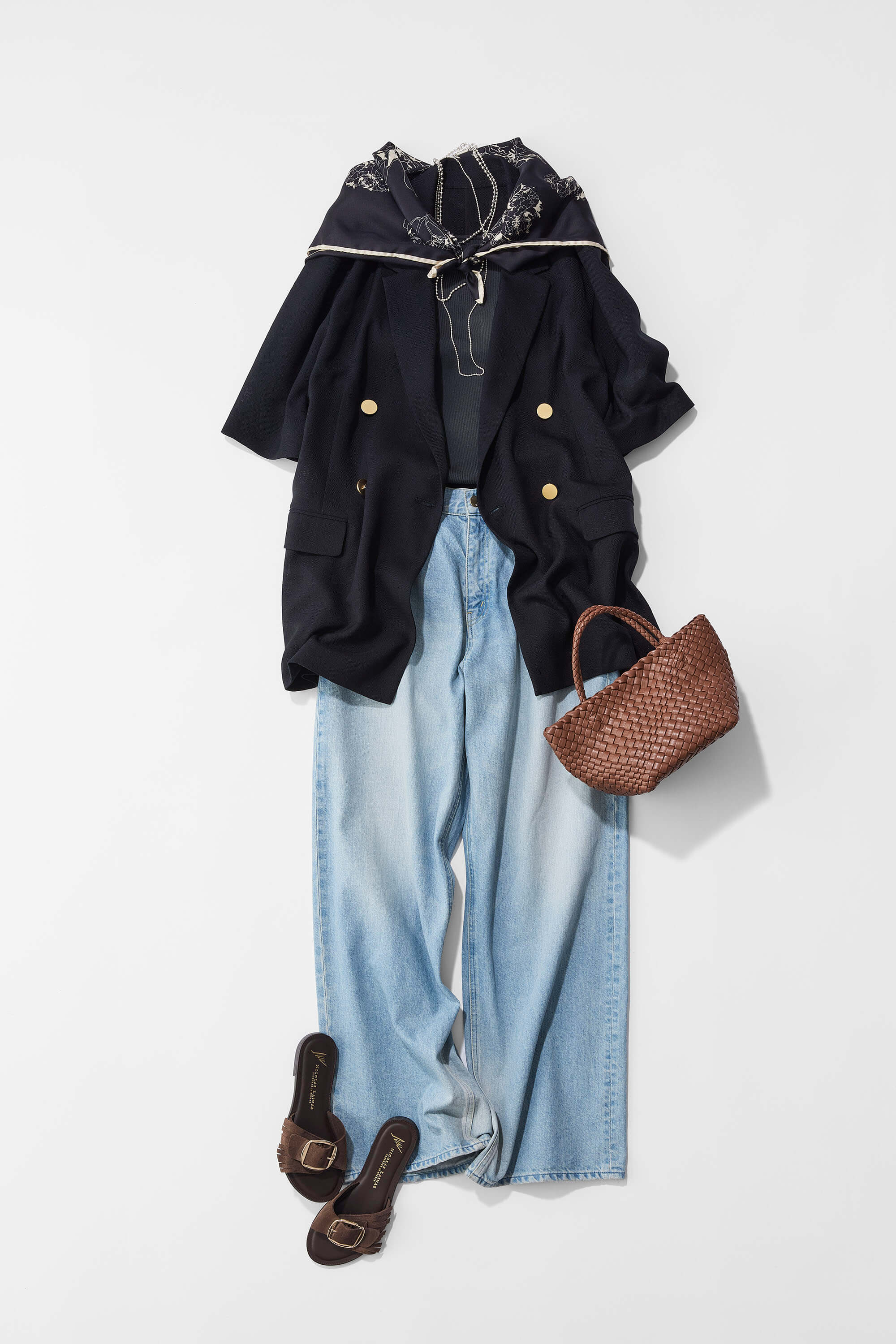見慣れてきたジャケットも、半袖になる事でイマドキでラフな見え方に早変わり。普段きれいめコーデがお好きな方でも、デニムに挑戦しやすくなるアイテムです。そのため、今回はラフな休日スタイルのイメージでご提案。首元にトレンドのスカーフとネックレスをオンするだけで、半袖の軽やかさがより一層楽しめます。