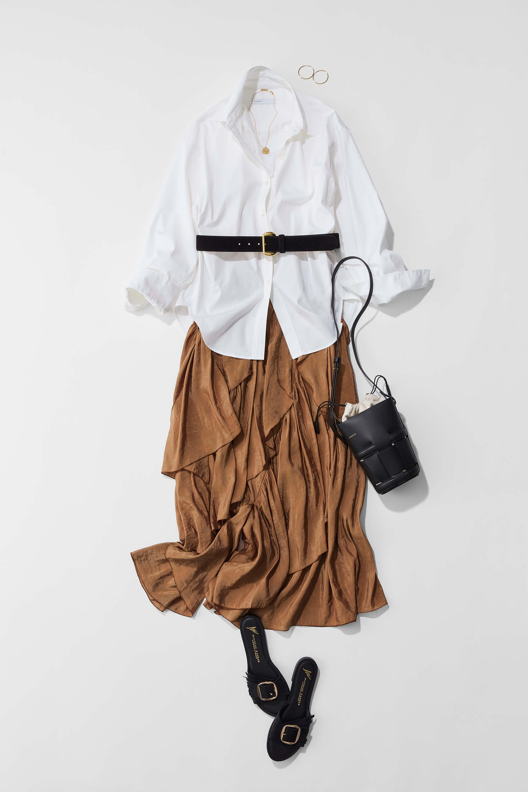 ボリュームのあるティアードスカートに、ビッグシルエットの白シャツをアウトで合わせたコーデ。シャツの上からベルトでウエストマークする事で、ふわりとしたシルエットにメリハリをプラスします。シャツはきれいに着るのではなく、袖をラフにたくし上げて抜け感のある着こなしに。足元にはフラットシューズを合わせ、リラックス感のある大人のカジュアルスタイルに仕上げます。